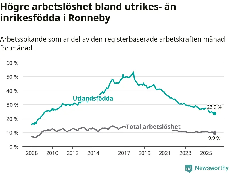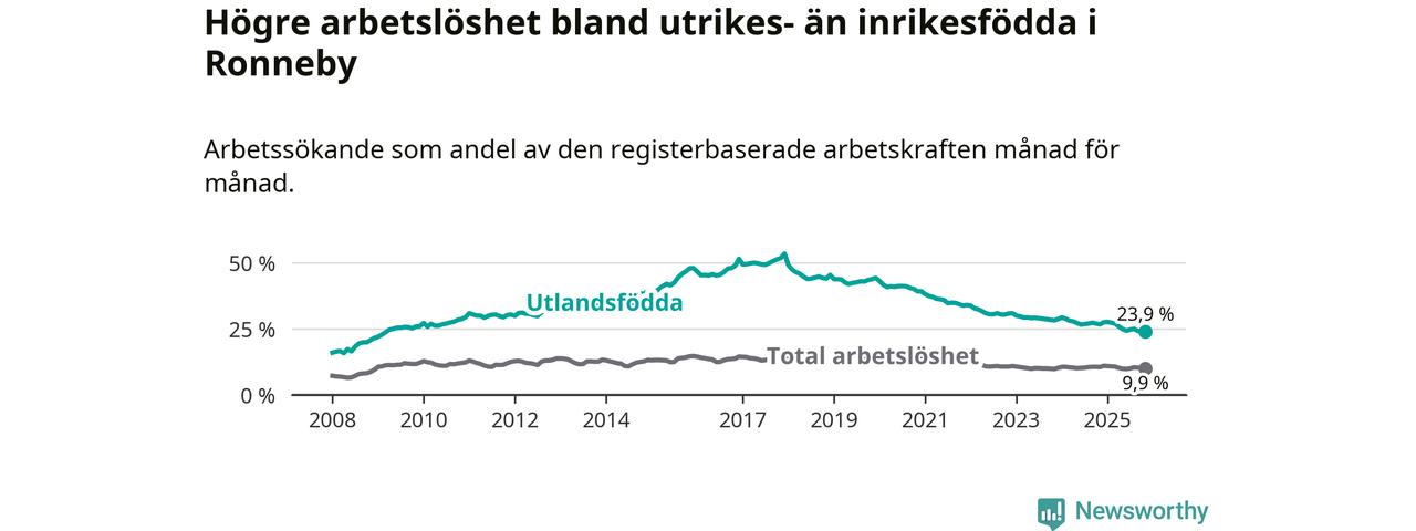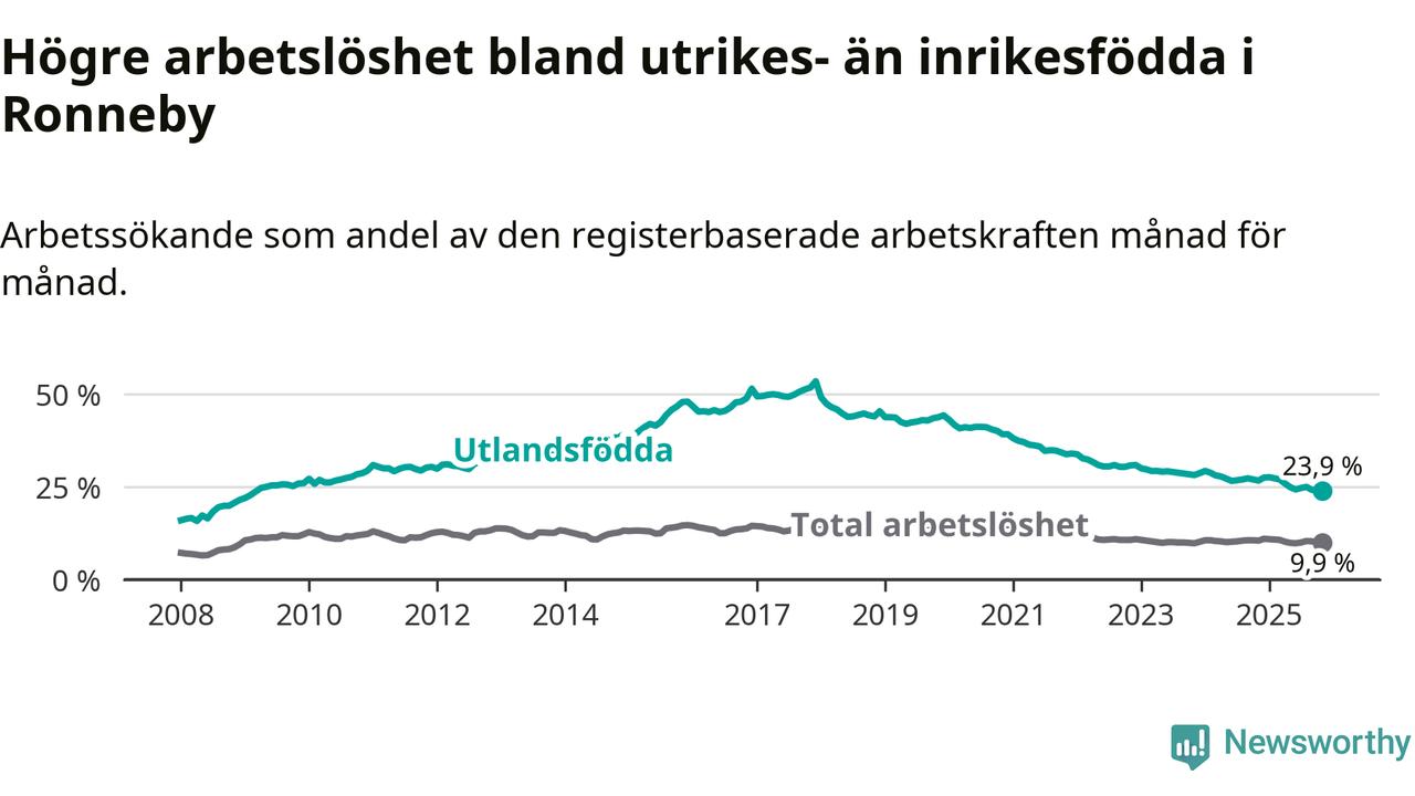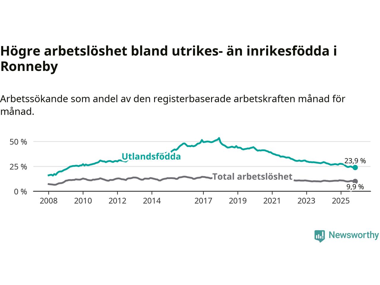 Skillnaden i arbetslöshet mellan utrikesfödda och hela befolkningen är 14,0 procentenheter i Ronneby. Det är en betydligt mindre skillnad än för ett år sedan (−2,2 procentenheter).