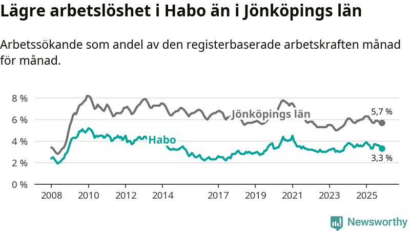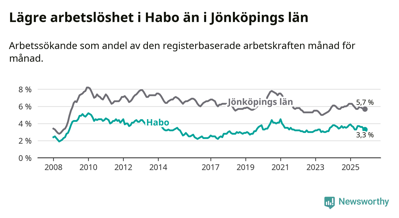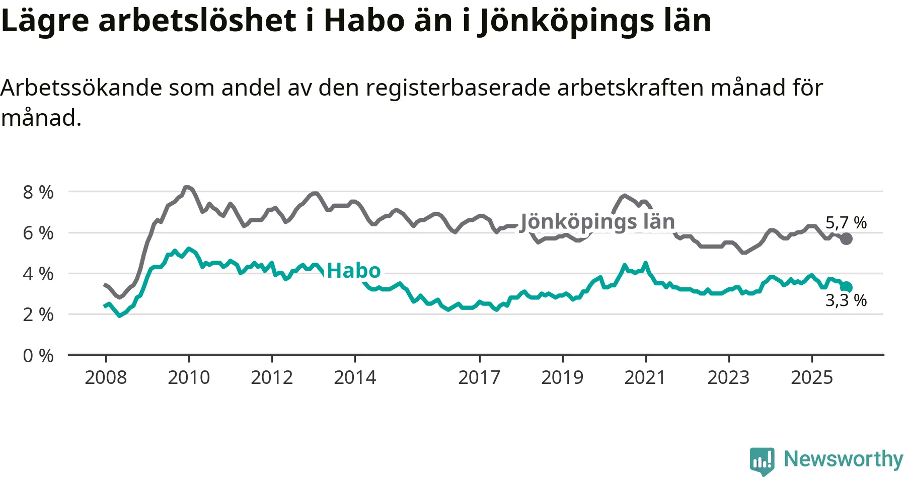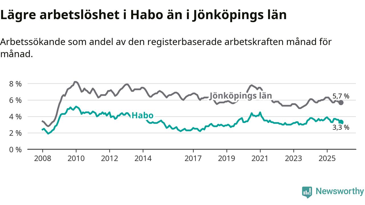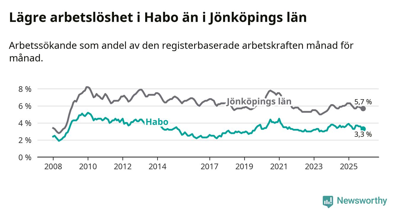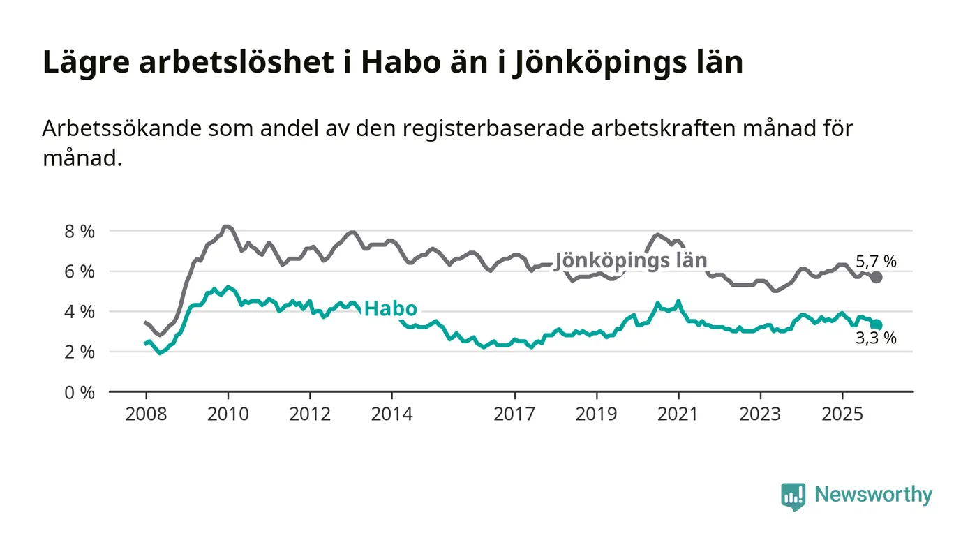 Habo hade redan tidigare lägre arbetslöshet än snittet i hela Jönköpings län och nu växer klyftan (3,3 procent i kommunen, jämfört med 5,7 procent i hela länet). Habo har därmed även den lägsta arbetslöshetsnivån i länet. Nässjö har den högsta (7,6 procent).