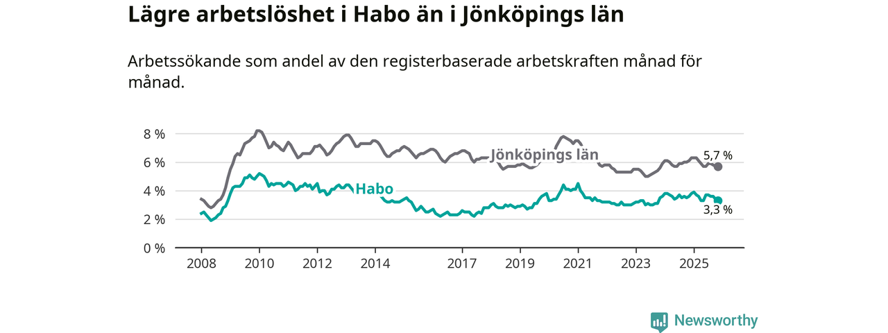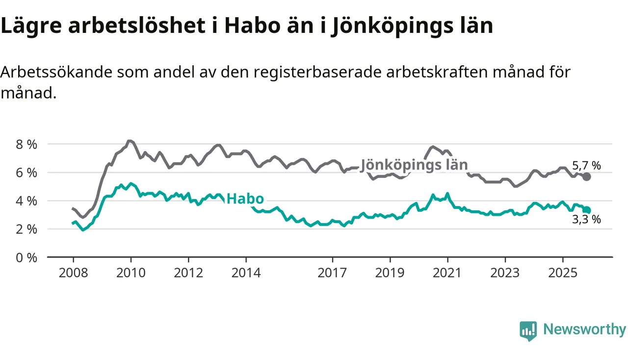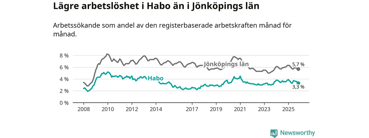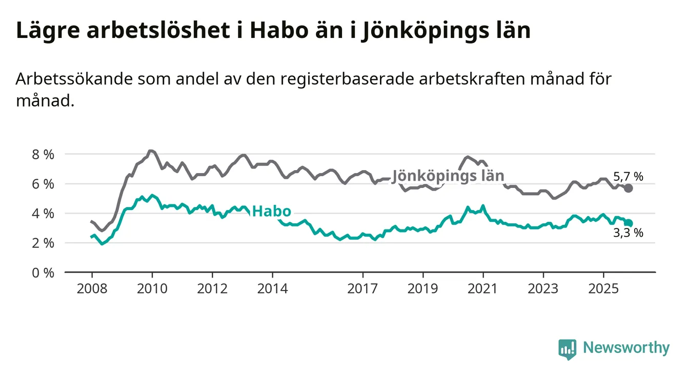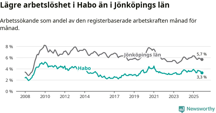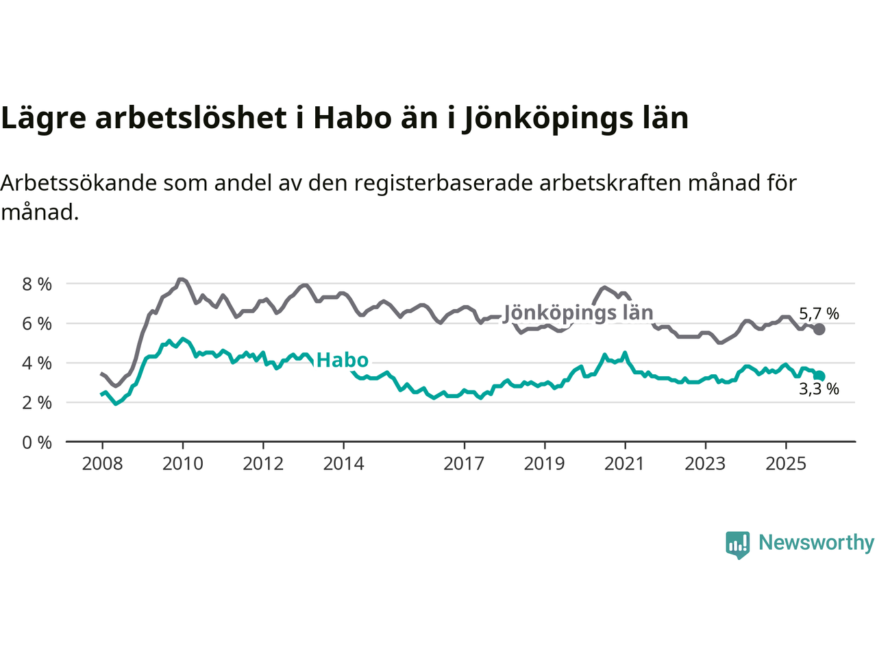 Under november månad rapporterade Habo kommun en total arbetslöshet på 3,3 procent. Det är en minskning jämfört med samma tidpunkt i fjol (−0,3 procentenheter). Även i Jönköpings län sjunker arbetslösheten .