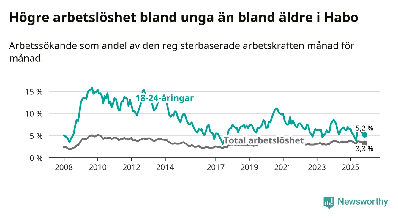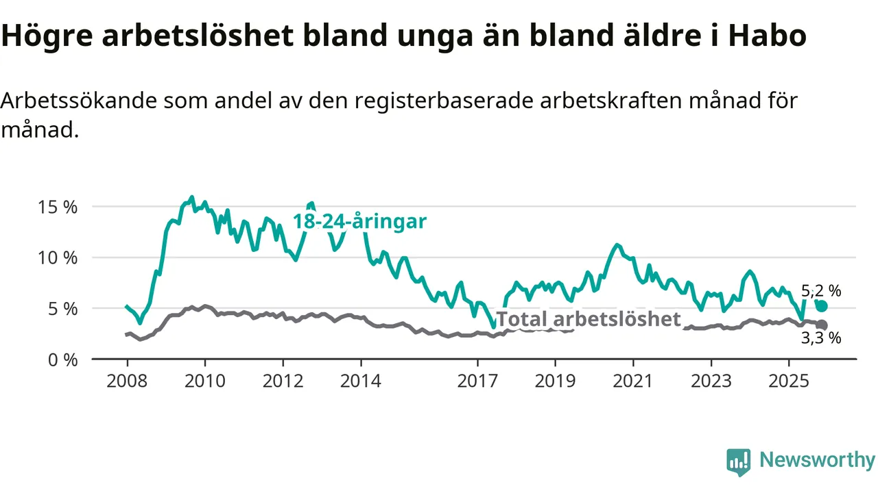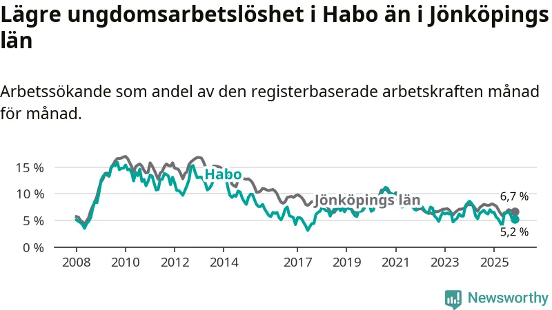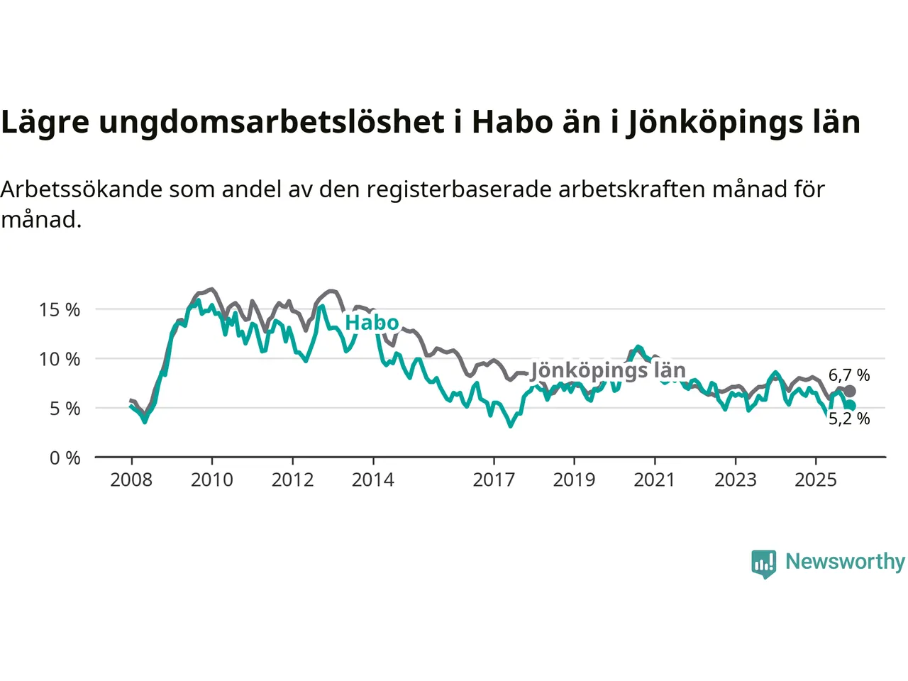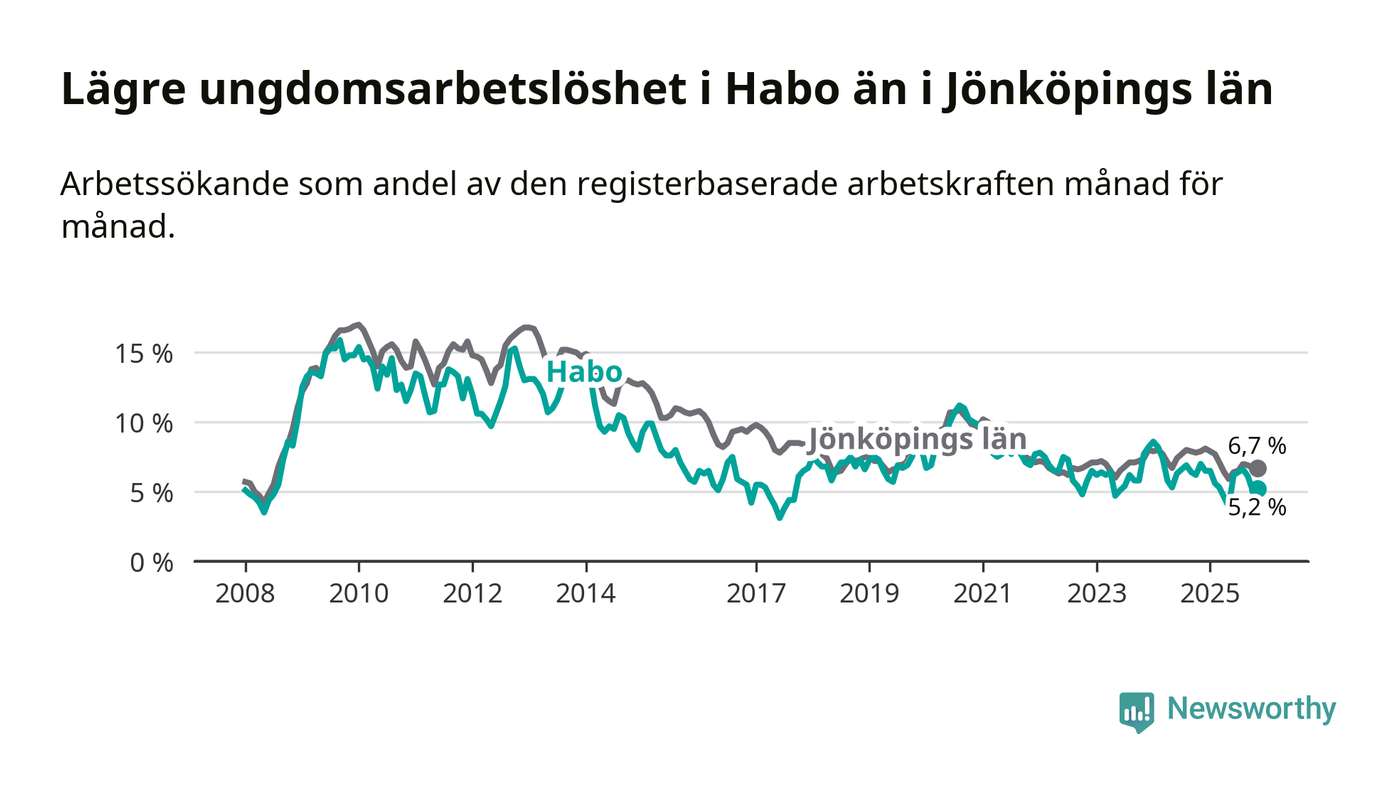 I och med den senaste månadens nedgång har de ungas arbetslöshet i Habo sjunkit 13 månader i följd (ner från 6,2 procent i oktober 2024 till 5,2 procent nu).