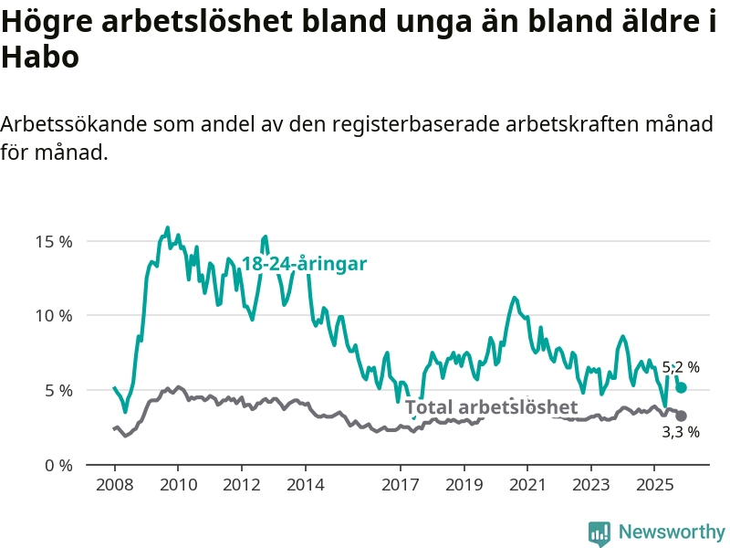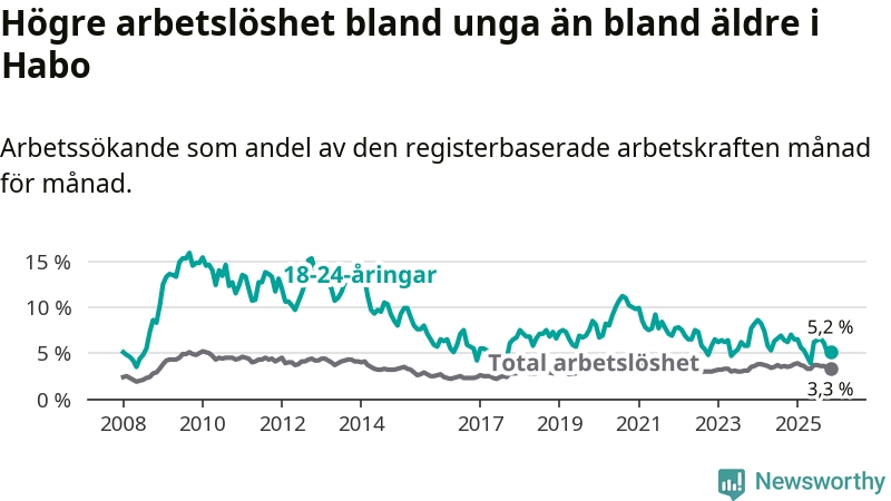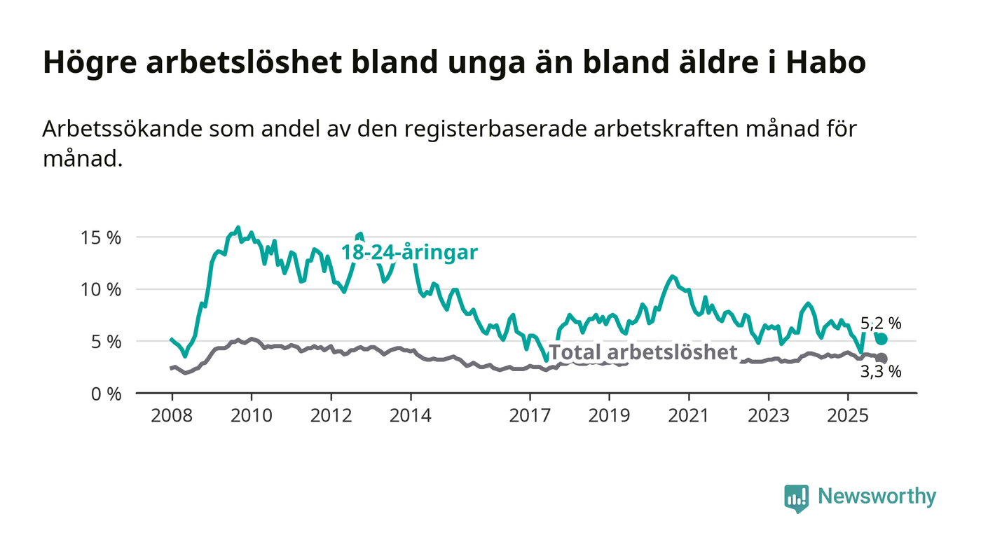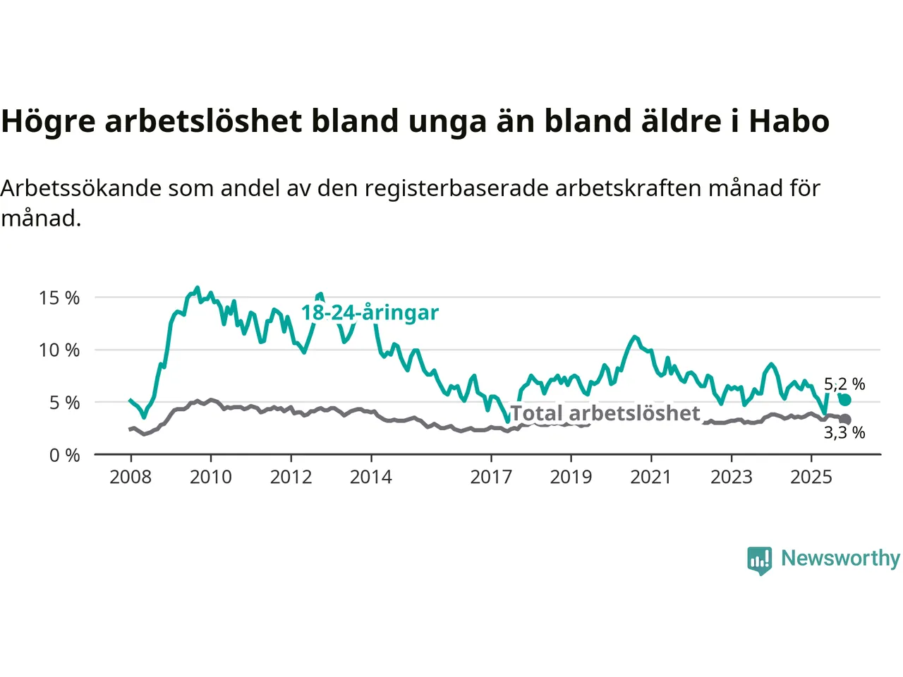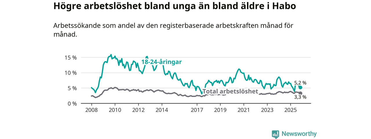 I och med den senaste månadens nedgång har de ungas arbetslöshet i Habo sjunkit 13 månader i följd (ner från 6,2 procent i oktober 2024 till 5,2 procent nu).