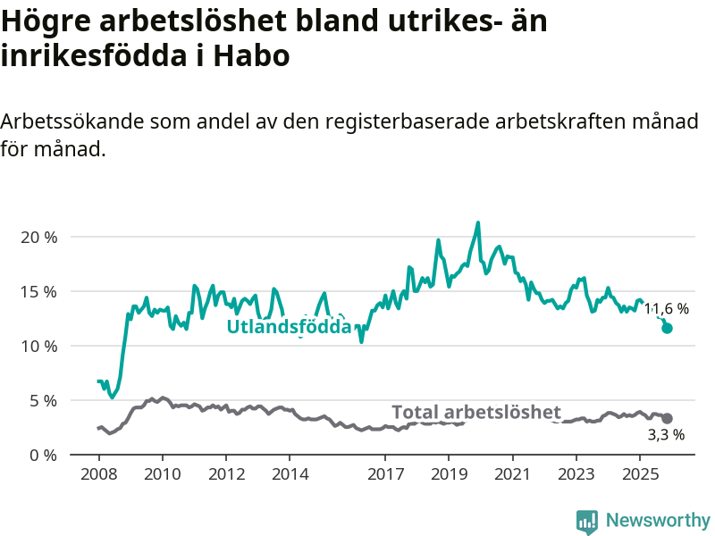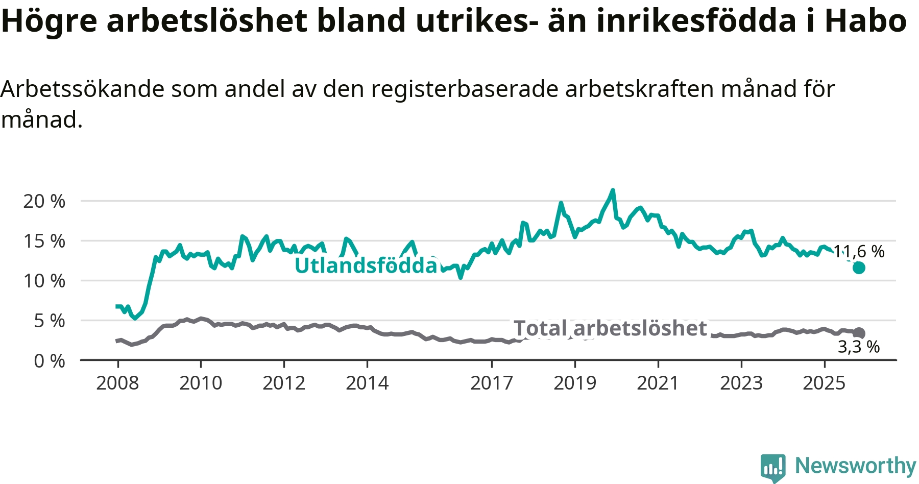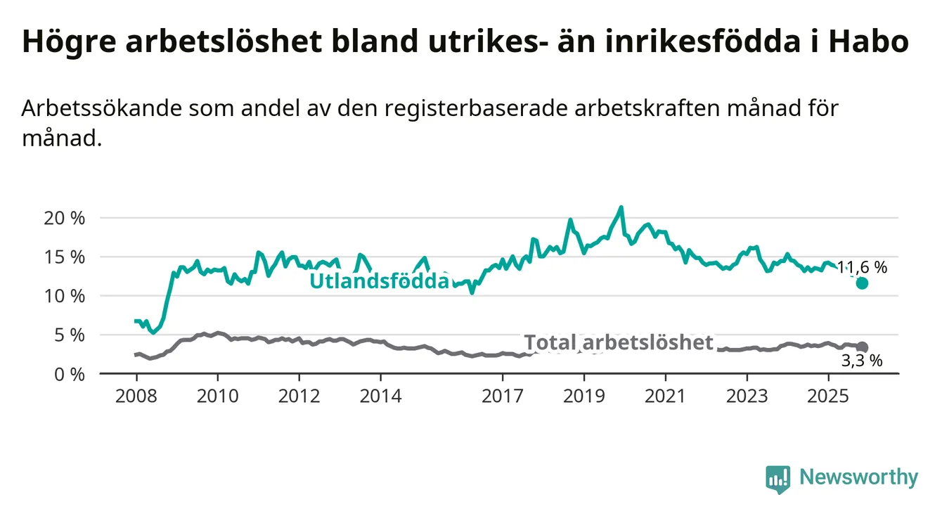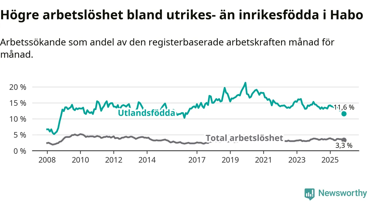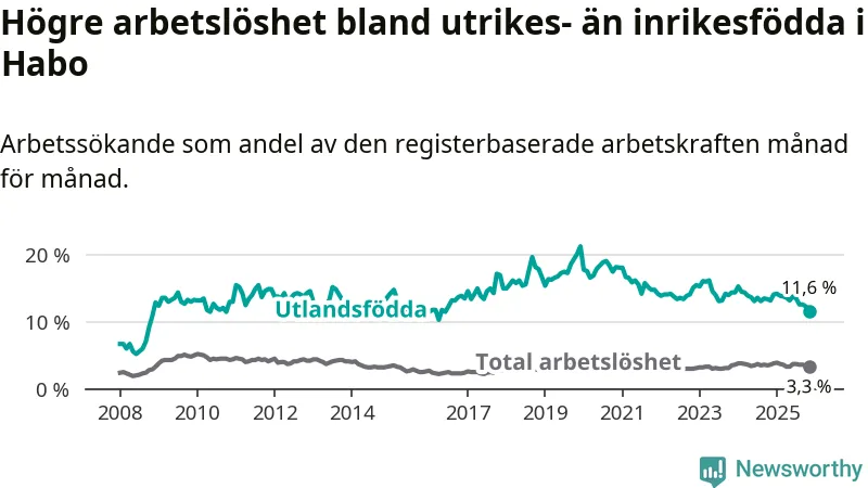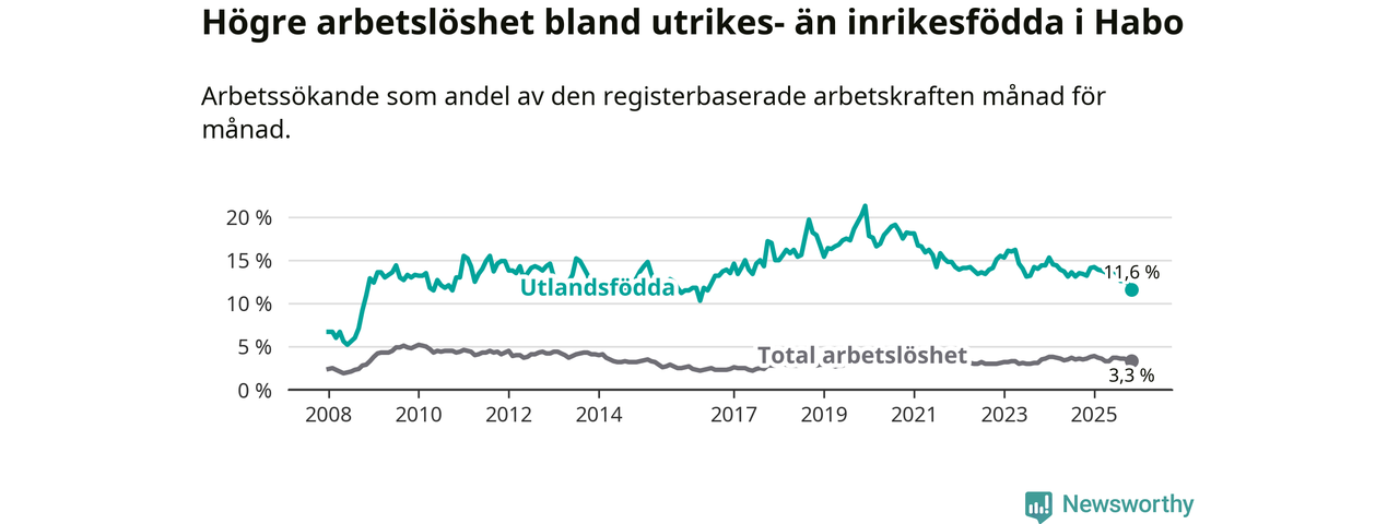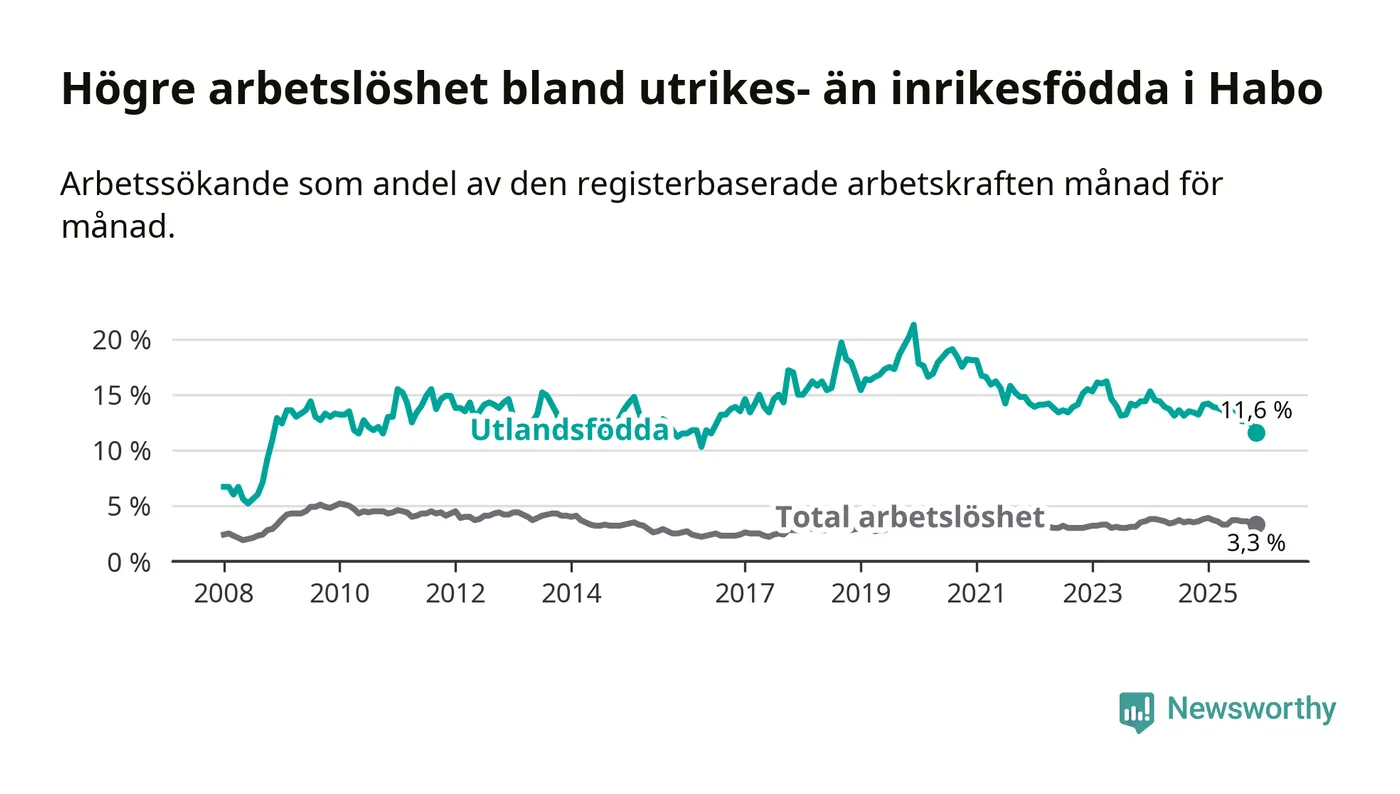 Skillnaden i arbetslöshet mellan utrikesfödda och hela befolkningen är 8,3 procentenheter i Habo. Det är en mindre skillnad än för ett år sedan (−1,3 procentenheter).