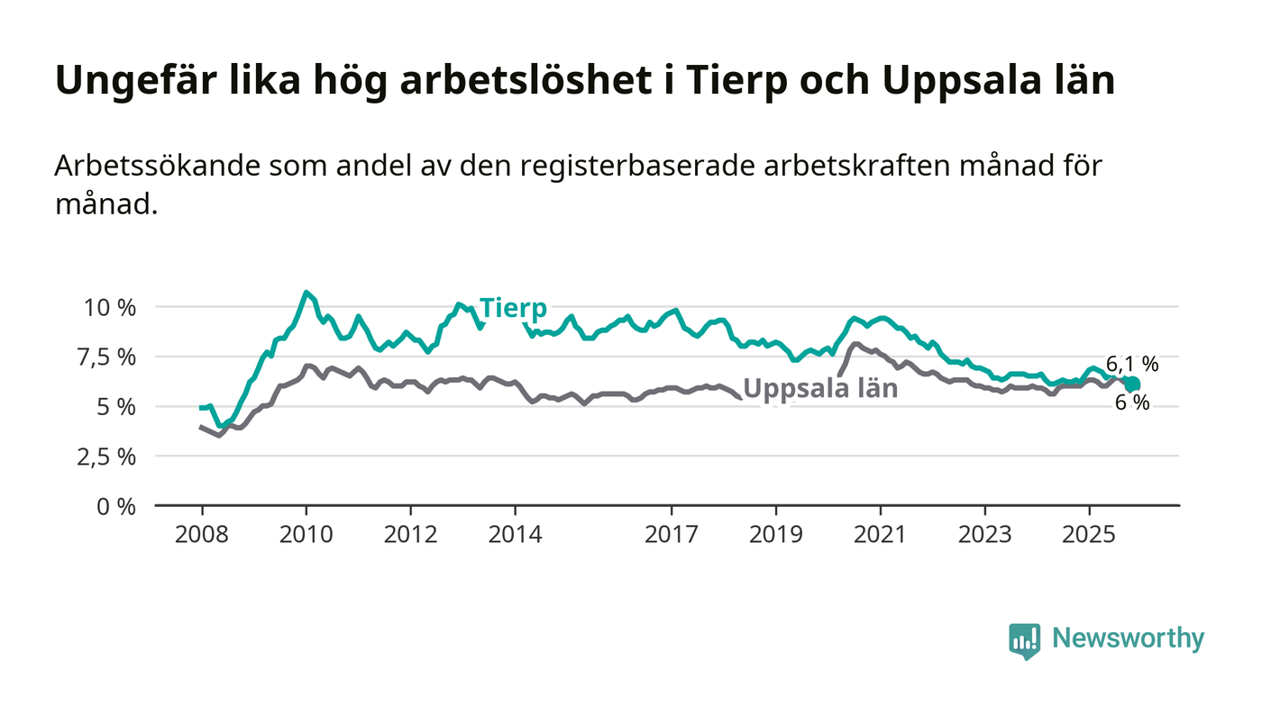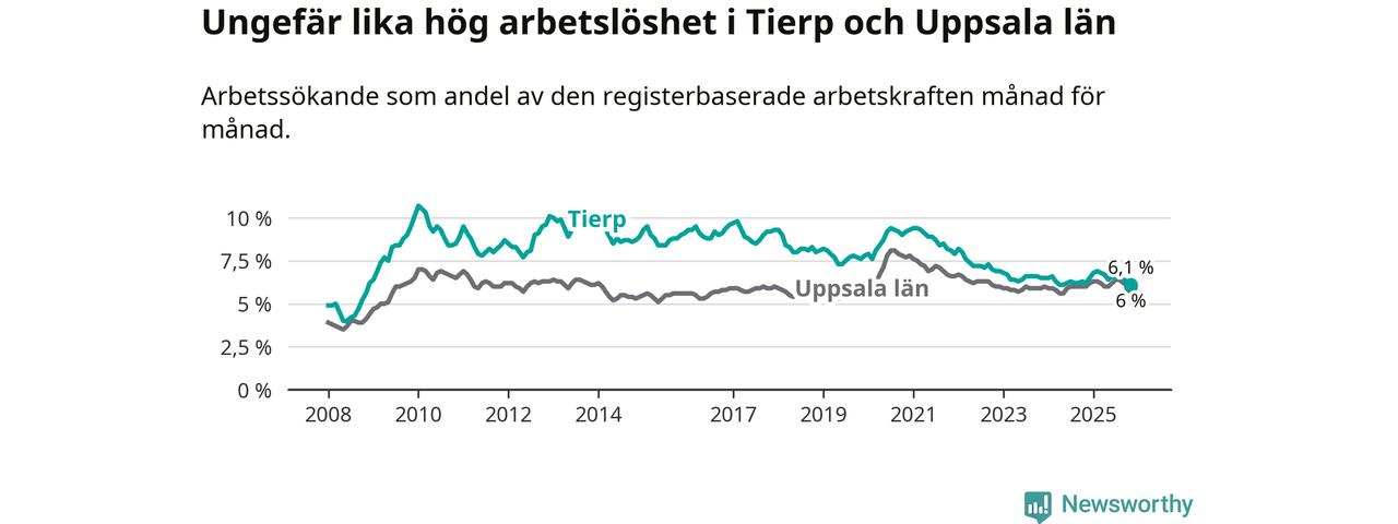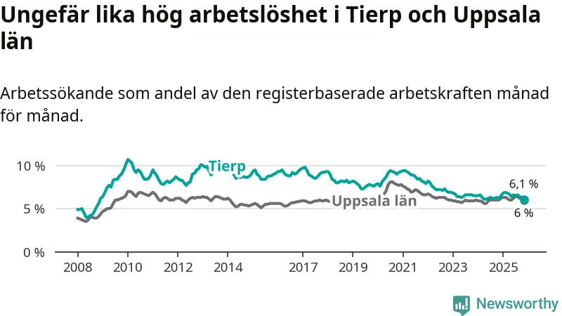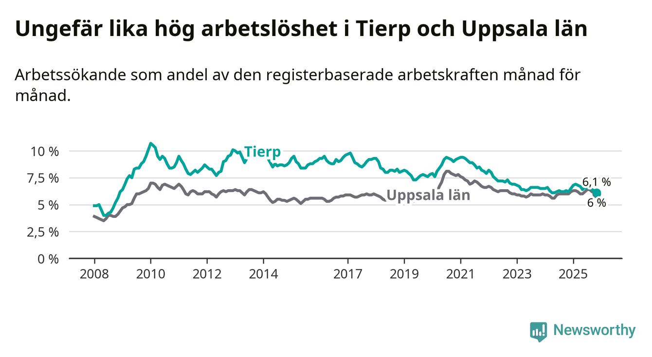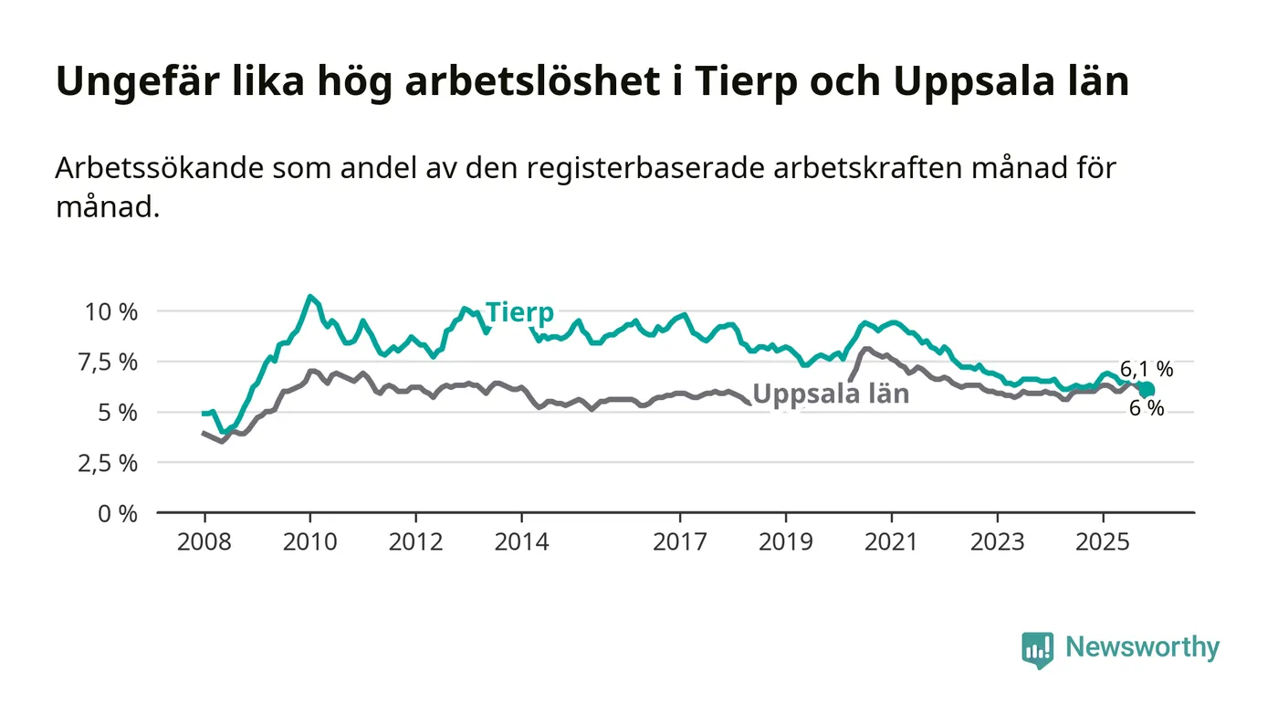 Under november månad rapporterade Tierps kommun en total arbetslöshet på 6,1 procent. Det är en minskning jämfört med samma tidpunkt i fjol (−0,1 procentenheter). I Uppsala län däremot står arbetslösheten stilla.