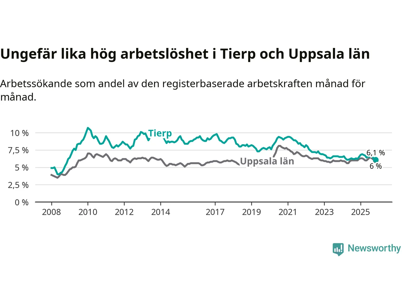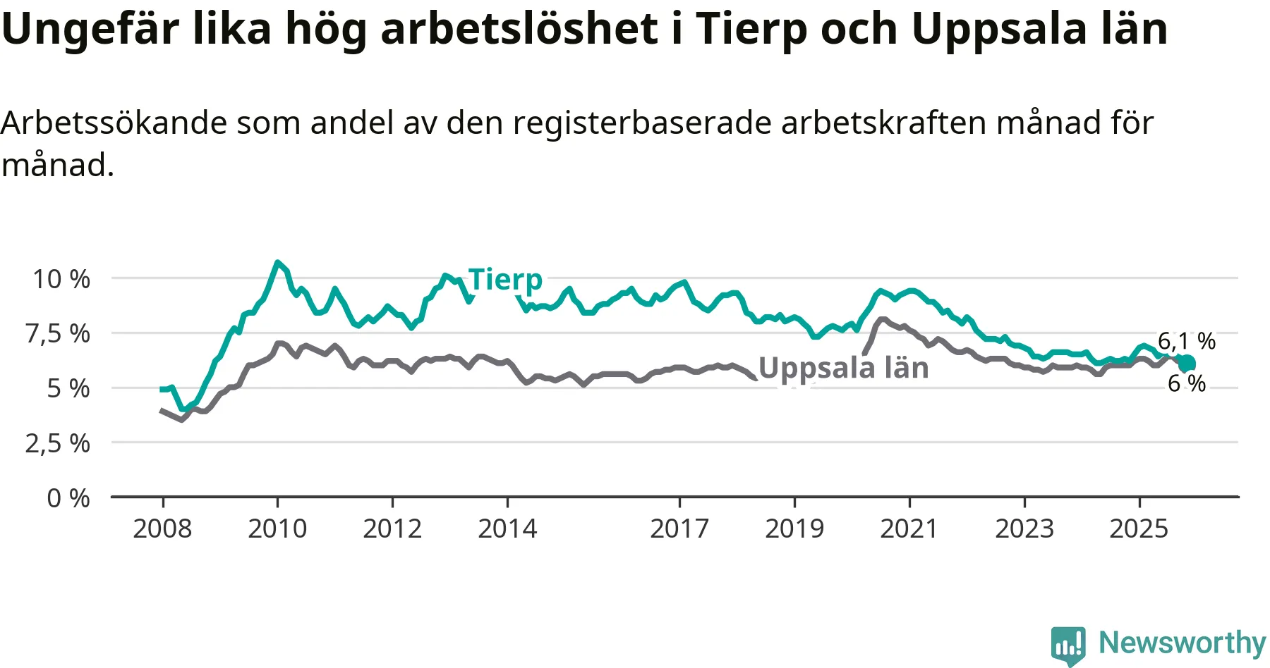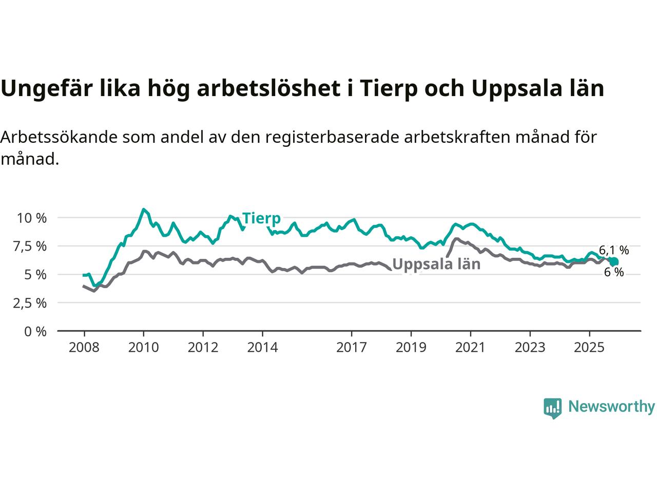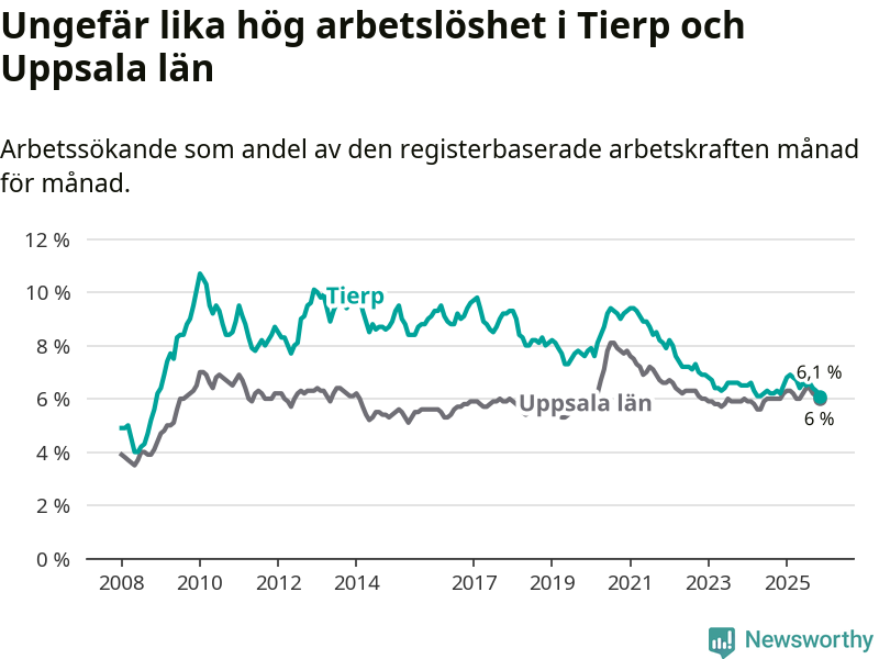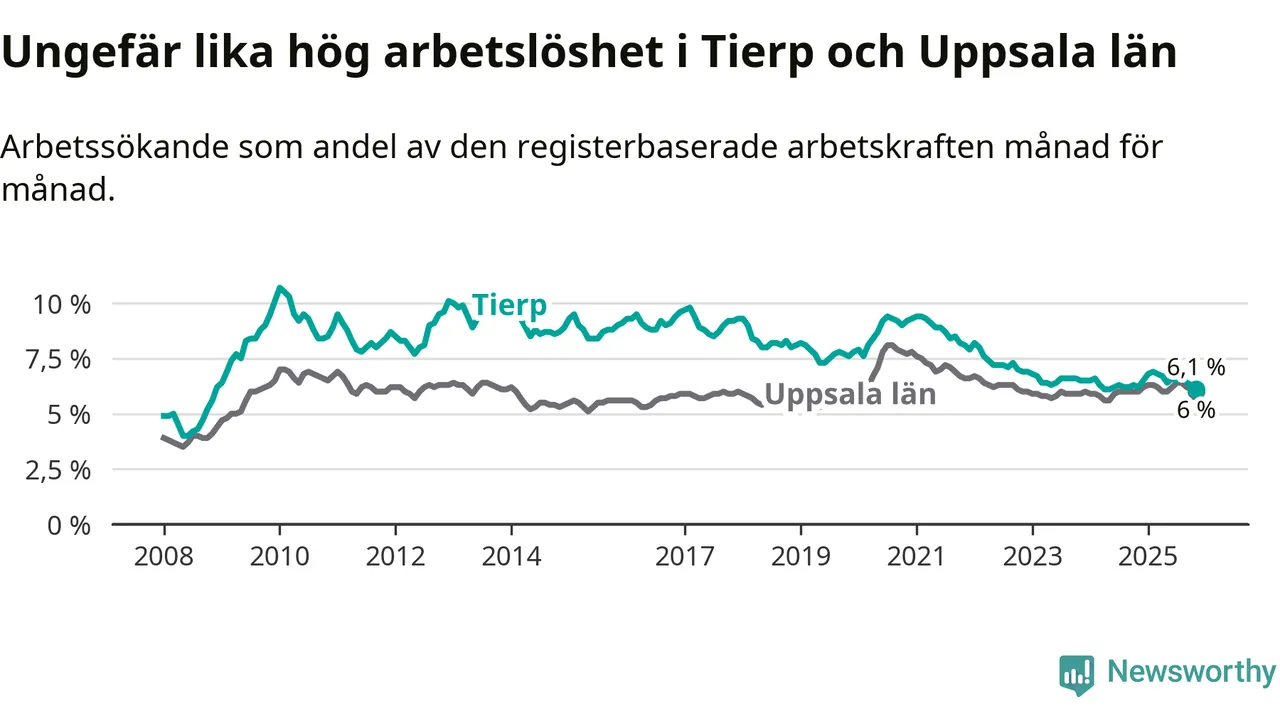 Under november månad rapporterade Tierps kommun en total arbetslöshet på 6,1 procent. Det är en minskning jämfört med samma tidpunkt i fjol (−0,1 procentenheter). I Uppsala län däremot står arbetslösheten stilla.