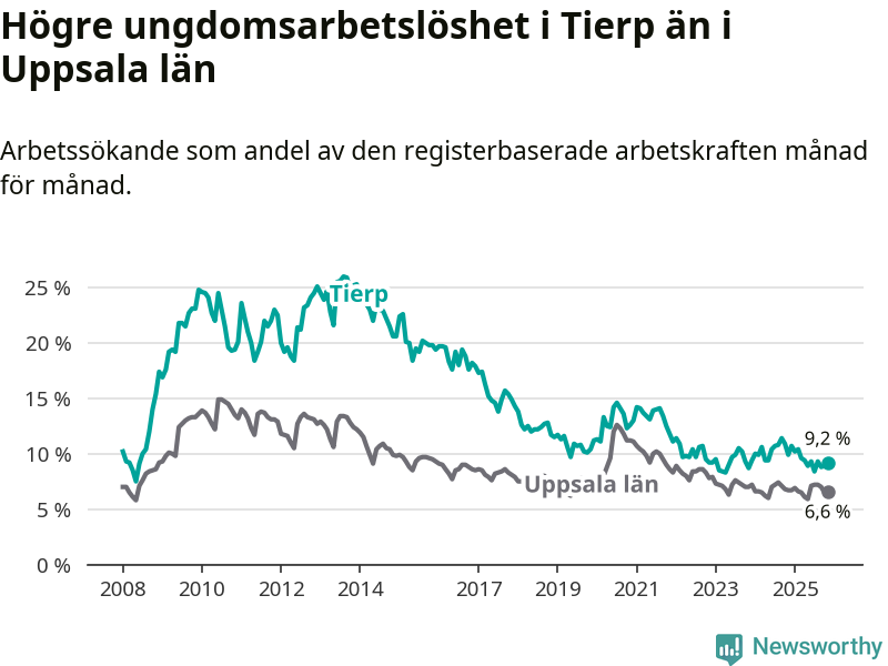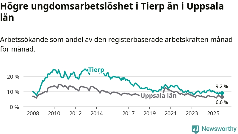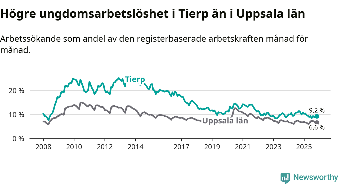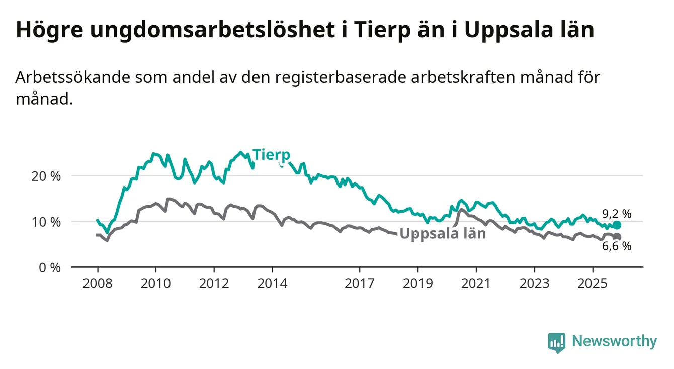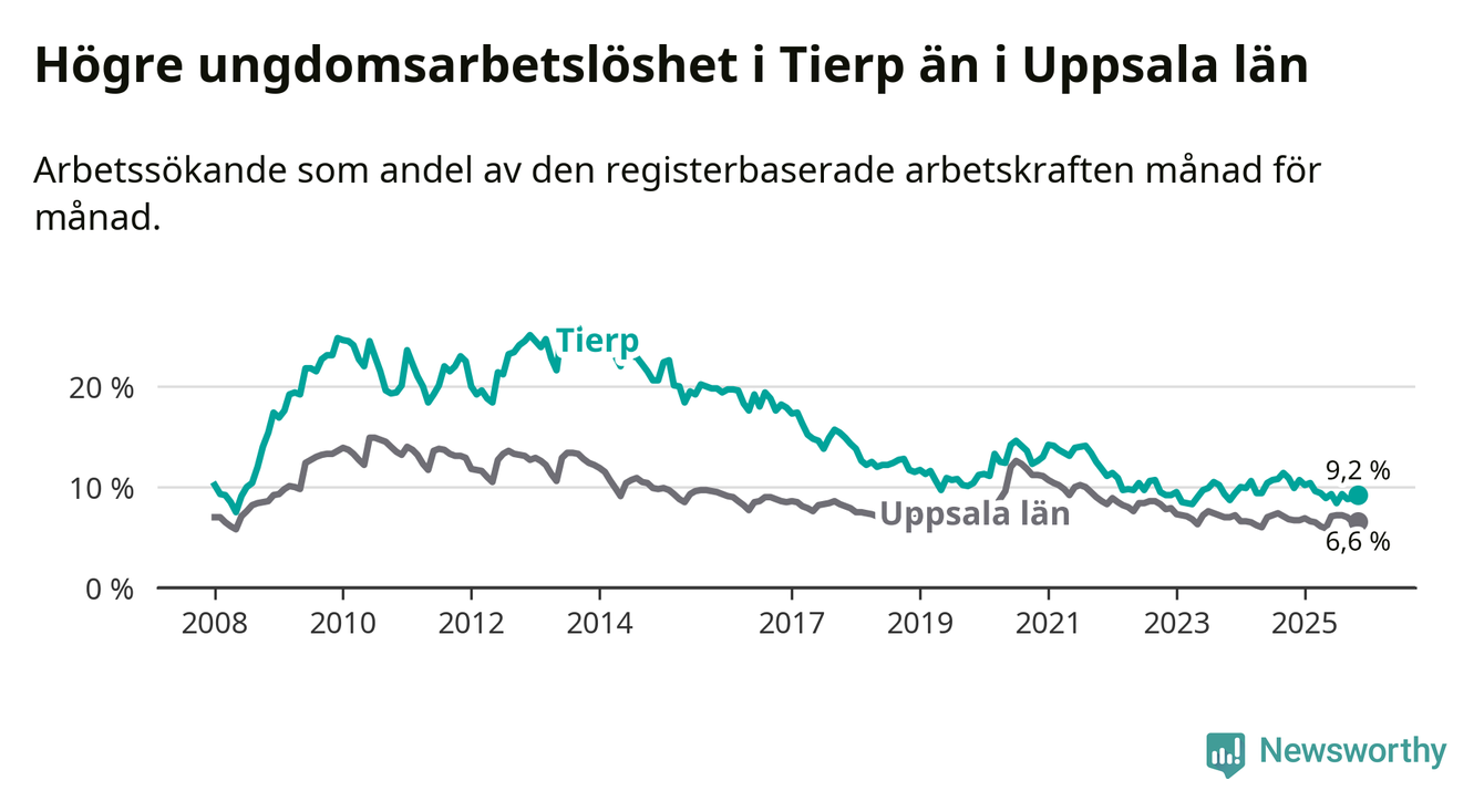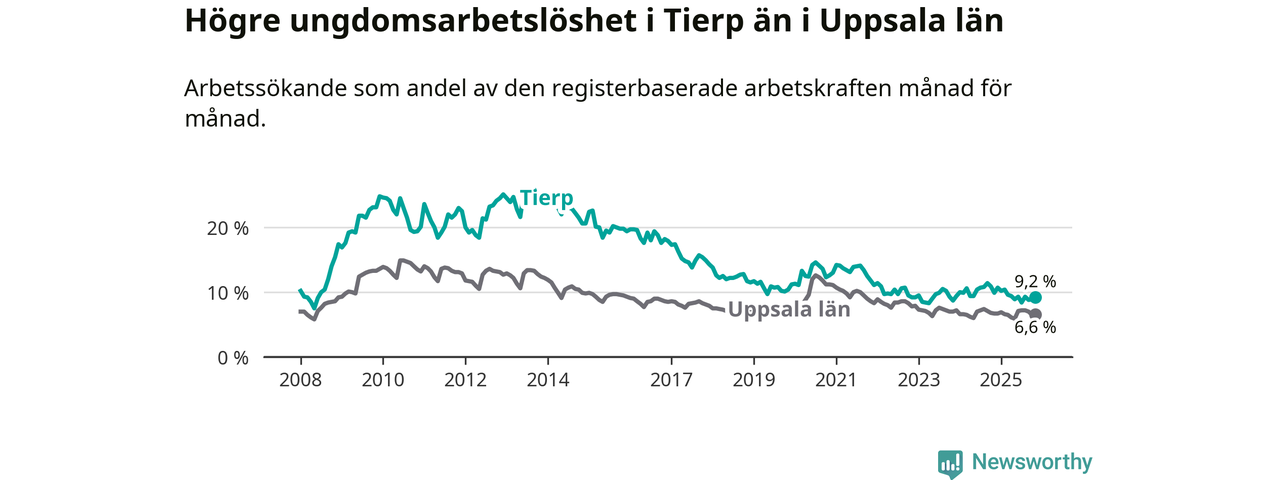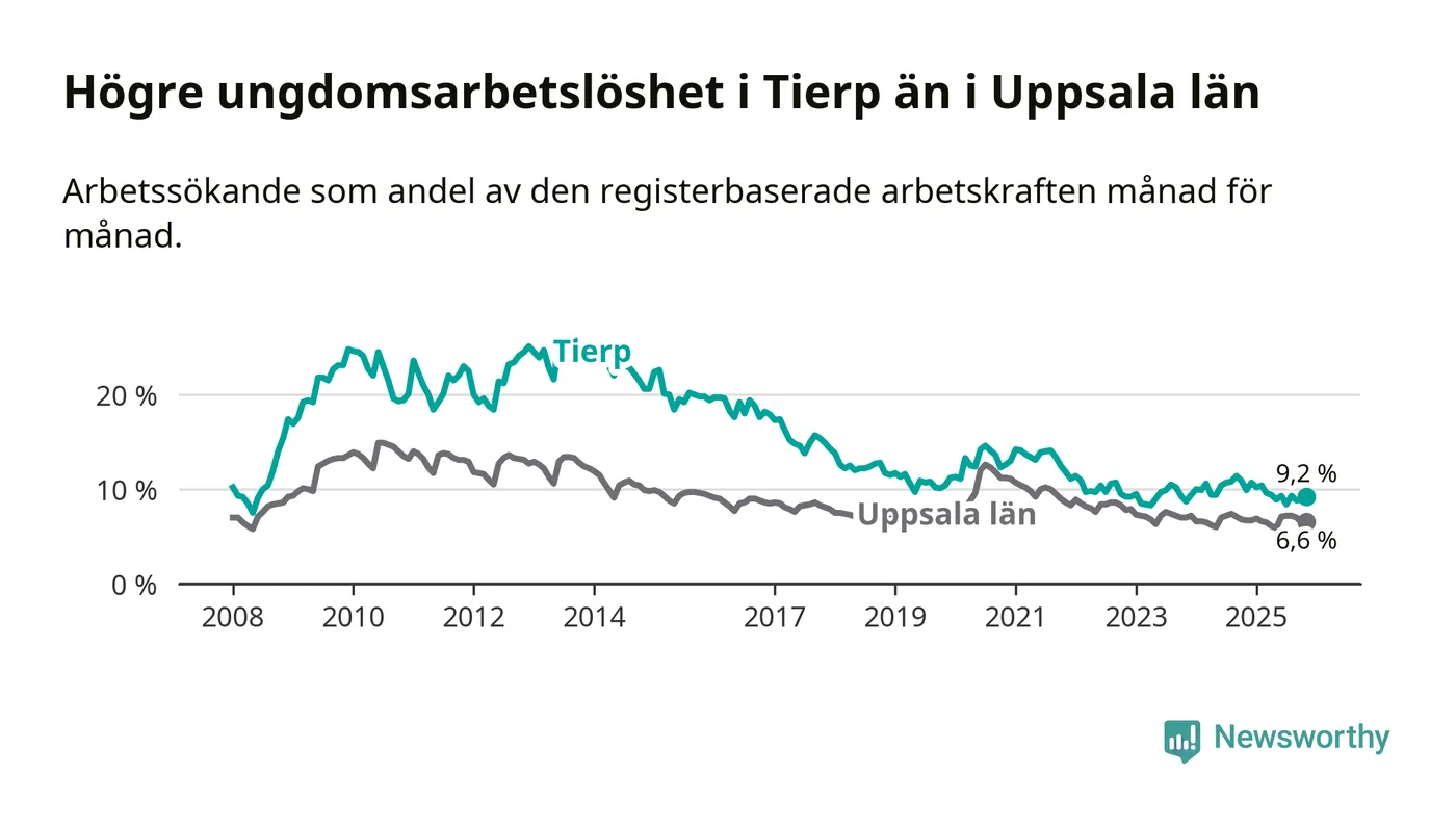 Medan Tierp har ungefär samma total arbetslöshet som Uppsala, ligger ungdomsarbetslösheten 2,6 procentenheter högre i Tierp.