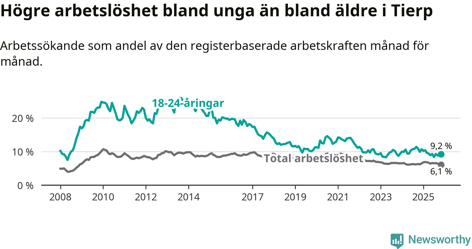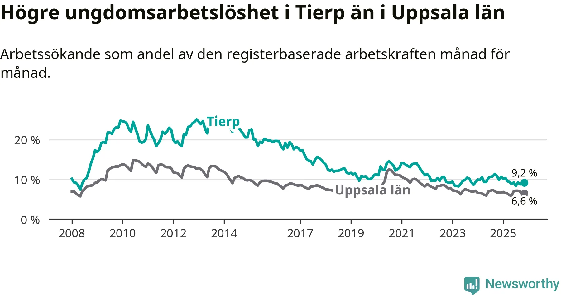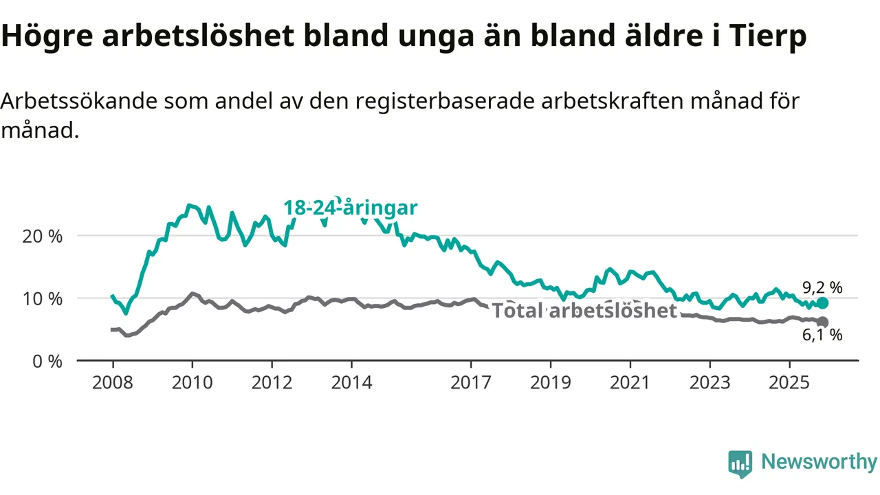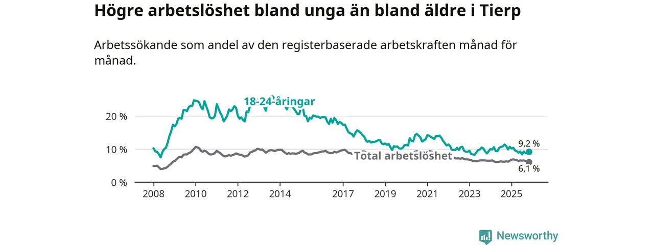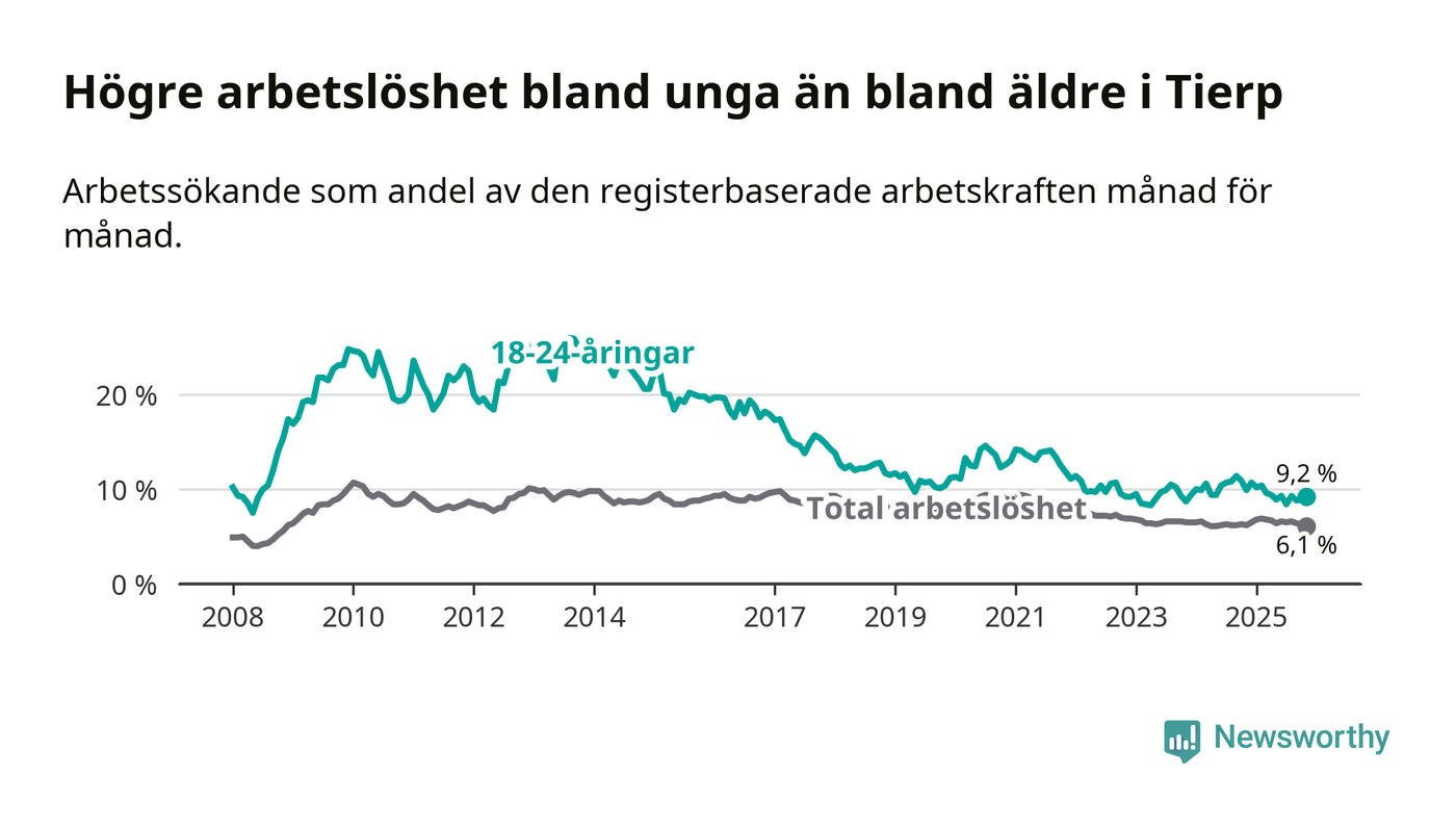 Medan Tierp har ungefär samma total arbetslöshet som Uppsala, ligger ungdomsarbetslösheten 2,6 procentenheter högre i Tierp.