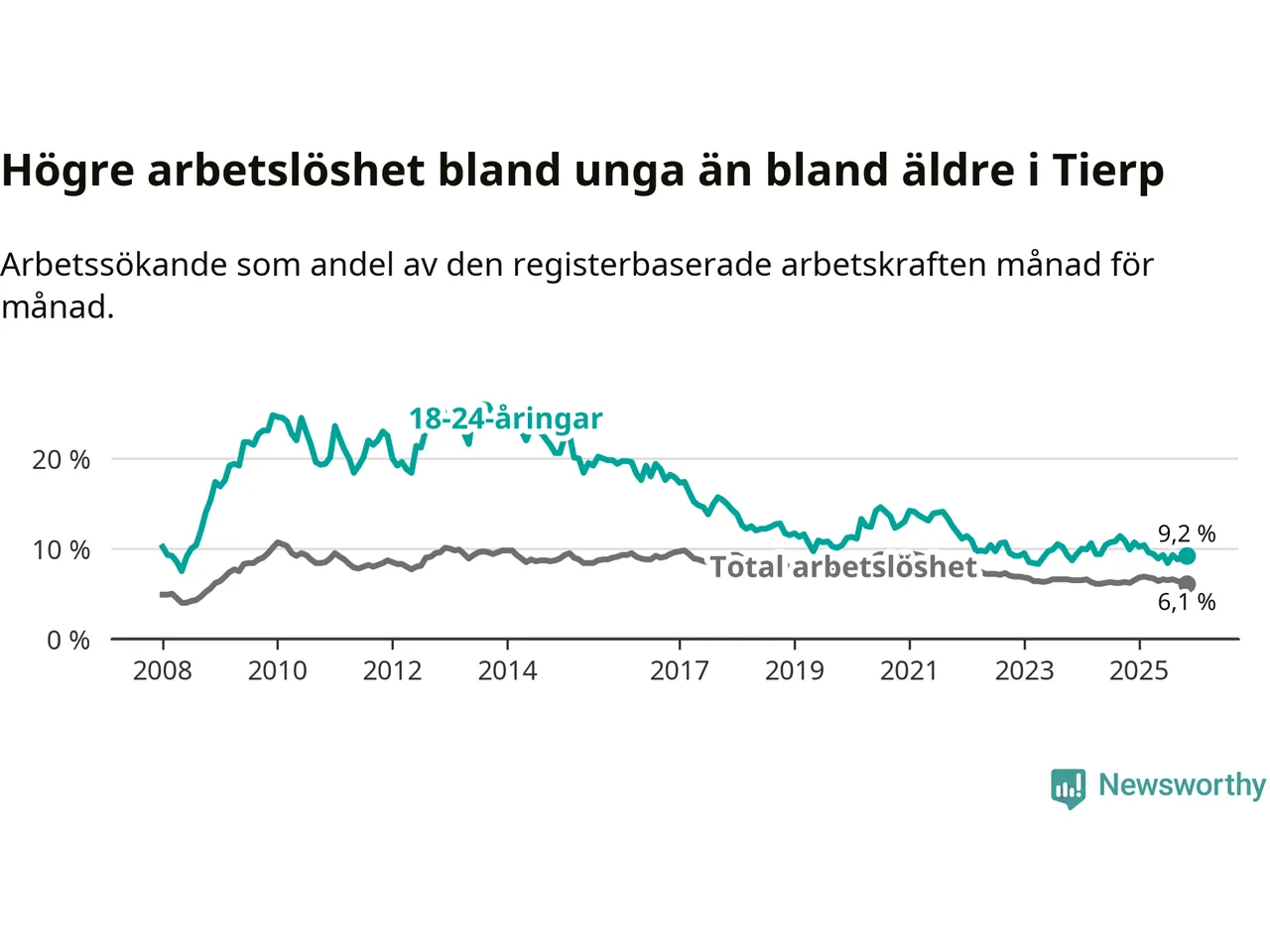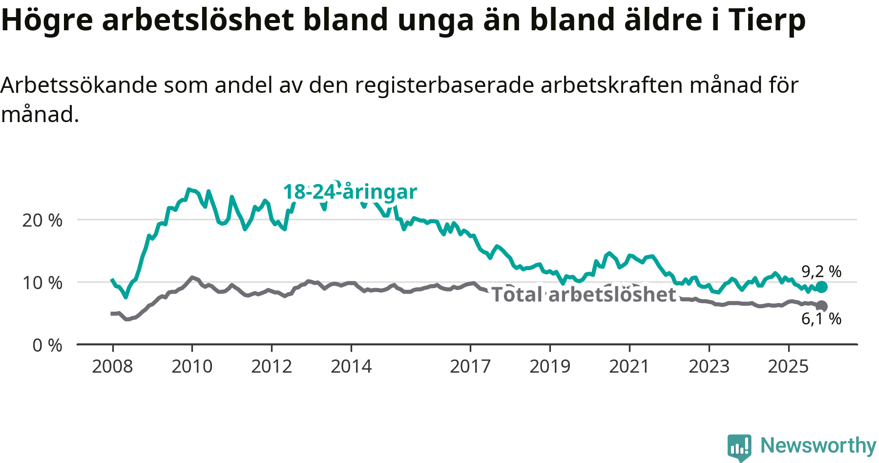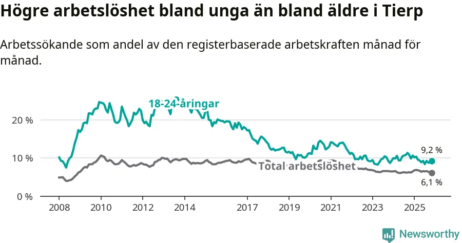 I och med den senaste månadens nedgång har de ungas arbetslöshet i Tierp sjunkit sju månader i följd (ner från 9,4 procent i april till 9,2 procent nu).