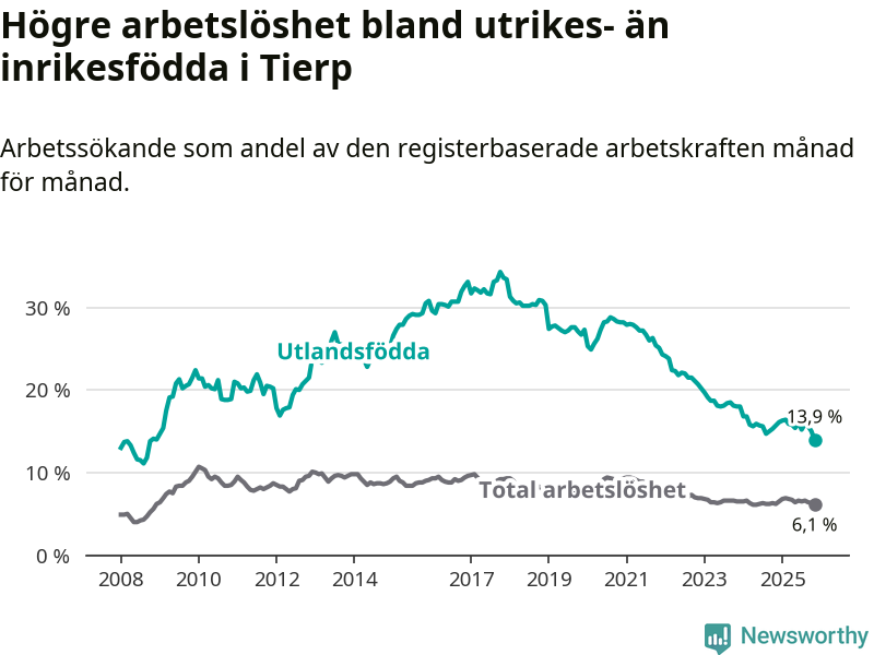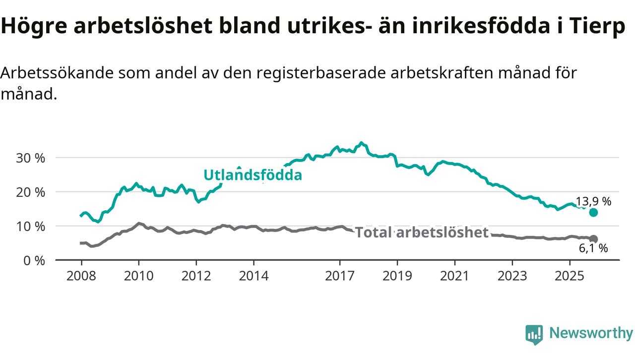 Den senaste månadsstatistiken från Arbetsförmedlingen visar på en nedgång i arbetslöshet bland utlandsfödda i Tierps kommun med 1,8 procentenheter. Arbetslösheten bland invånare födda i ett annat land låg i november på 13,9 procent.
