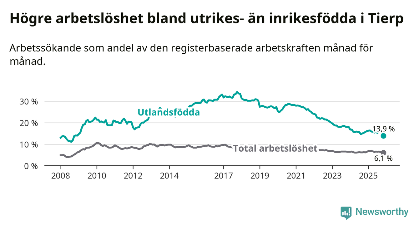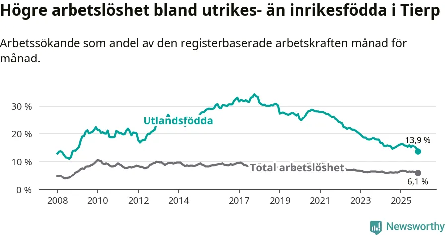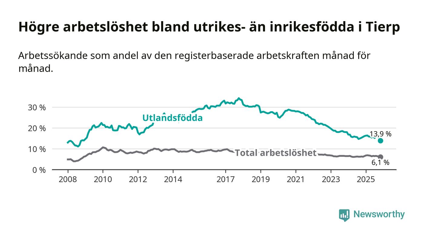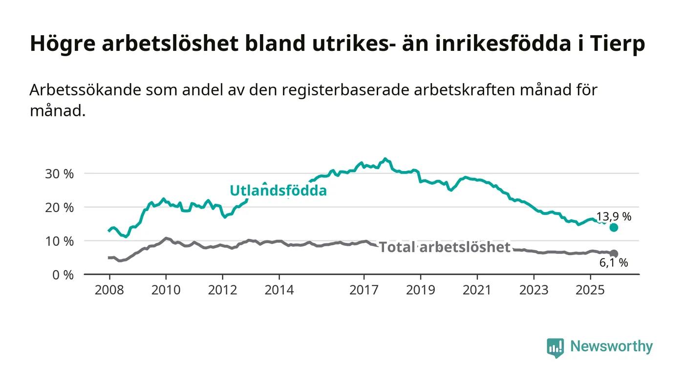 Skillnaden i arbetslöshet mellan utrikesfödda och hela befolkningen är 7,8 procentenheter i Tierp. Det är en betydligt mindre skillnad än för ett år sedan (−1,7 procentenheter).