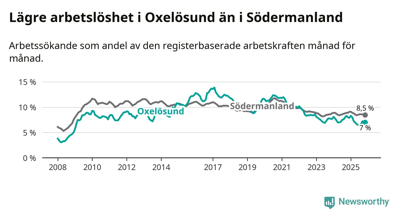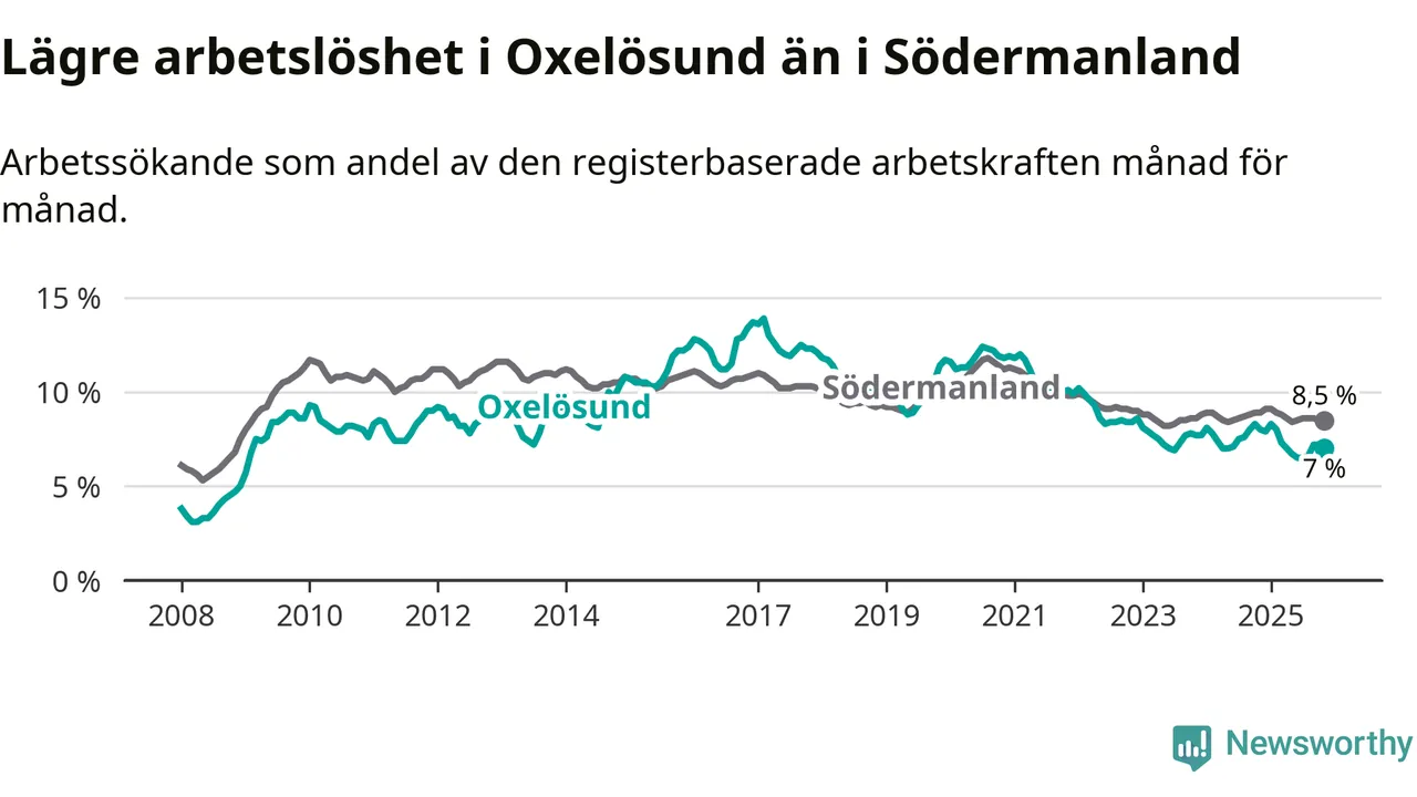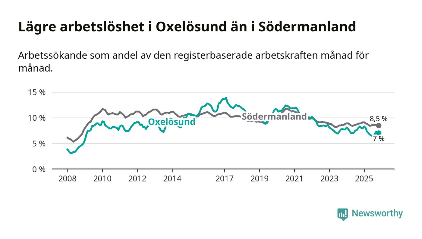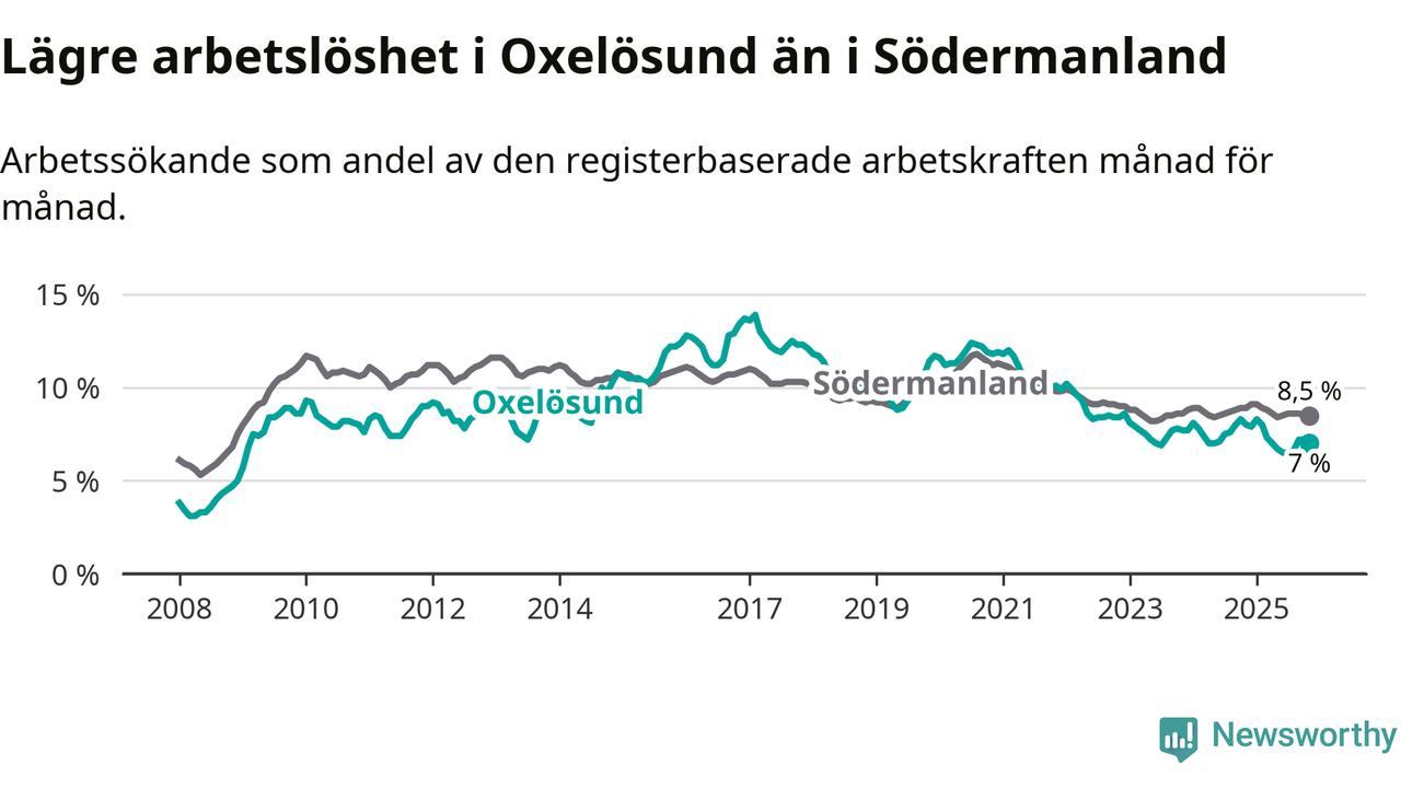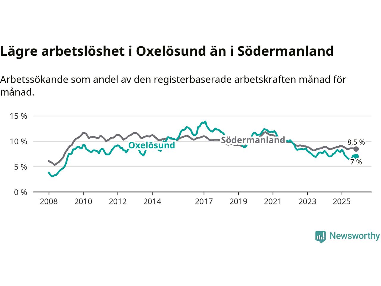 Under november månad rapporterade Oxelösunds kommun en total arbetslöshet på 7,0 procent. Det är en minskning jämfört med samma tidpunkt i fjol (−1,0 procentenheter). Även i Södermanlands län sjunker arbetslösheten .