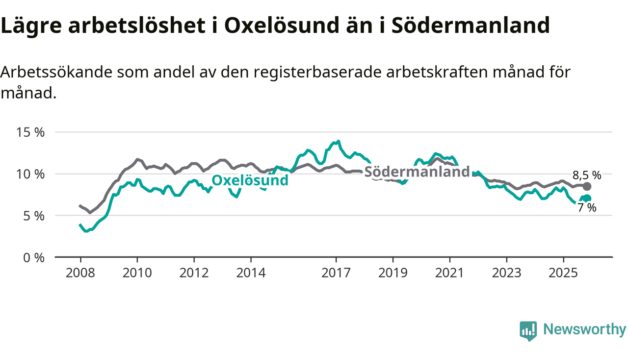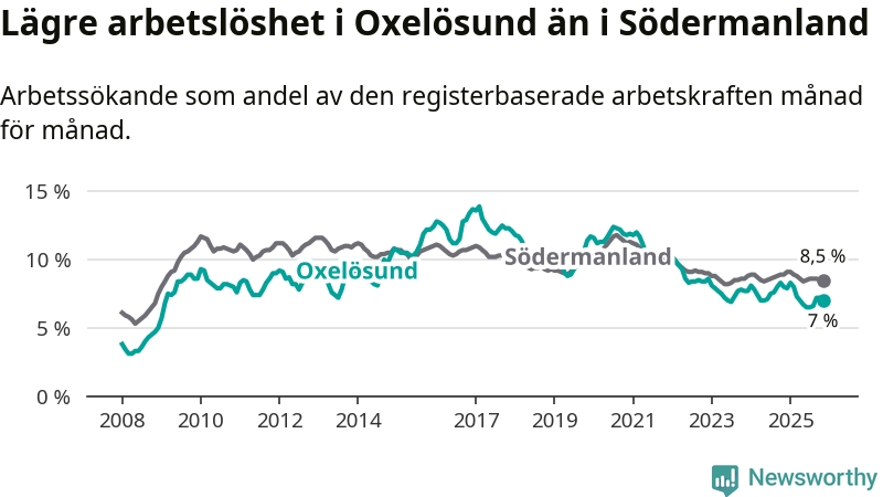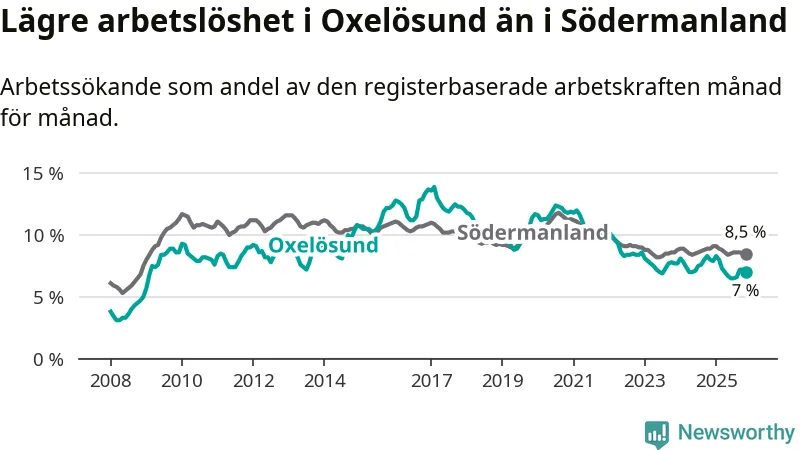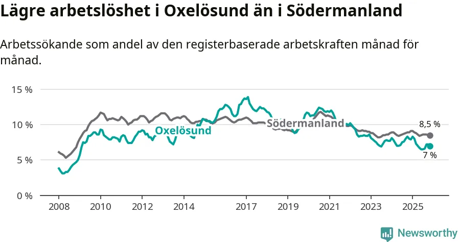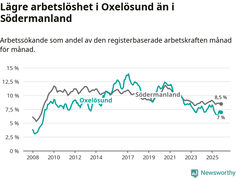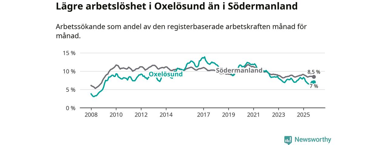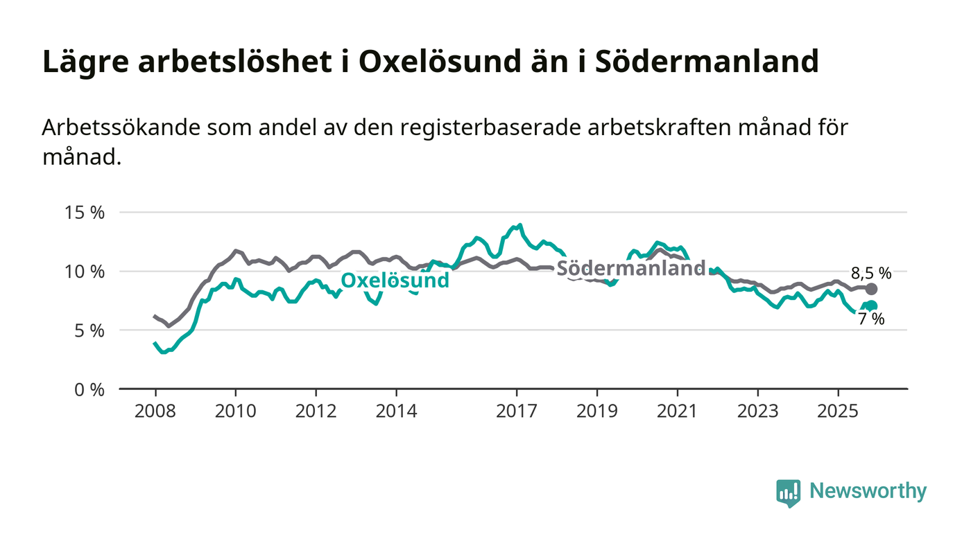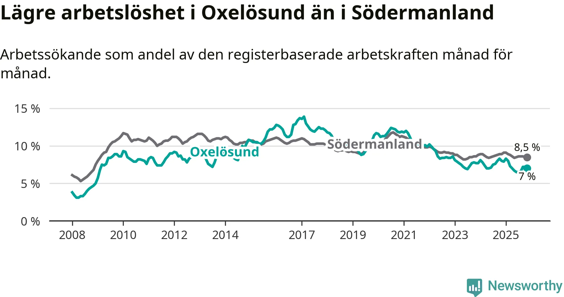 Under november månad rapporterade Oxelösunds kommun en total arbetslöshet på 7,0 procent. Det är en minskning jämfört med samma tidpunkt i fjol (−1,0 procentenheter). Även i Södermanlands län sjunker arbetslösheten .