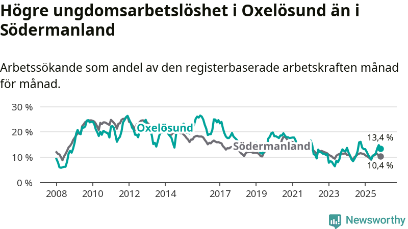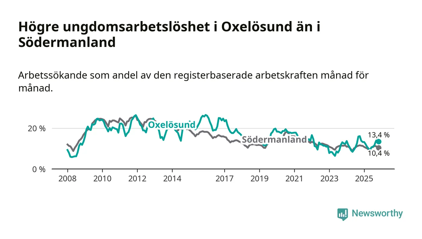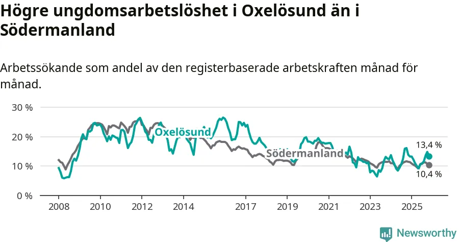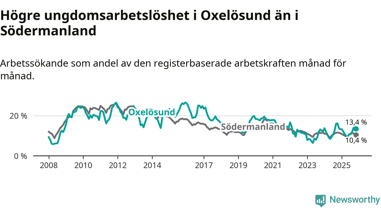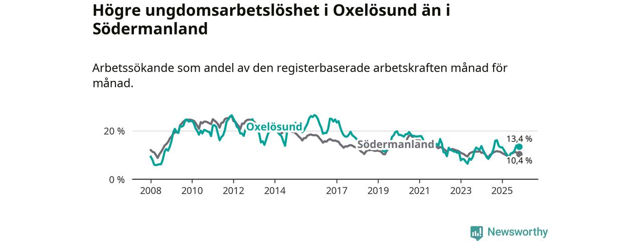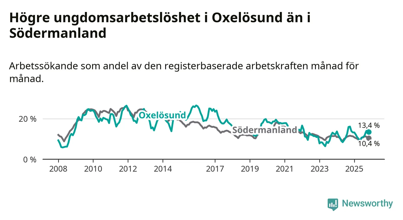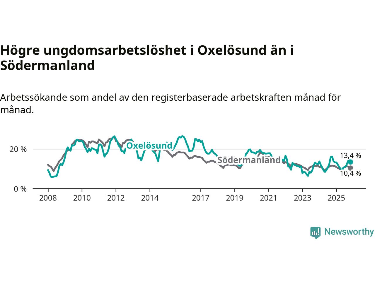 Medan Oxelösund har lägre total arbetslöshet än Södermanland, ligger ungdomsarbetslösheten 3,0 procentenheter högre i Oxelösund.