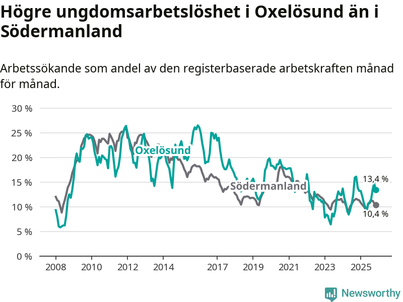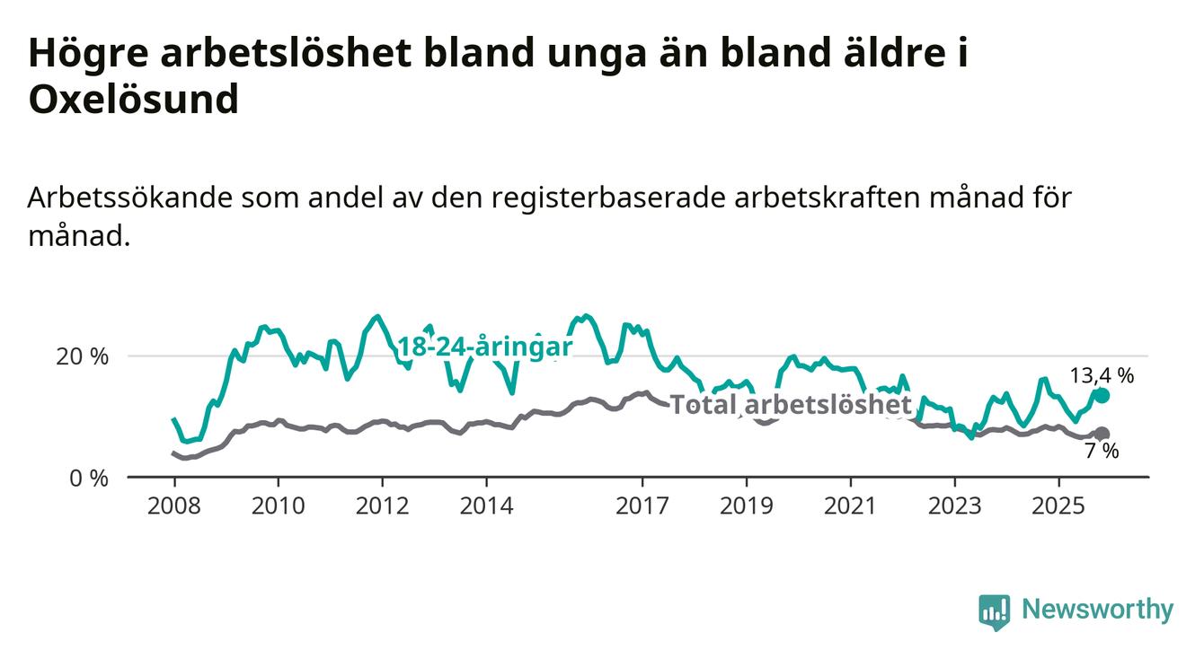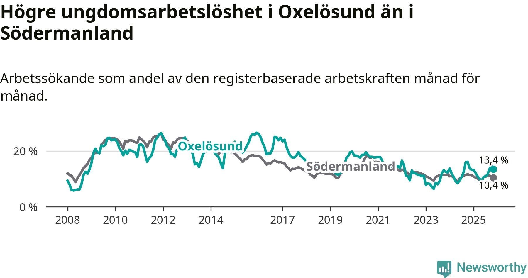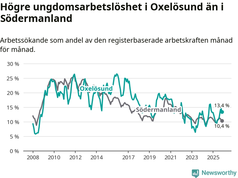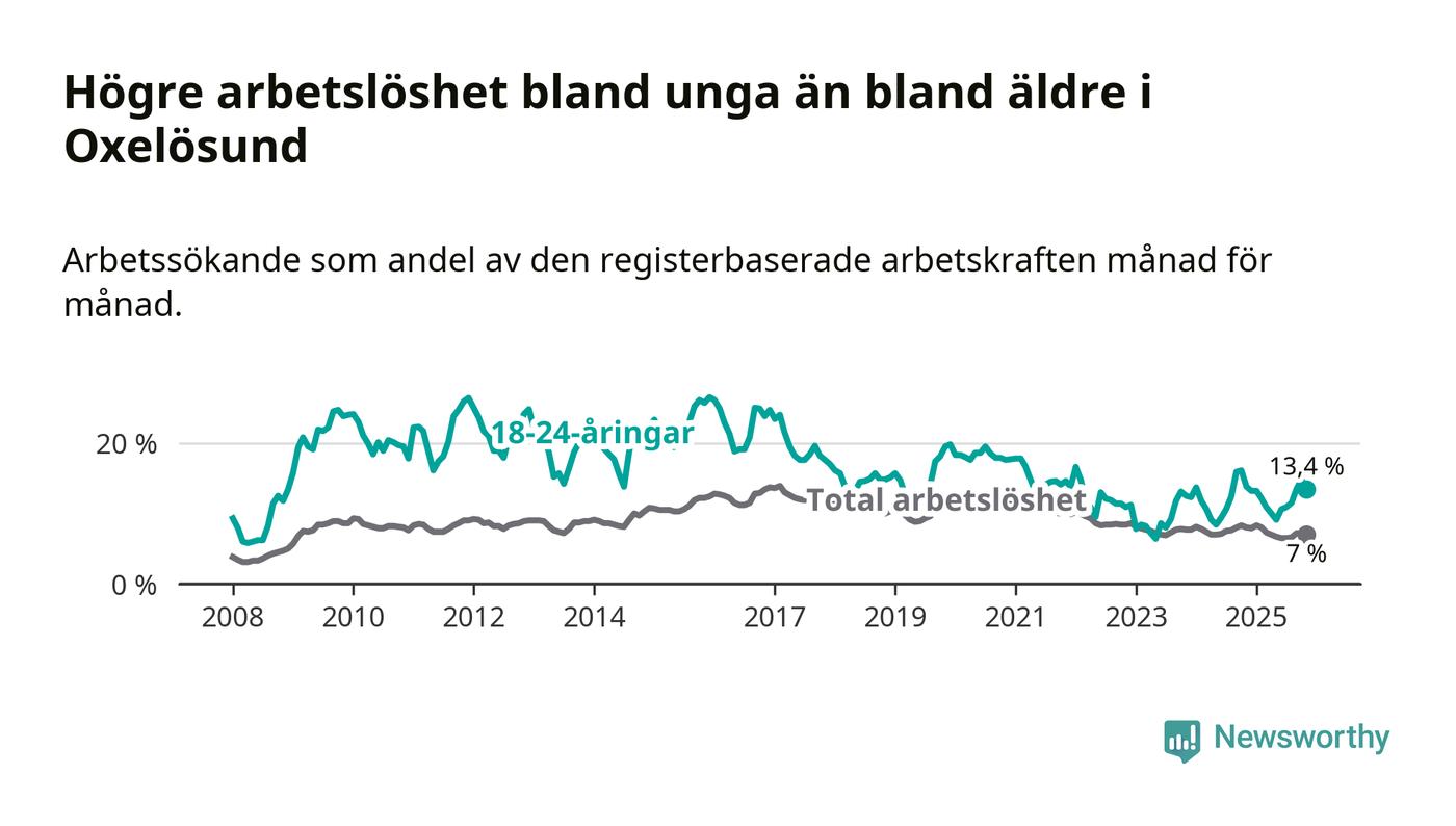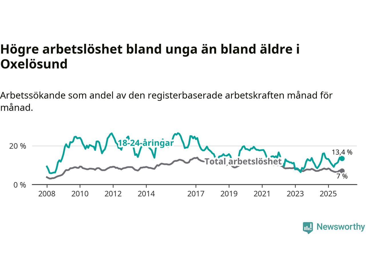Medan Oxelösund har lägre total arbetslöshet än Södermanland, ligger ungdomsarbetslösheten 3,0 procentenheter högre i Oxelösund.