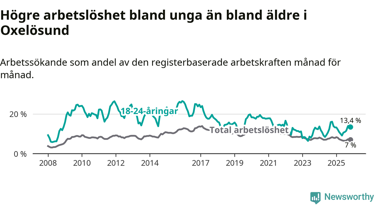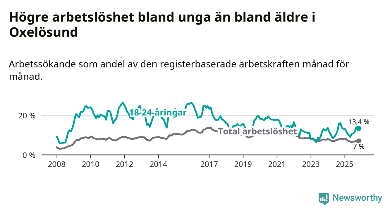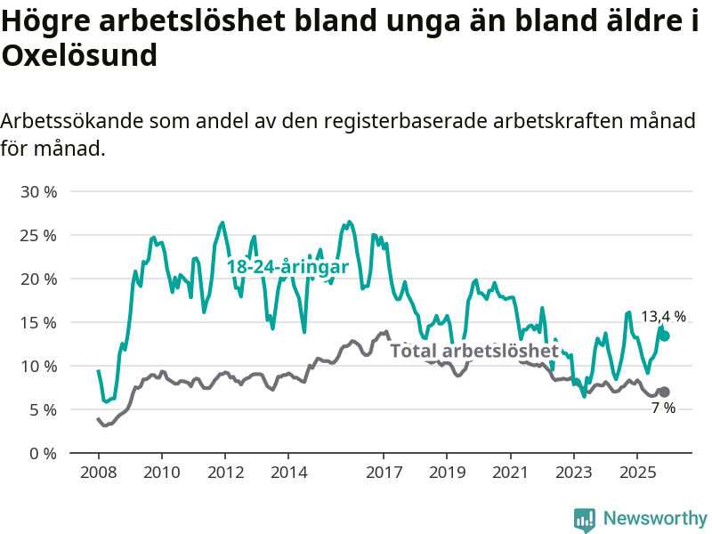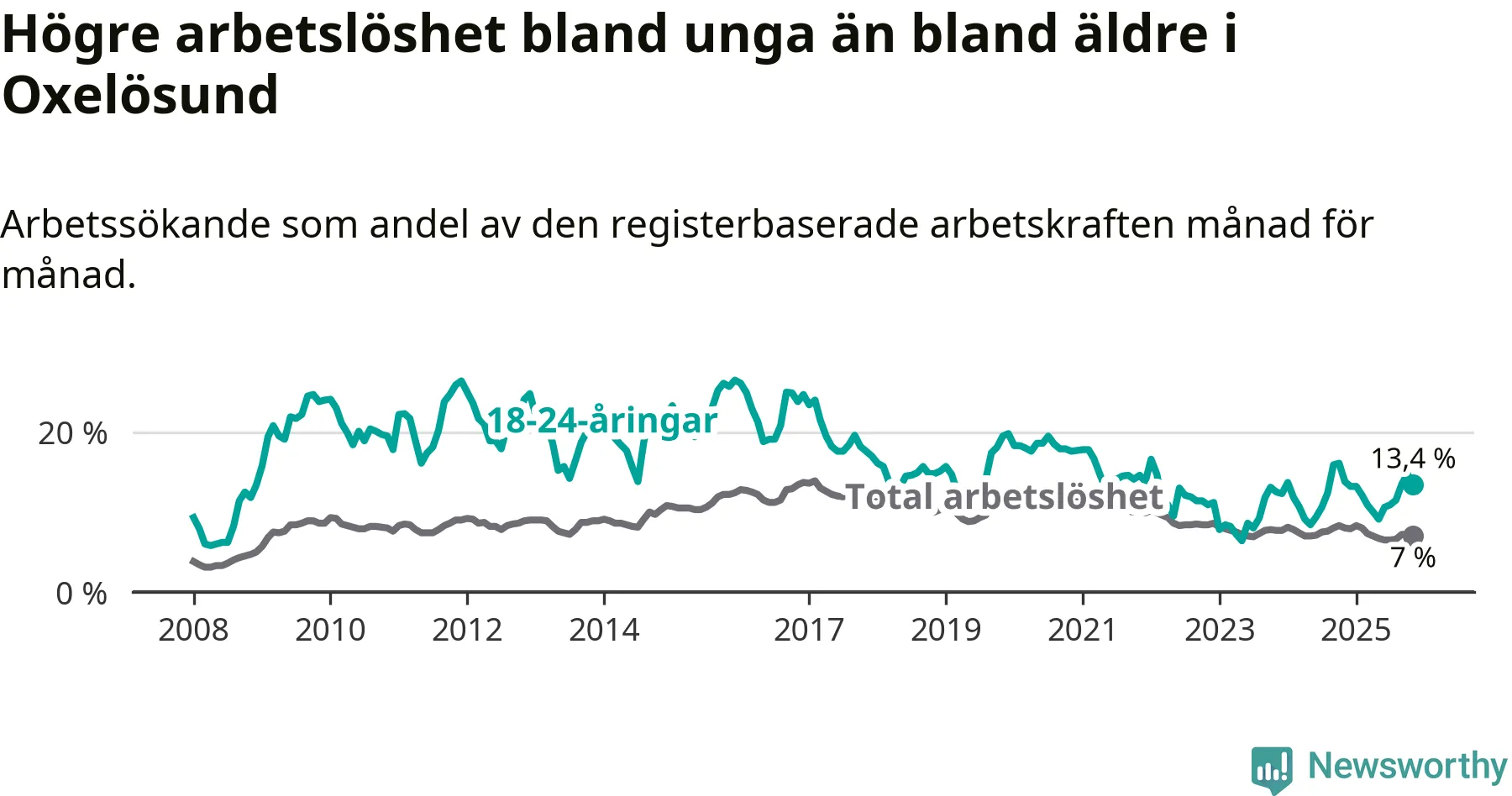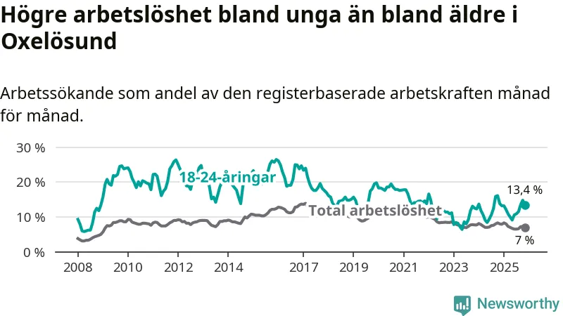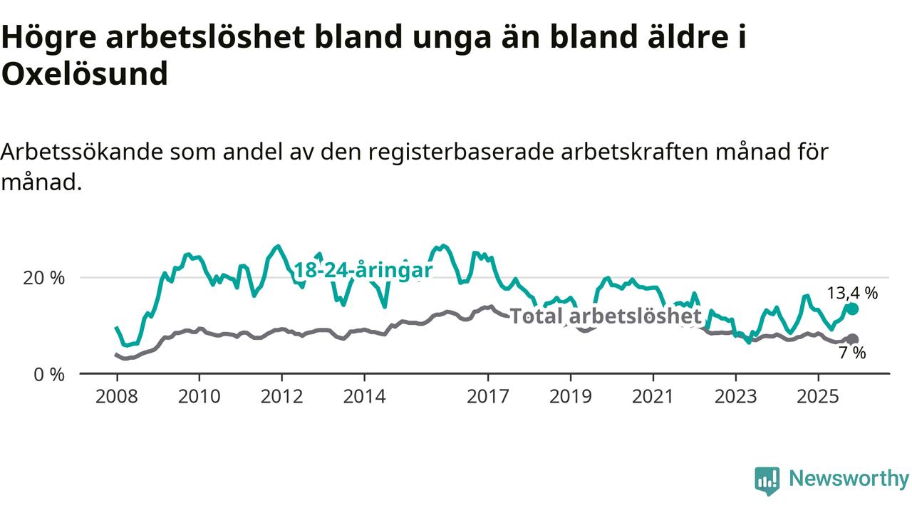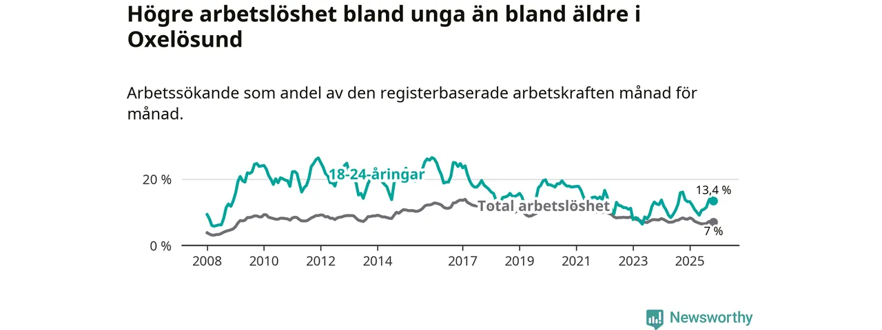 Medan Oxelösund har lägre total arbetslöshet än Södermanland, ligger ungdomsarbetslösheten 3,0 procentenheter högre i Oxelösund.