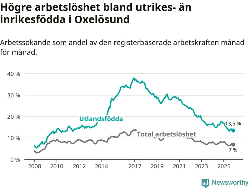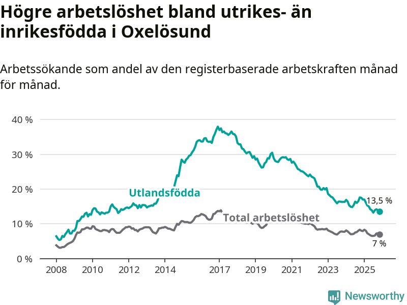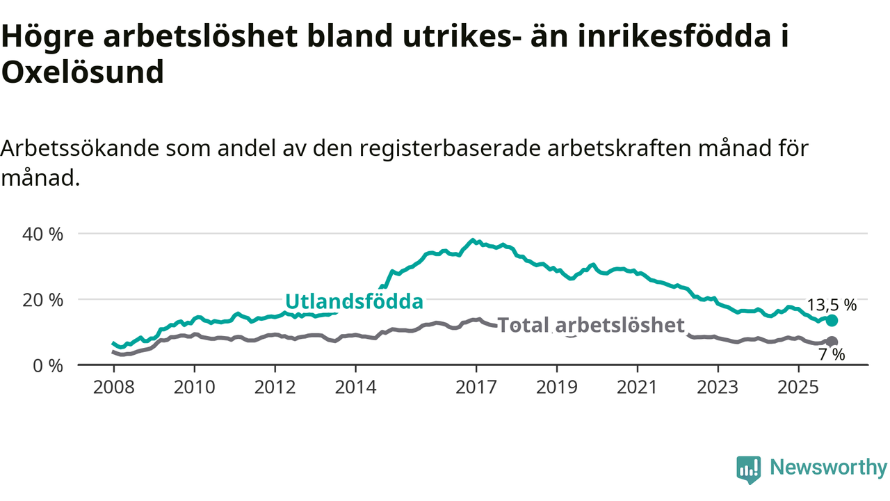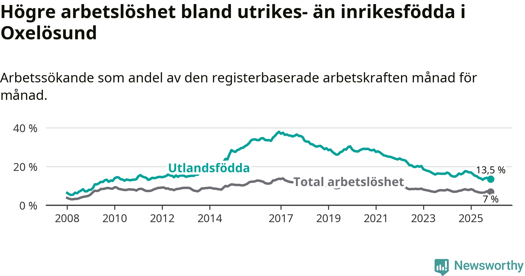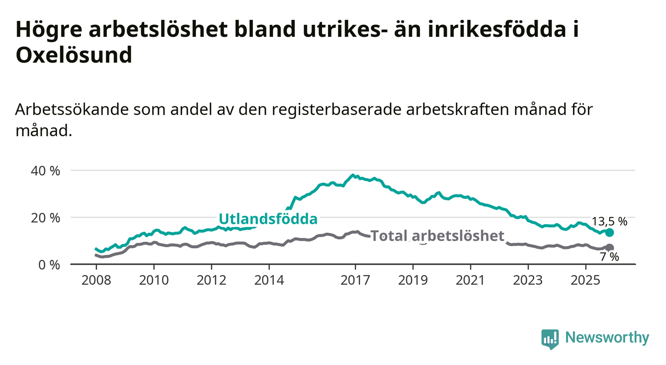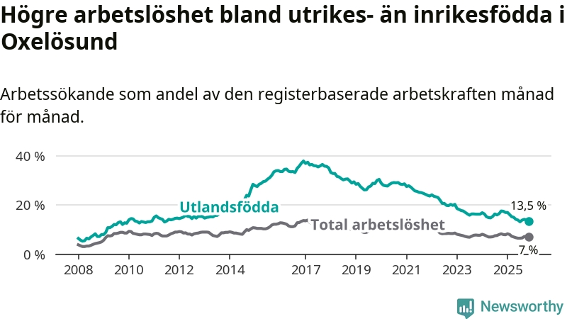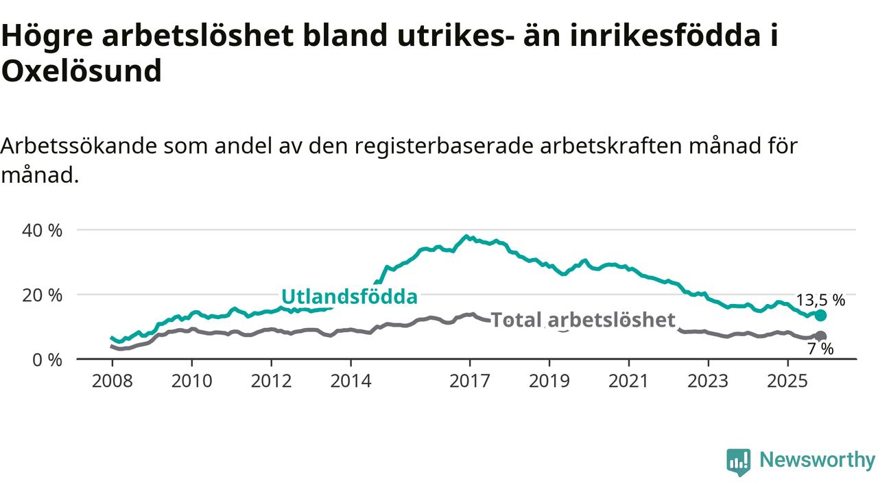 Arbetslösheten bland utlandsfödda var 13,5 procent i Oxelösund under november månad, motsvarande 181 av 1 341 personer. Det är 4,0 procentenheter färre än vid samma tidpunkt i fjol (−54 om man räknar personer). Därmed är de utlandsföddas arbetslöshet lägre än vid samma tidpunkt i fjol för sjunde månaden i följd. Sedan april har arbetslösheten bland utlandsfödda minskat från 15,0 till 13,5 procent.