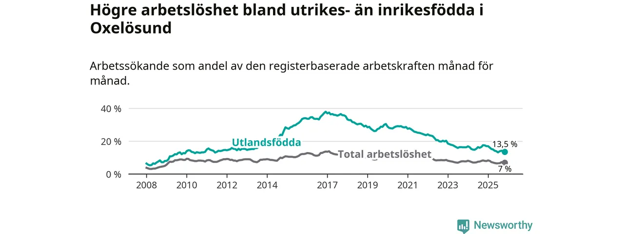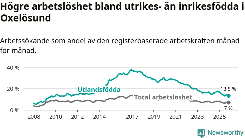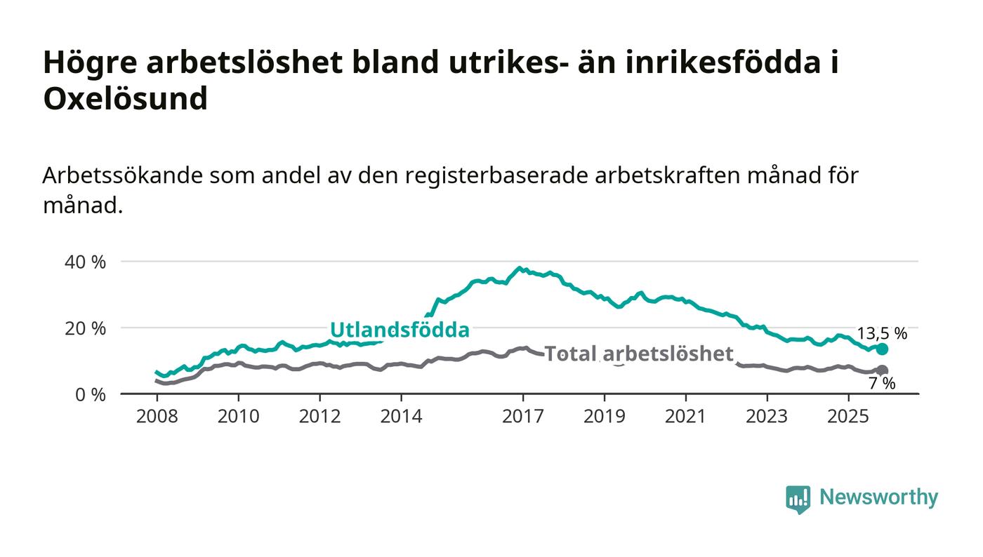 Skillnaden i arbetslöshet mellan utrikesfödda och hela befolkningen är 6,5 procentenheter i Oxelösund. Det är en betydligt mindre skillnad än för ett år sedan (−3,0 procentenheter).