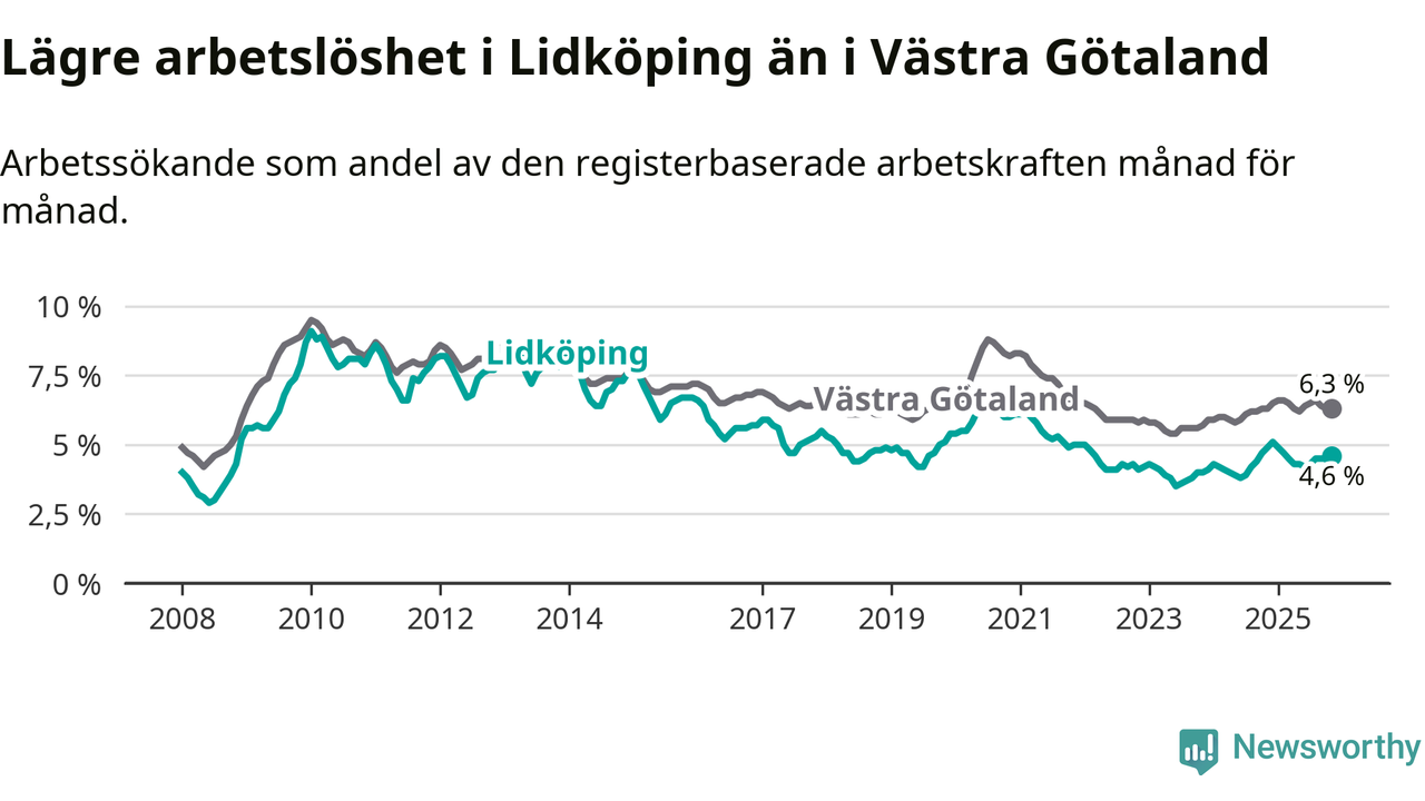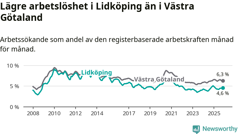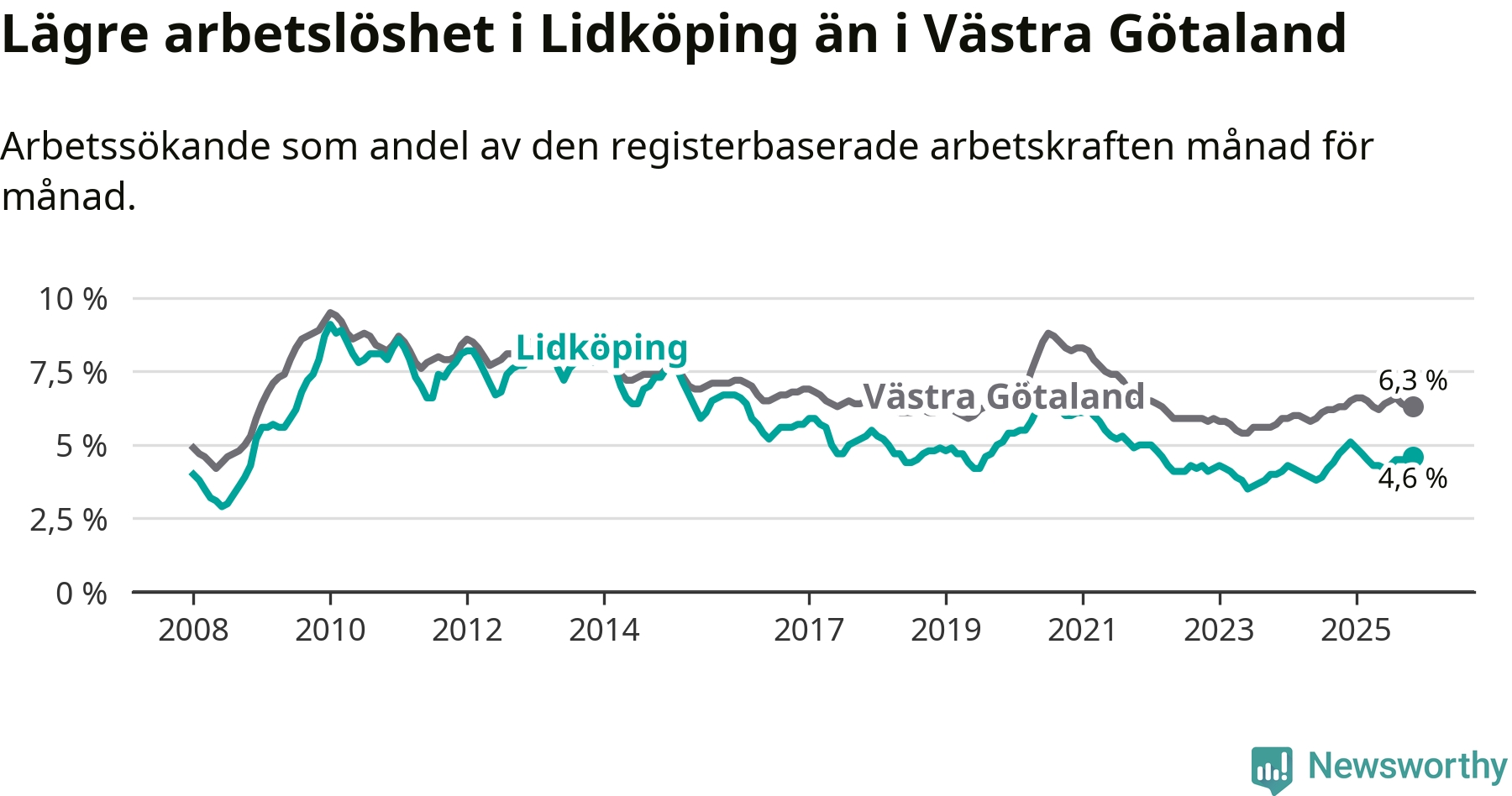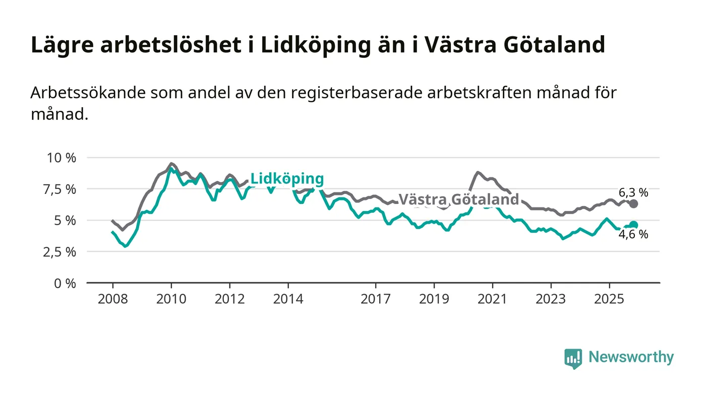 Lidköping hade redan tidigare lägre arbetslöshet än snittet i hela Västra Götalands län och nu växer klyftan (4,6 procent i kommunen, jämfört med 6,3 procent i hela länet). Öckerö har den lägsta arbetslösheten i länet (2,9 procent), medan Gullspång har den högsta (8,6 procent). För att Lidköping skulle komma ner i samma arbetslöshetsnivå som Öckerö skulle 339 personer behöva sysselsättas.