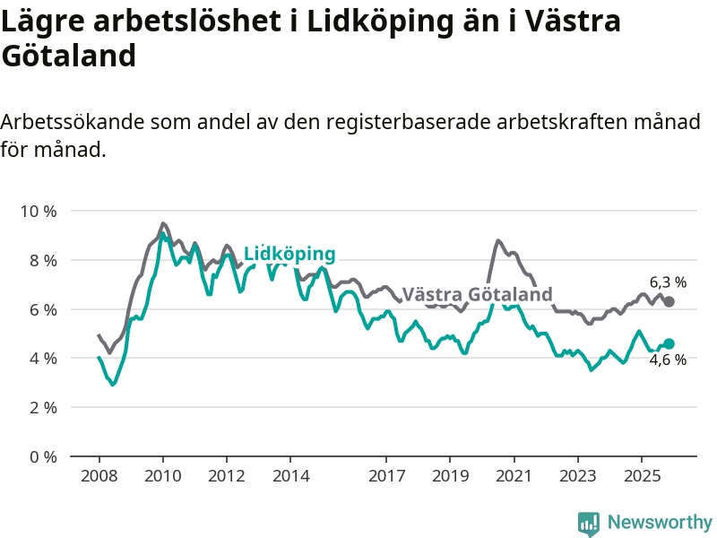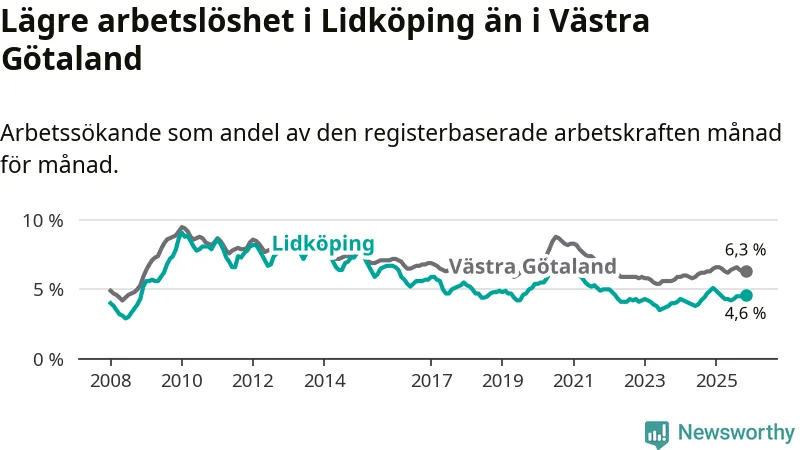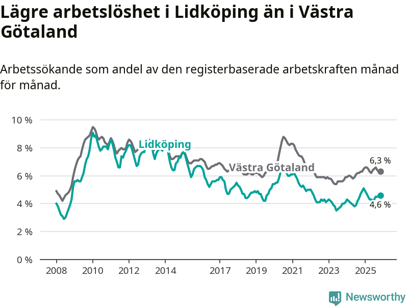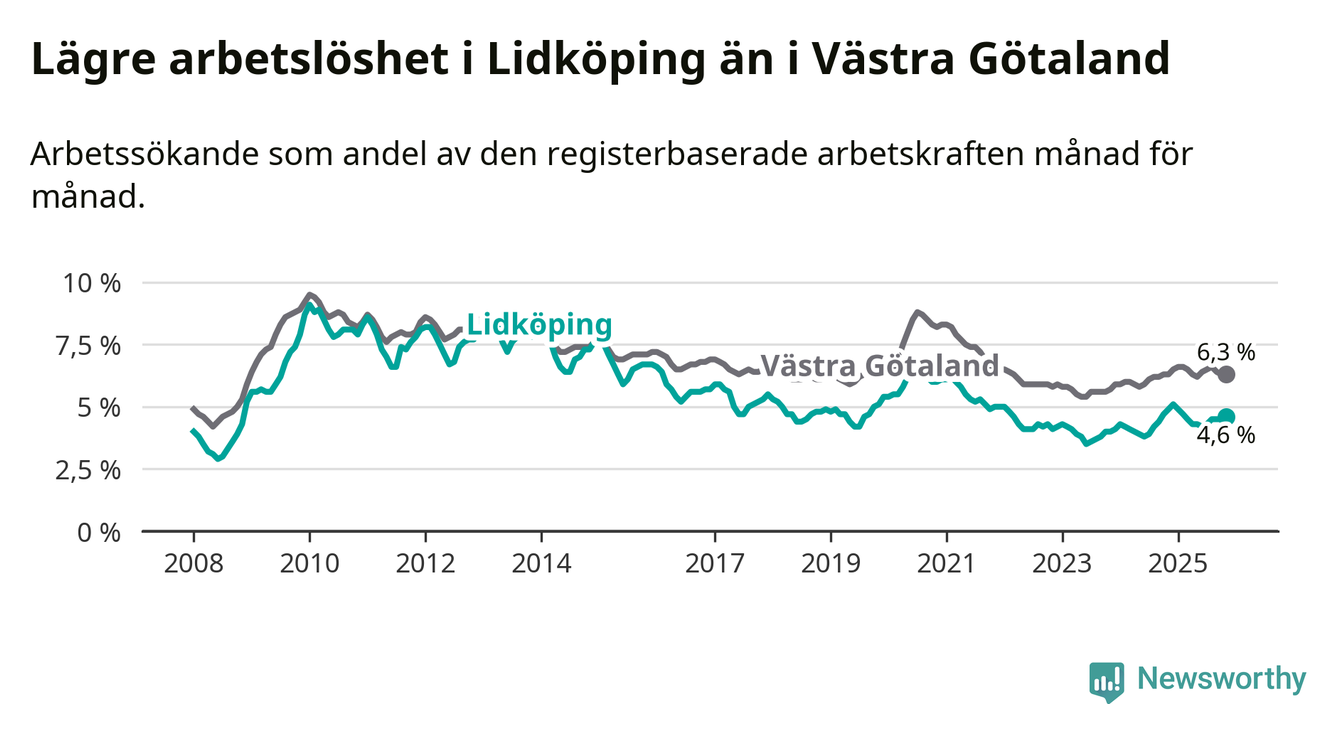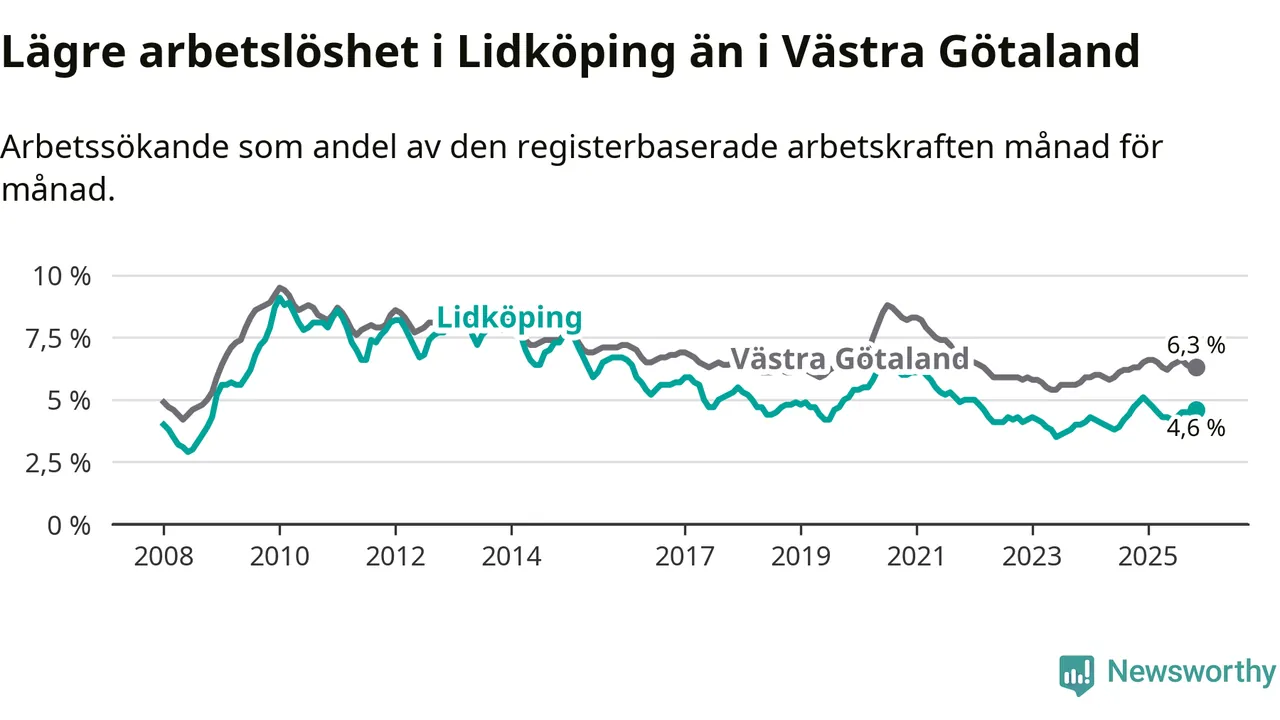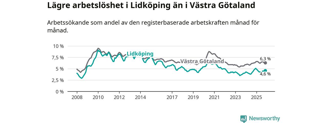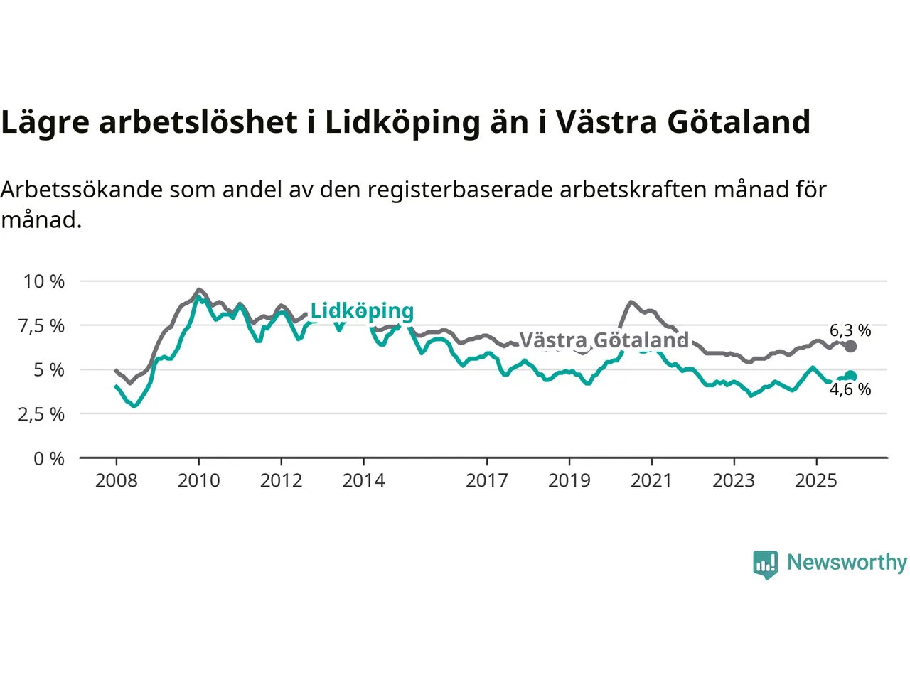 Under november månad rapporterade Lidköpings kommun en total arbetslöshet på 4,6 procent. Det är en minskning jämfört med samma tidpunkt i fjol (−0,3 procentenheter). I Västra Götalands län däremot står arbetslösheten stilla.