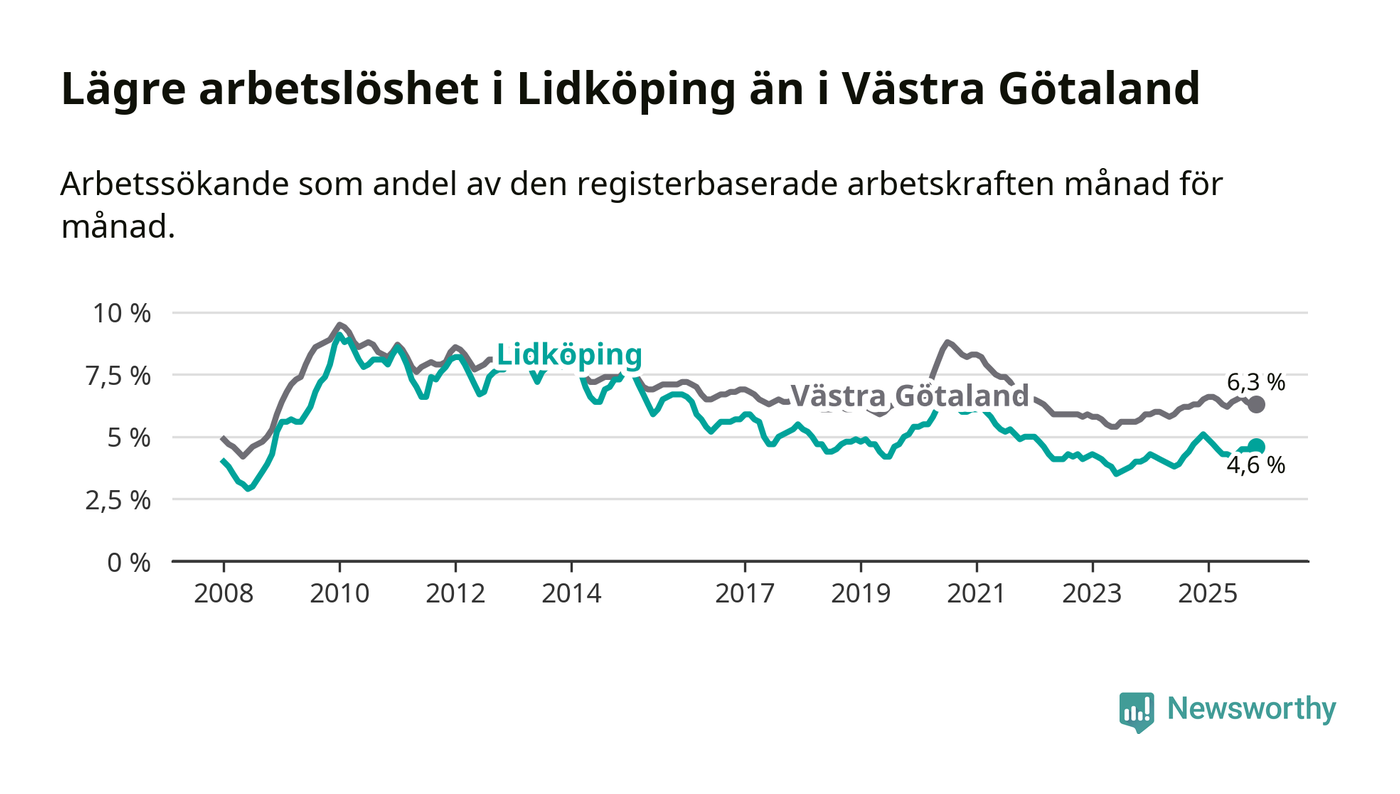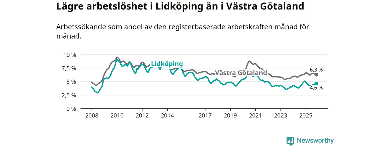 Ny statistik från Arbetsförmedlingen visar på en nedgång i arbetslöshet i Lidköpings kommun. I Västra Götaland däremot står arbetslösheten stilla.