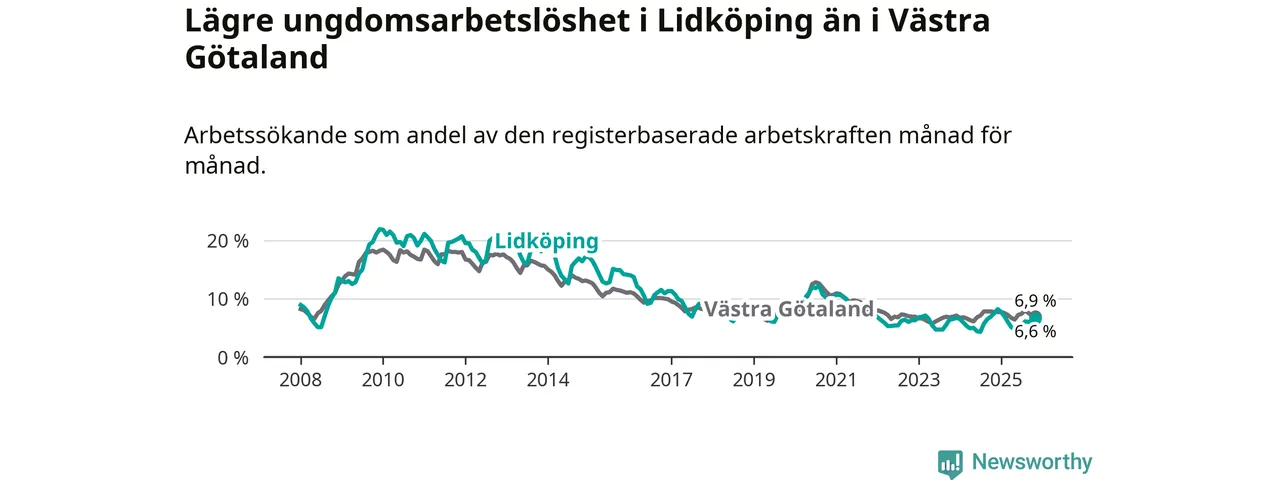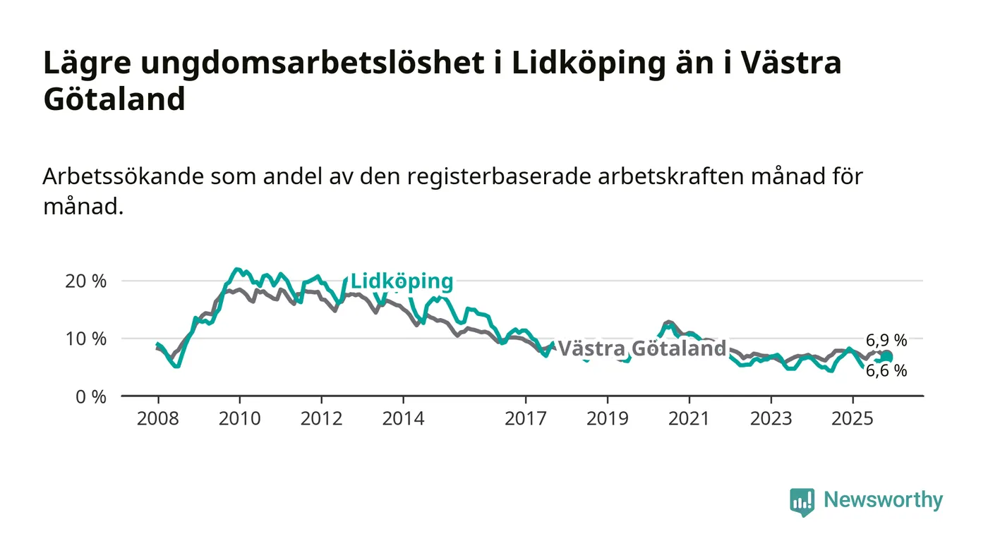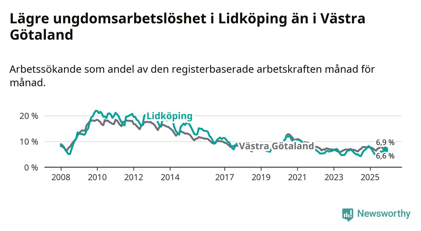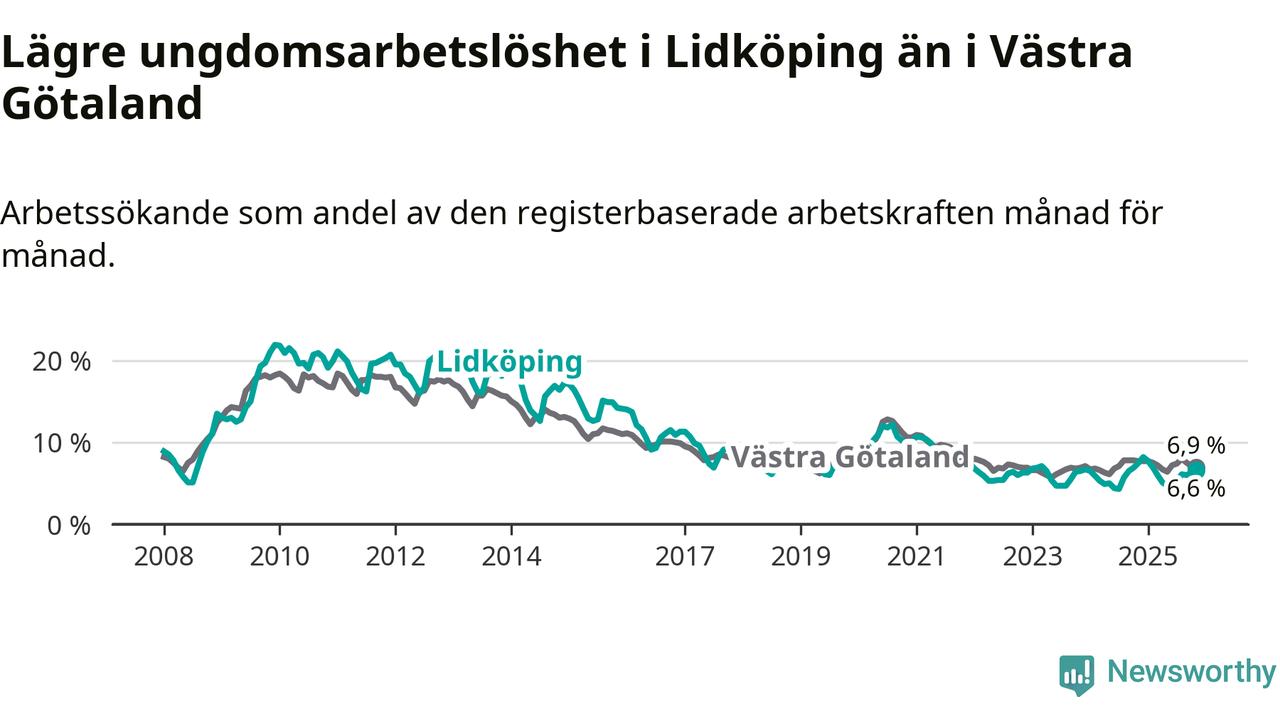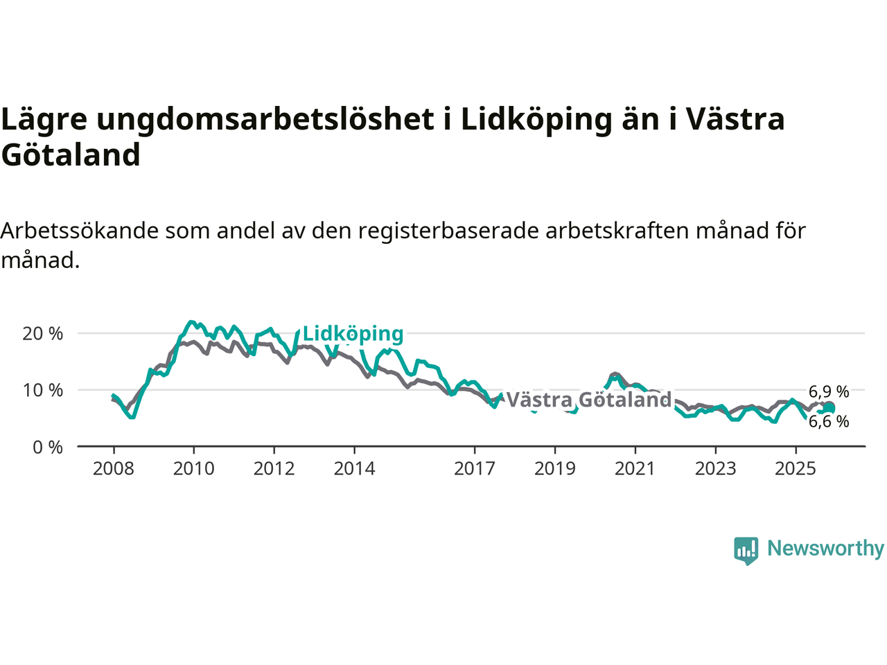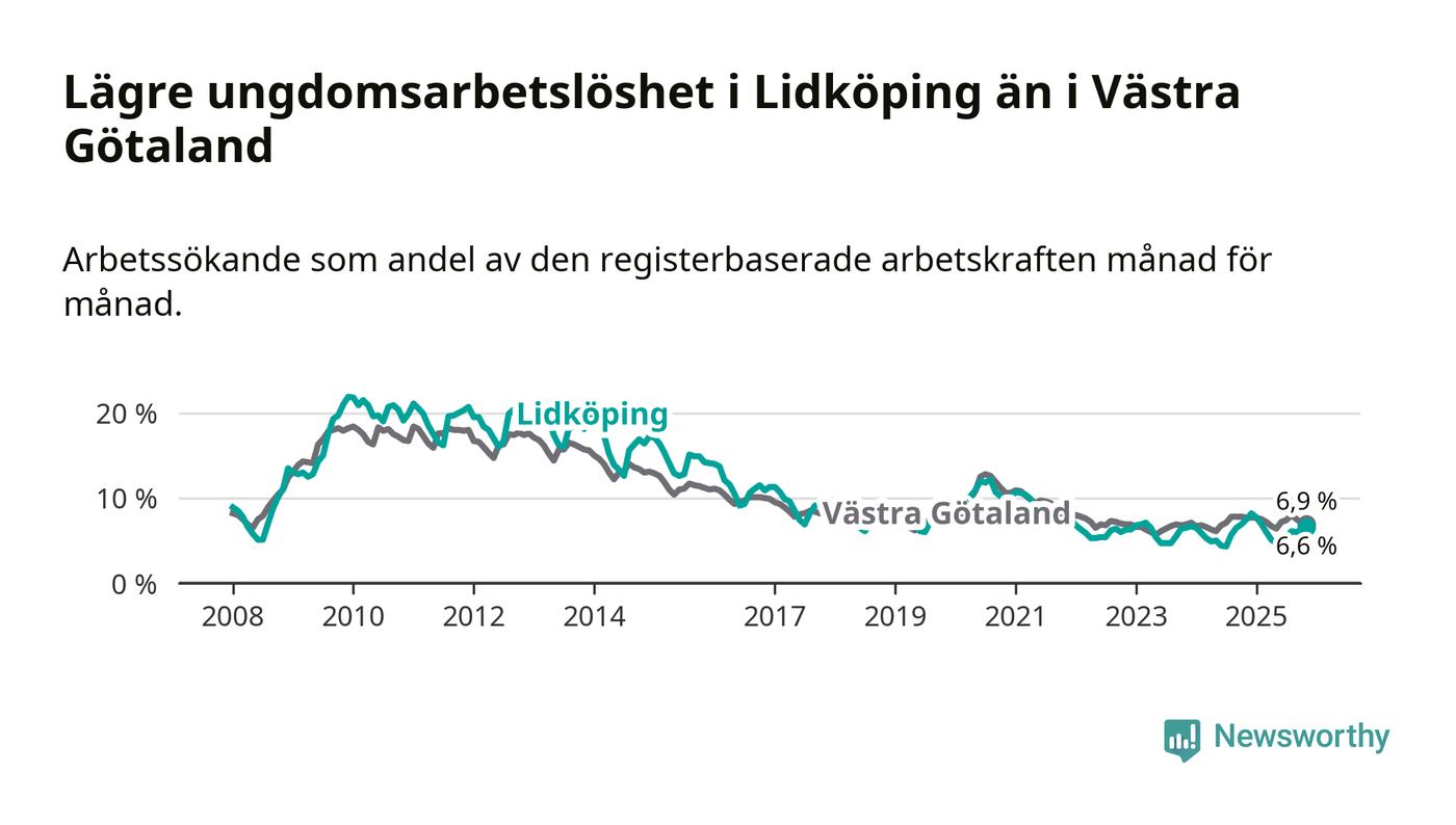 Precis som den totala arbetslösheten ligger ungdomsarbetslösheten i Lidköping lägre än i Västra Götaland som helhet. Skillnaden mellan kommunen och länet är 0,3 procentenheter.