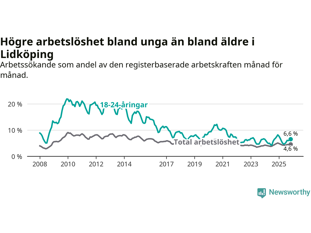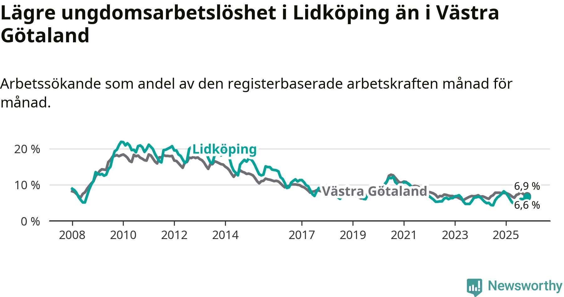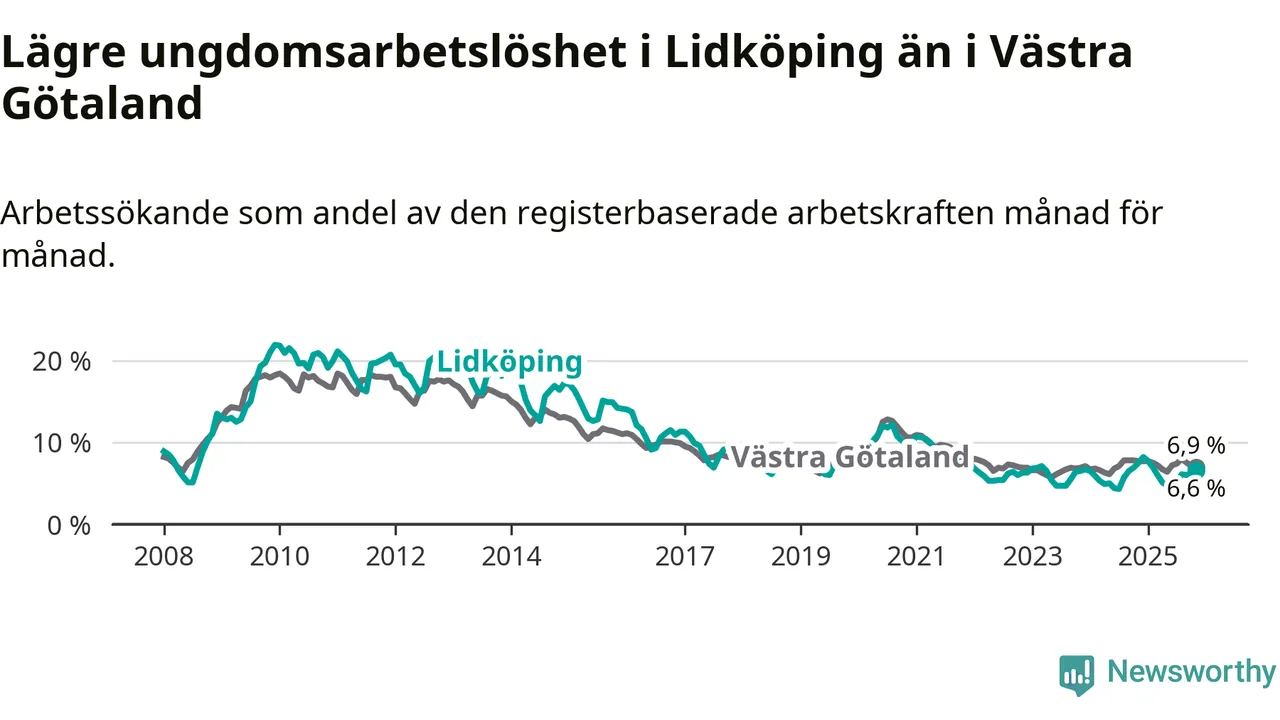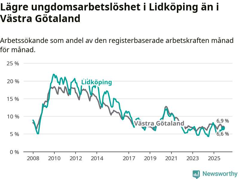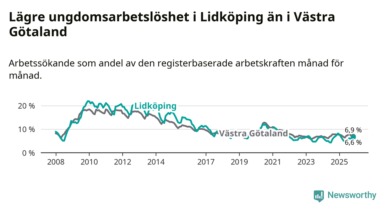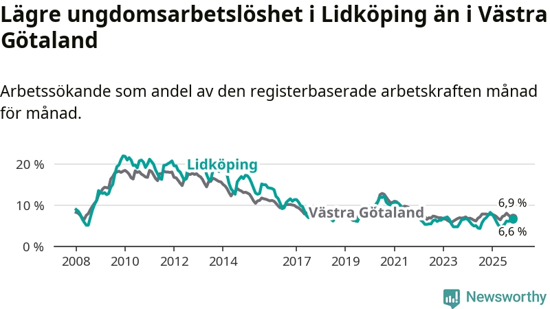Precis som den totala arbetslösheten ligger ungdomsarbetslösheten i Lidköping lägre än i Västra Götaland som helhet. Skillnaden mellan kommunen och länet är 0,3 procentenheter.