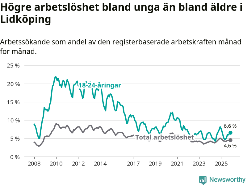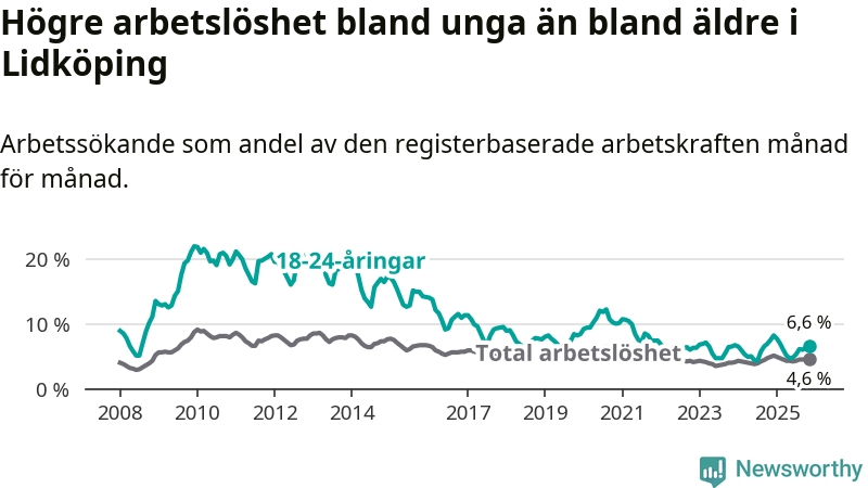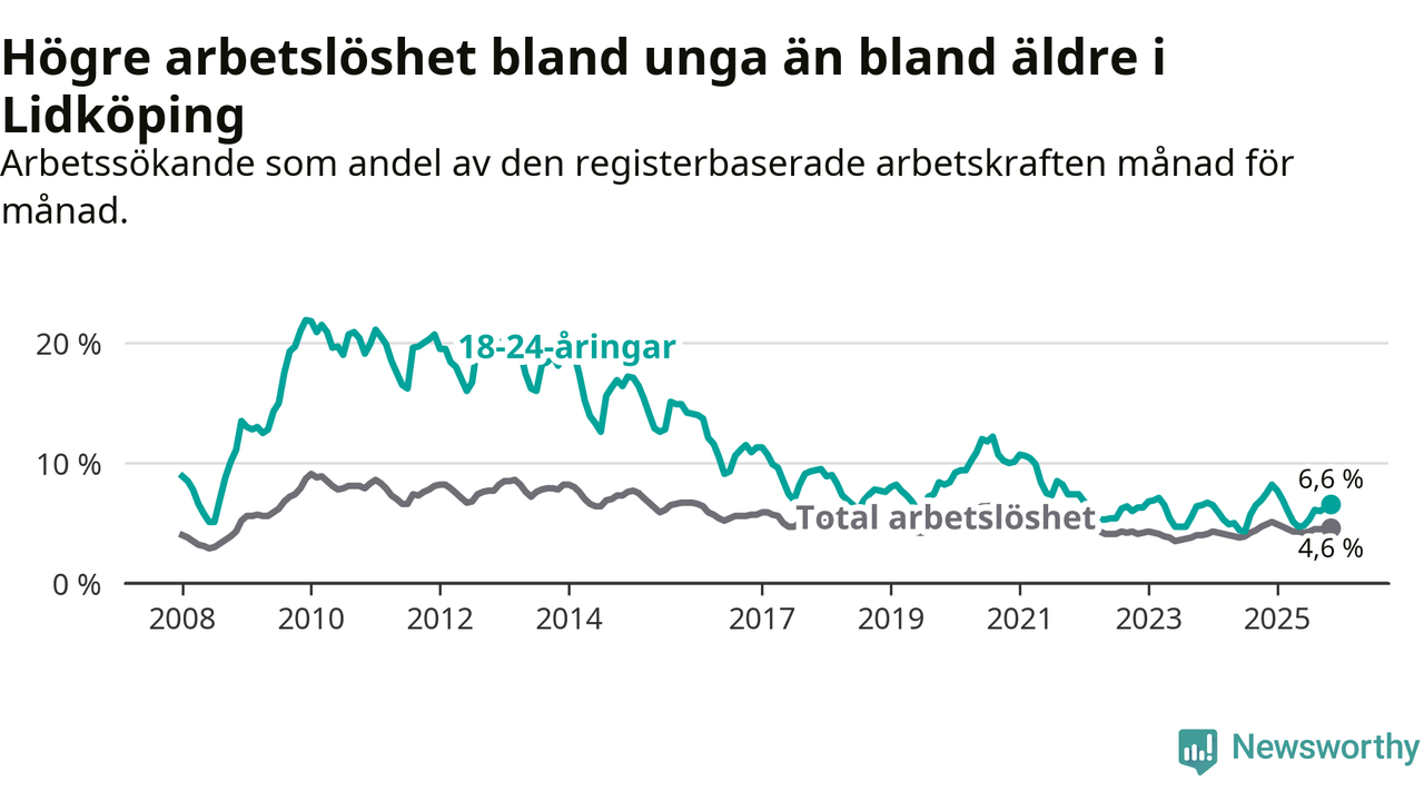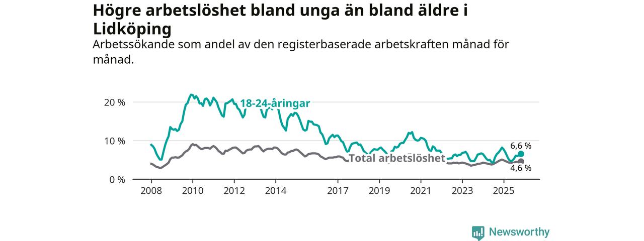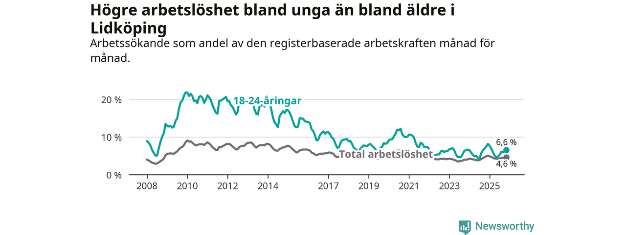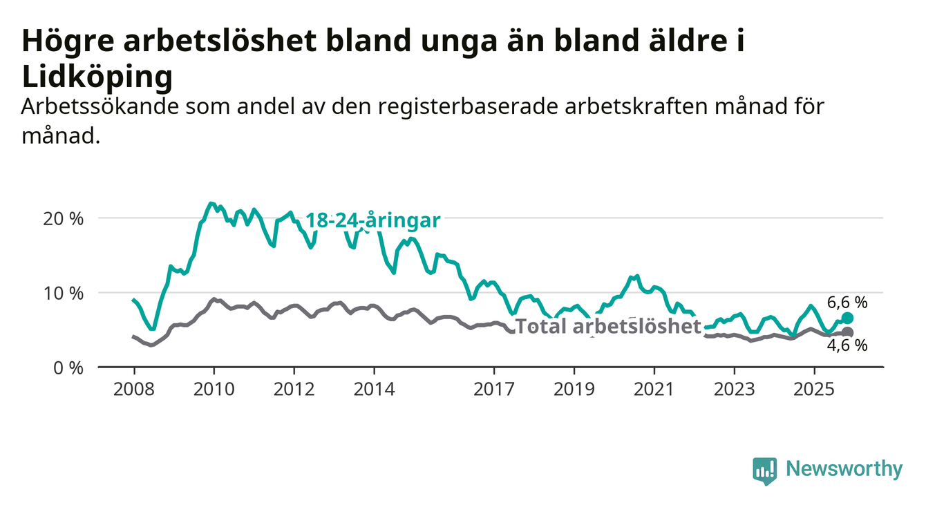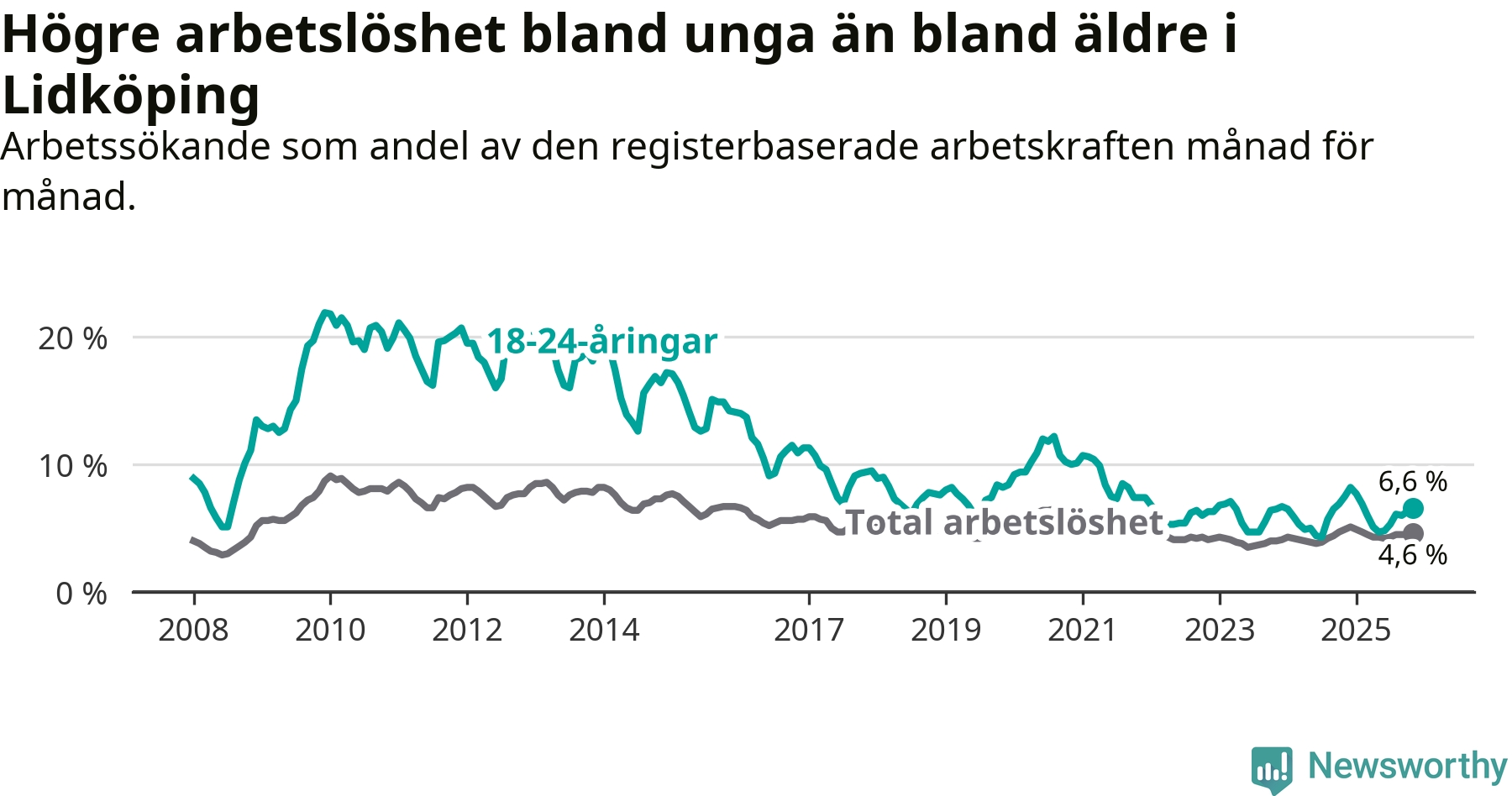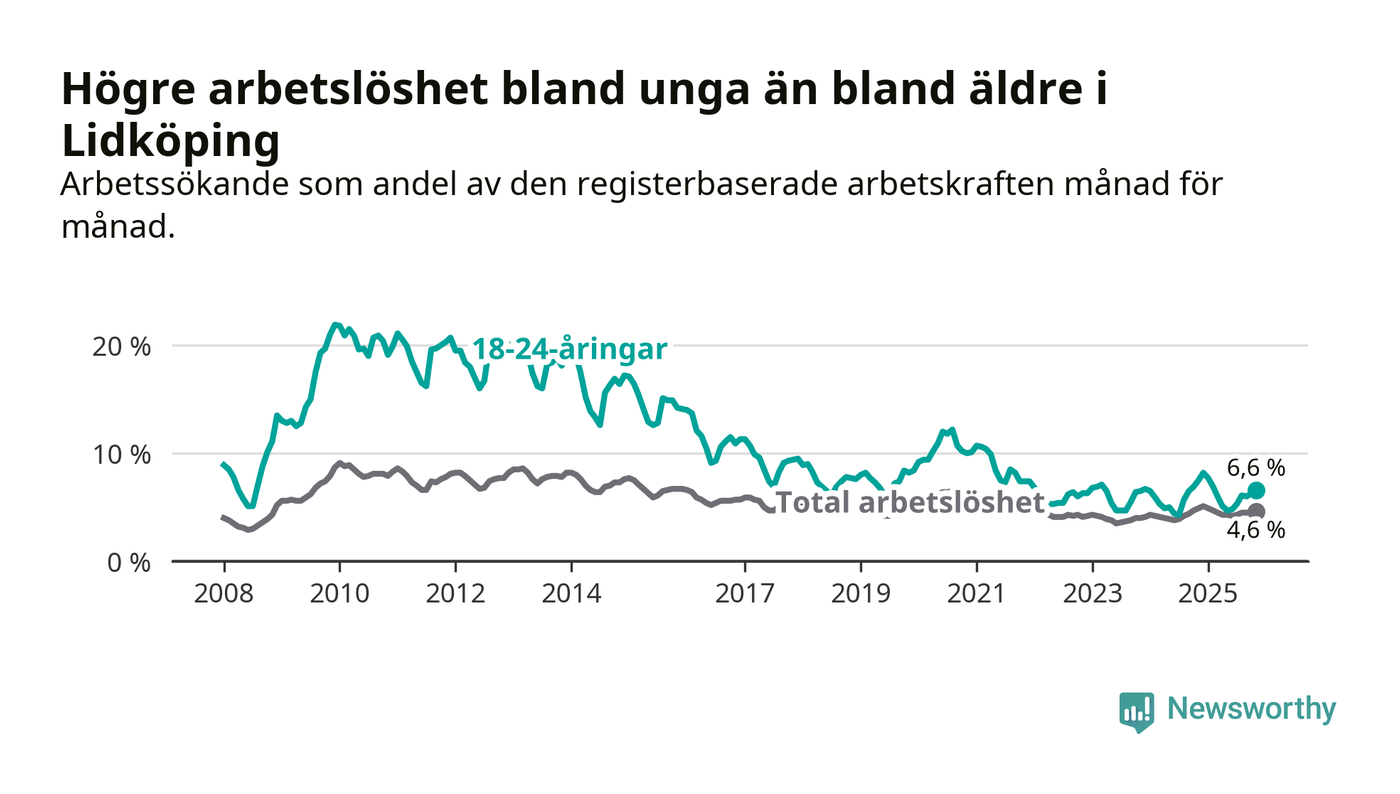 Precis som den totala arbetslösheten ligger ungdomsarbetslösheten i Lidköping lägre än i Västra Götaland som helhet. Skillnaden mellan kommunen och länet är 0,3 procentenheter.