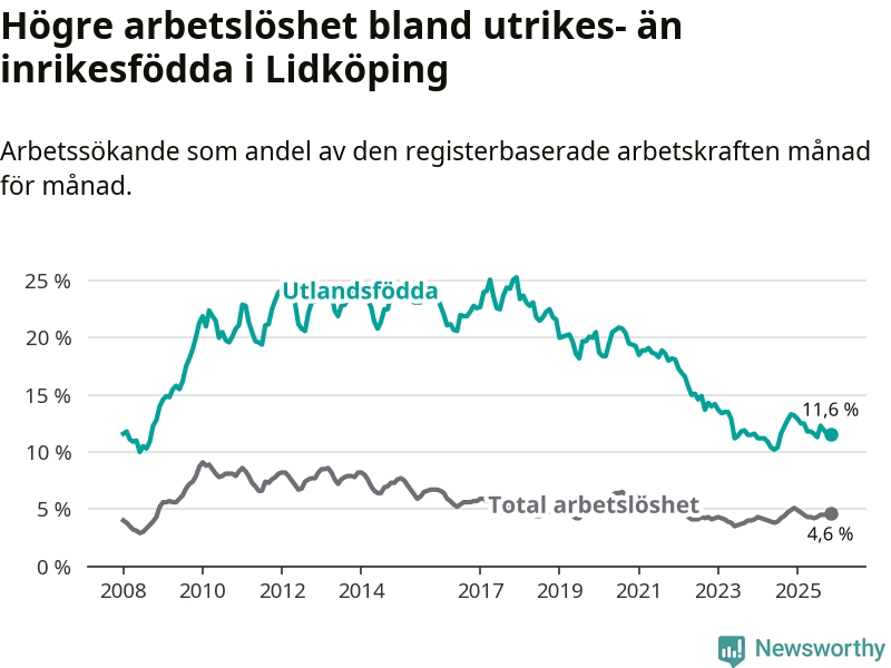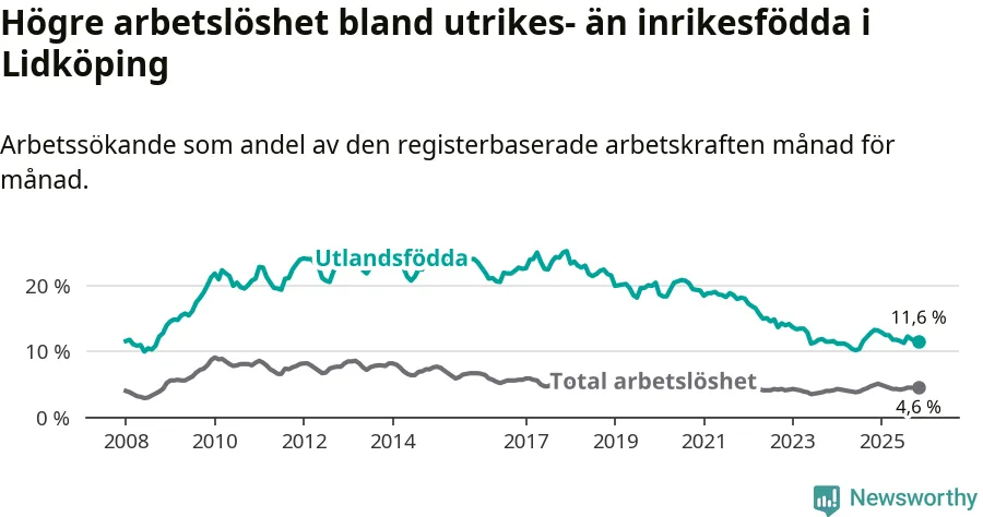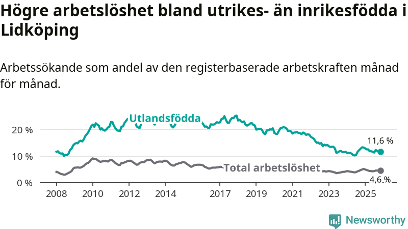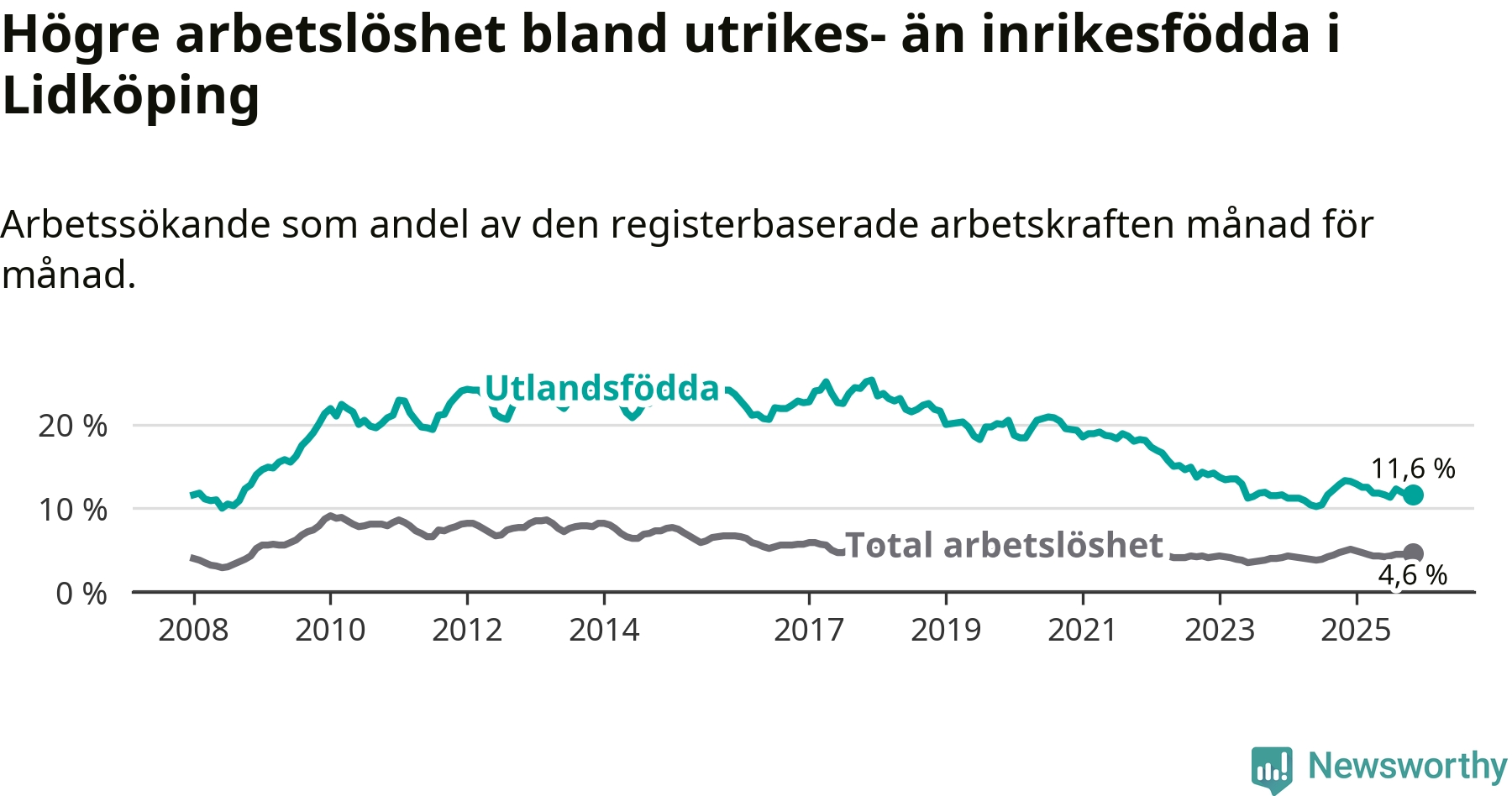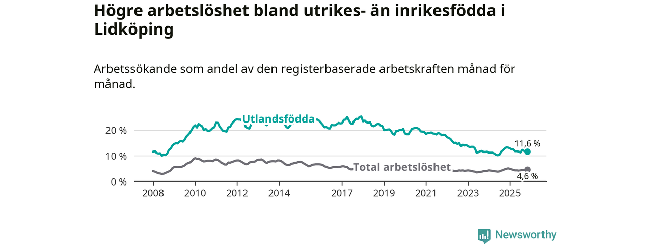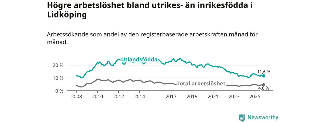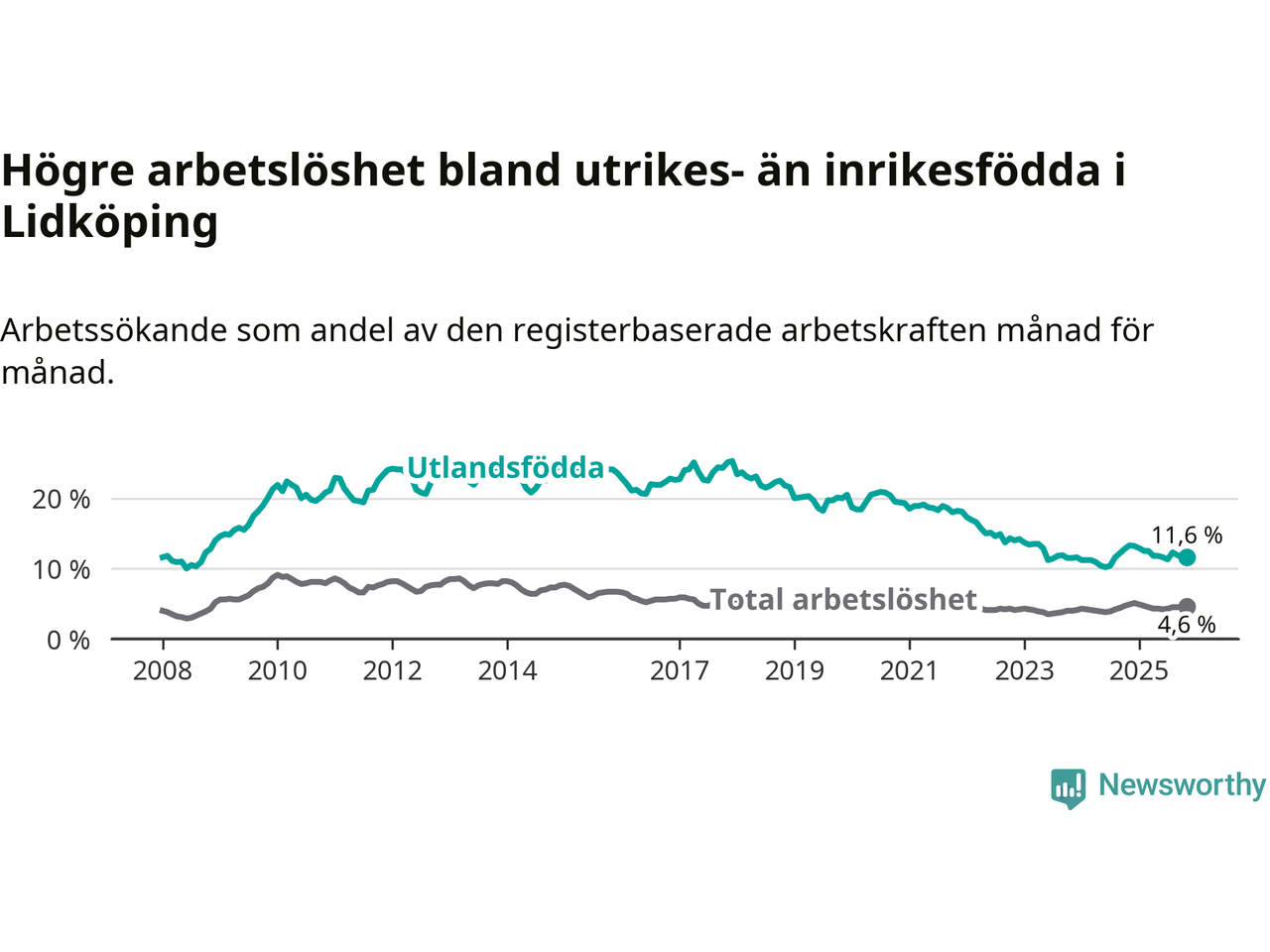 Arbetslösheten bland utlandsfödda var 11,6 procent i Lidköping under november månad, motsvarande 329 av 2 836 personer. Det är 1,7 procentenheter färre än vid samma tidpunkt i fjol (−40 om man räknar personer).