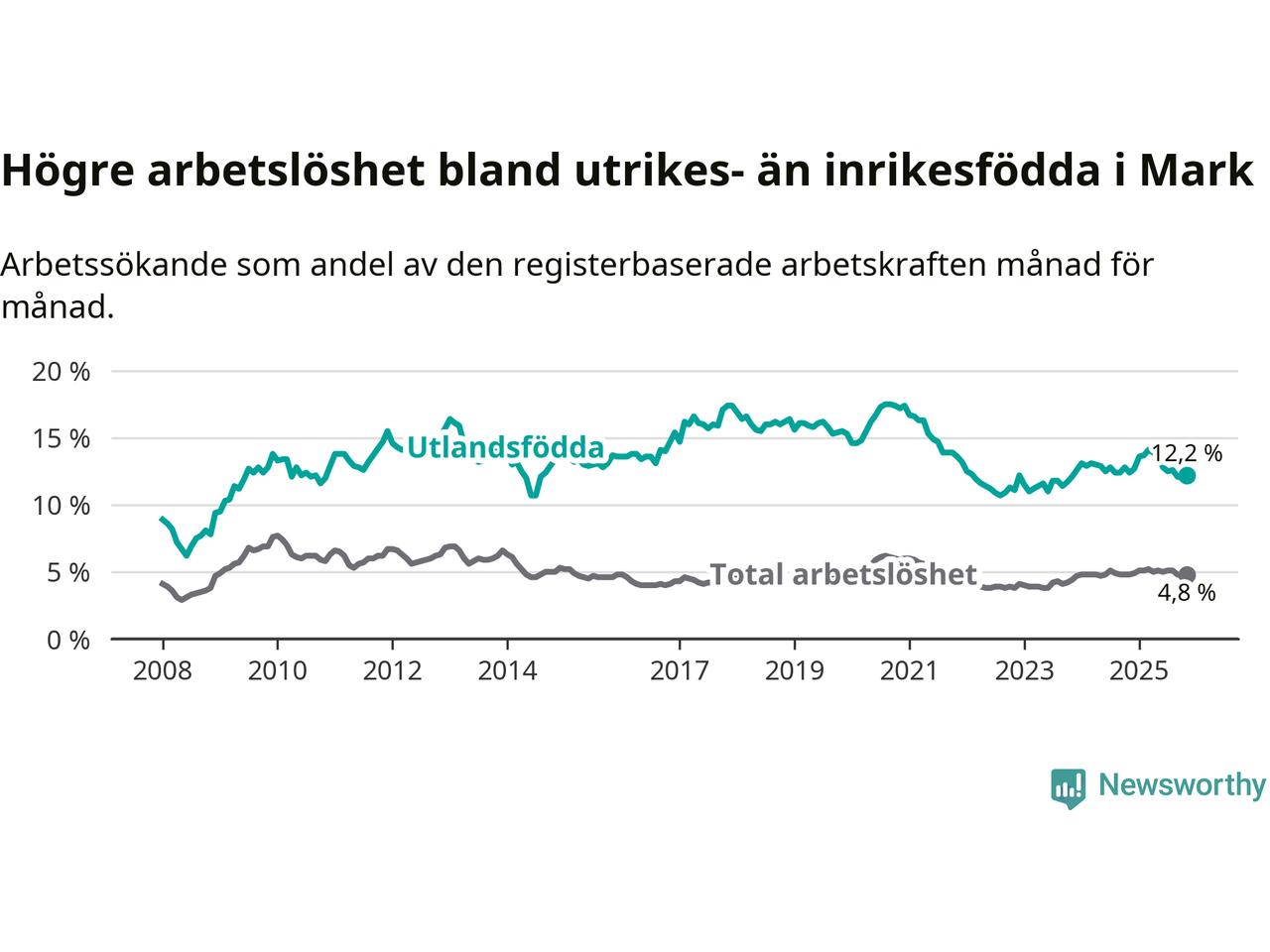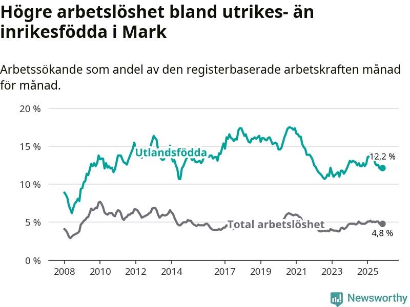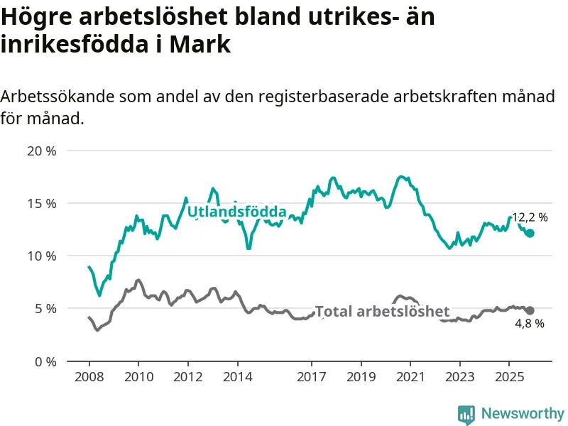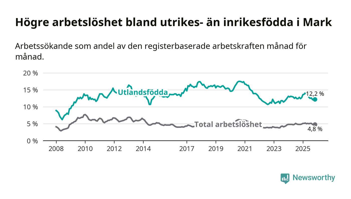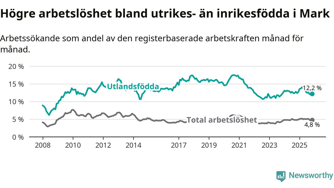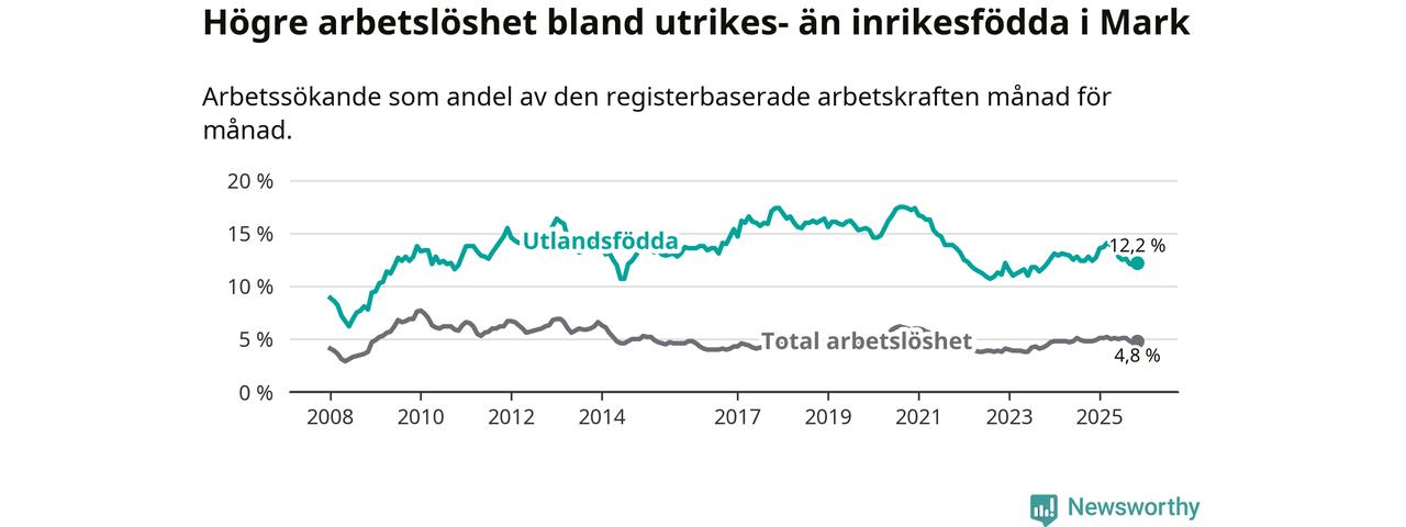 Arbetslösheten bland utlandsfödda var 12,2 procent i Mark under november månad, motsvarande 318 av 2 607 personer. Det är 0,2 procentenheter färre än vid samma tidpunkt i fjol (−5 om man räknar personer).