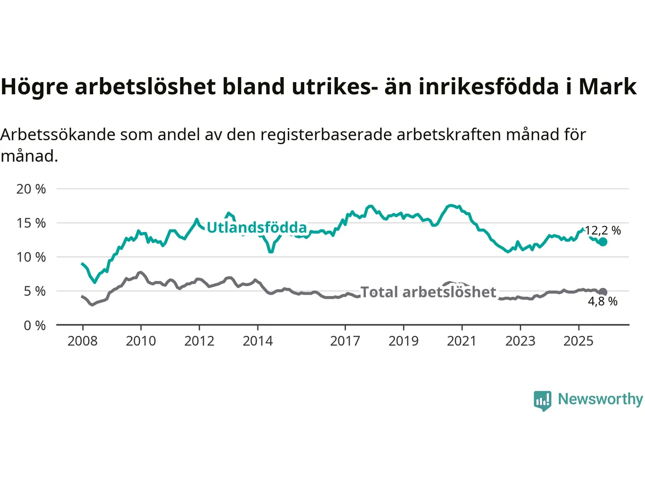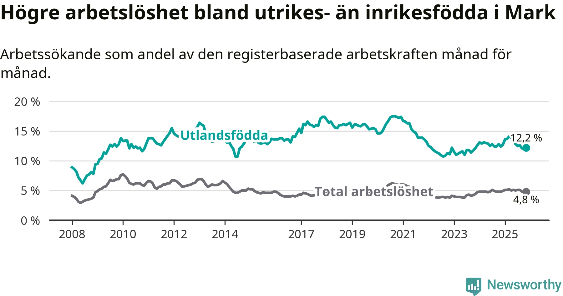 Graf: Skillnad i arbetslöshet mellan utrikesfödda och hela befolkningen i Marks kommun