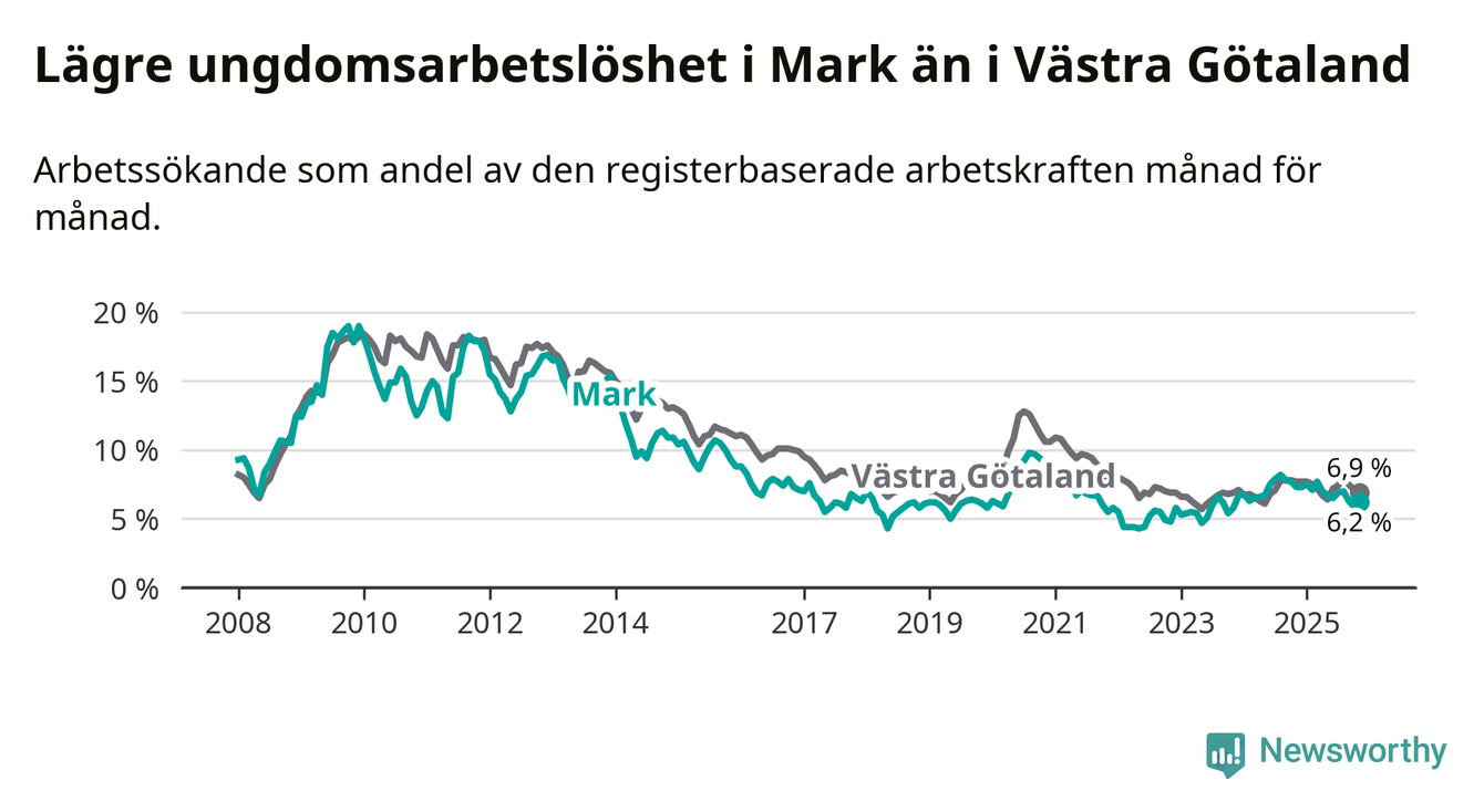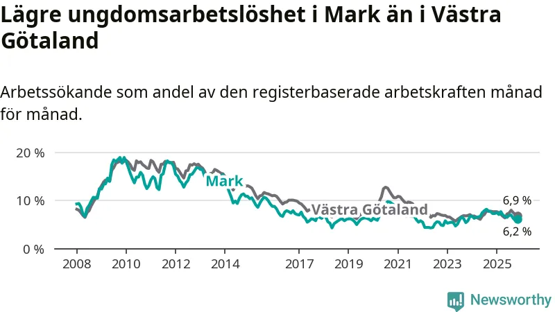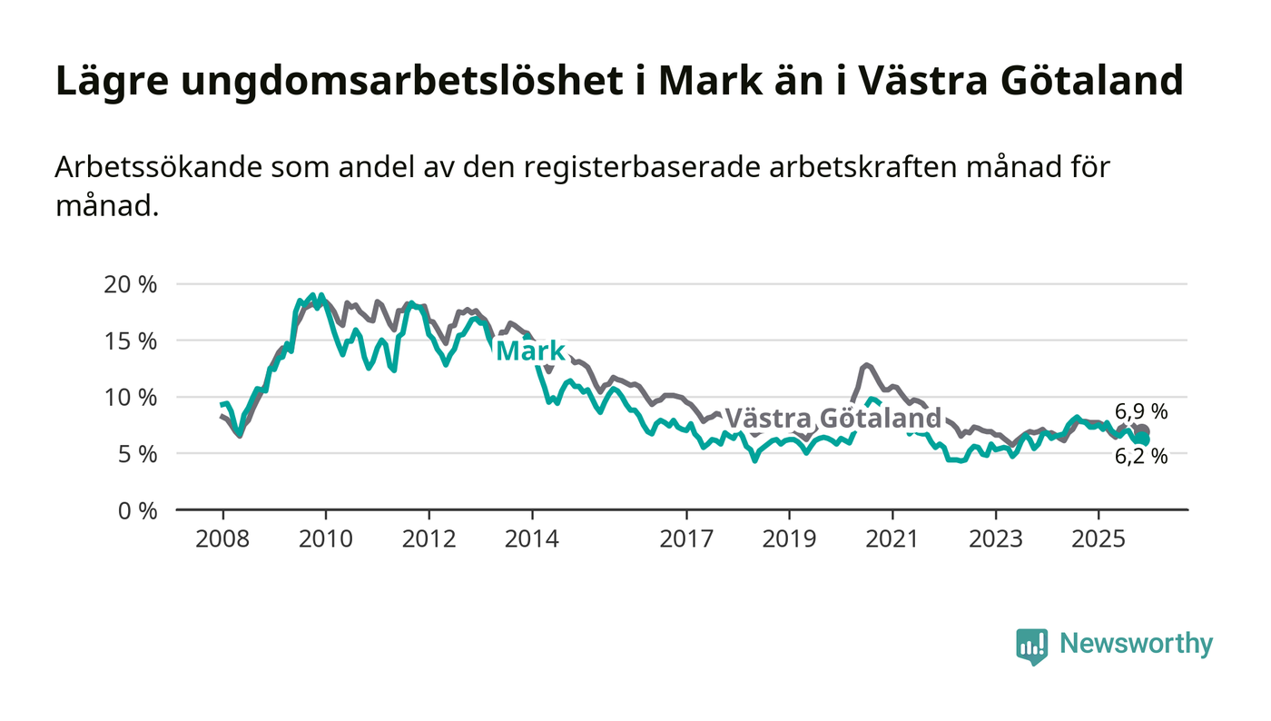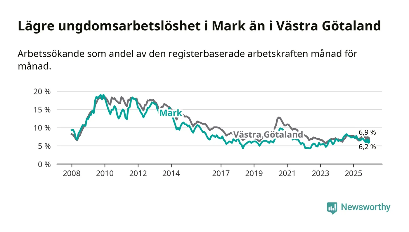 Precis som den totala arbetslösheten ligger ungdomsarbetslösheten i Mark lägre än i Västra Götaland som helhet. Skillnaden mellan kommunen och länet är 0,7 procentenheter.