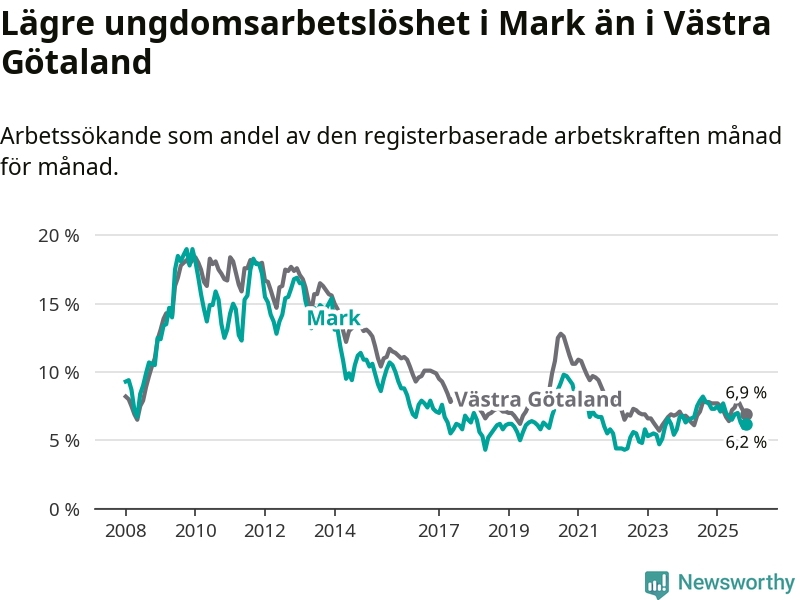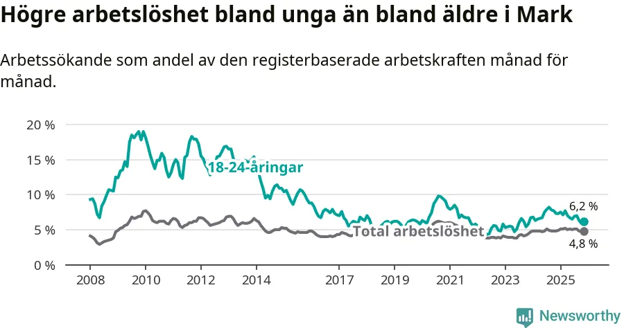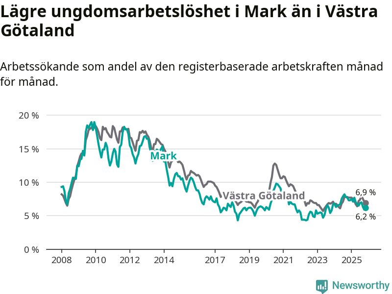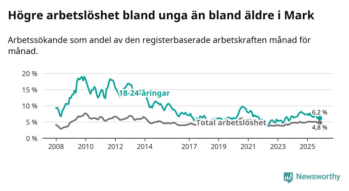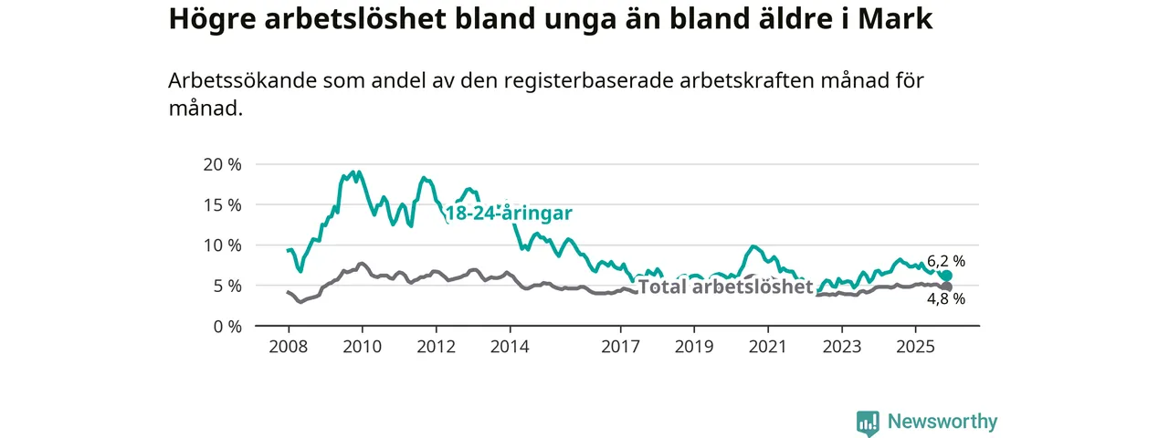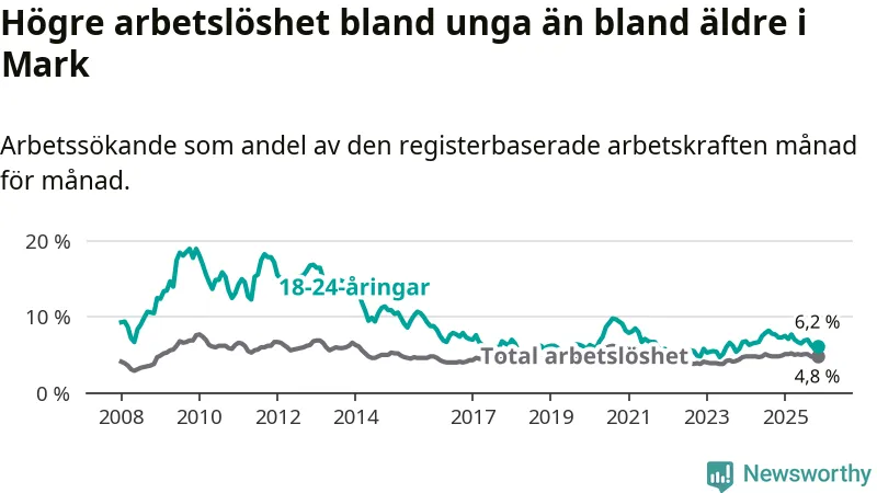 Precis som den totala arbetslösheten ligger ungdomsarbetslösheten i Mark lägre än i Västra Götaland som helhet. Skillnaden mellan kommunen och länet är 0,7 procentenheter.