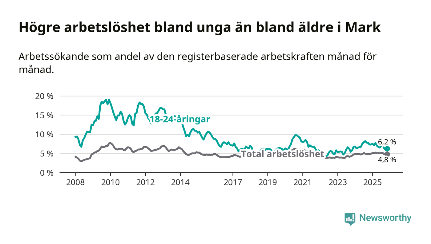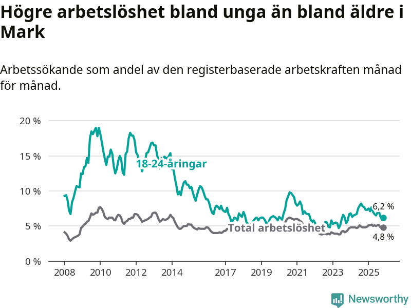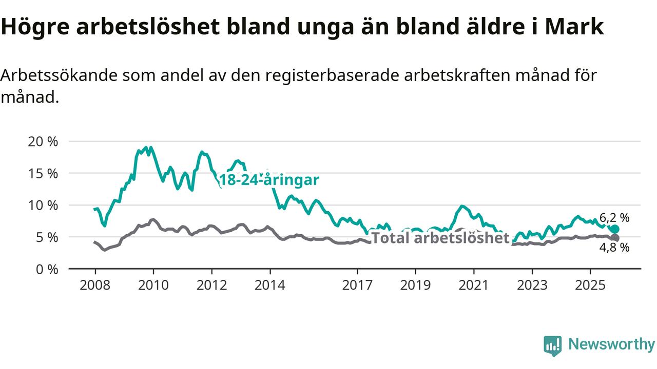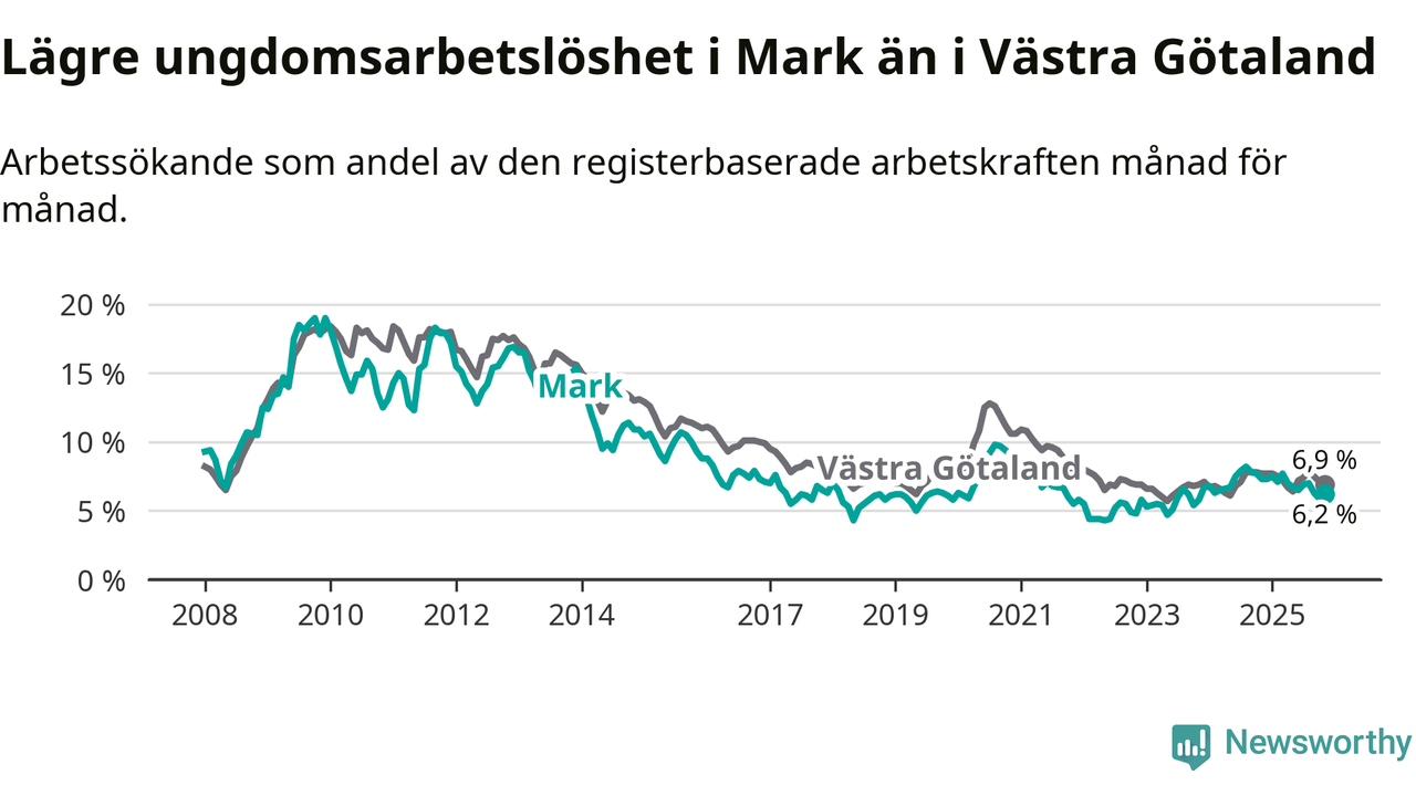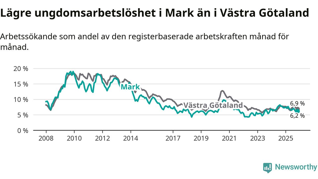 Graf: Arbetslöshet bland unga i Marks kommun och Västra Götalands län