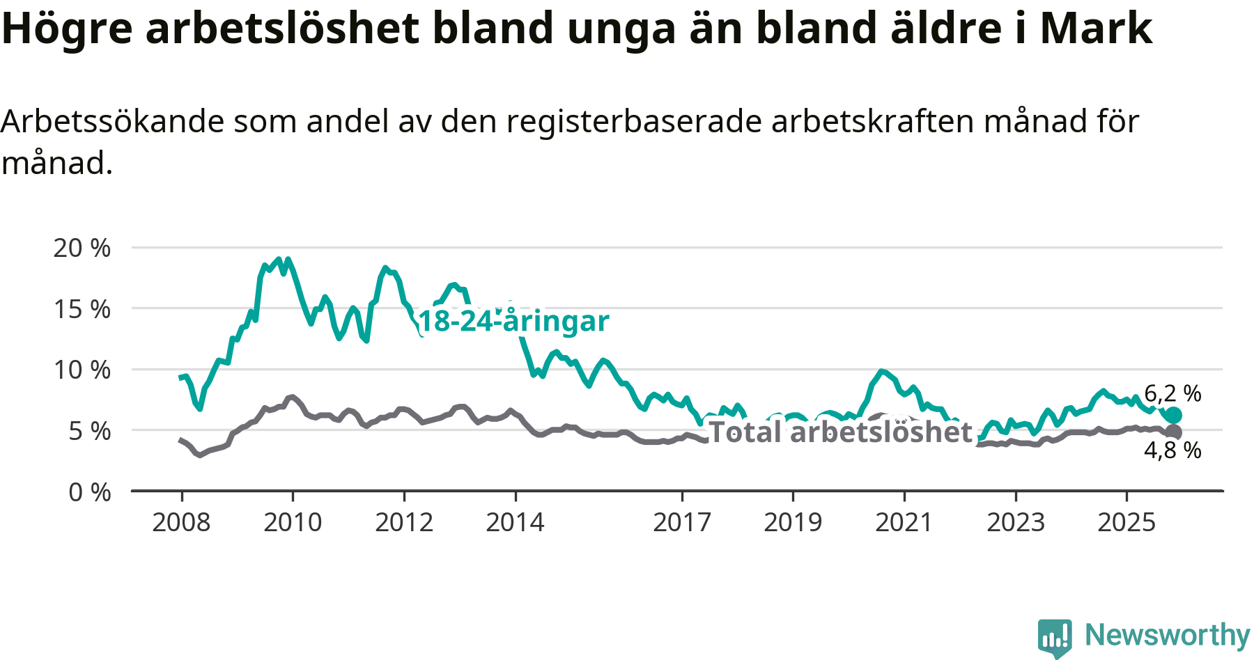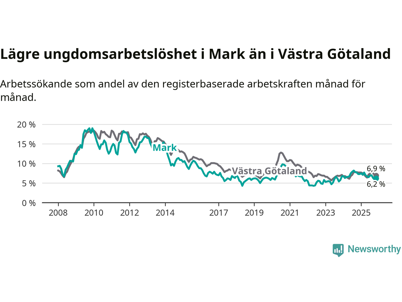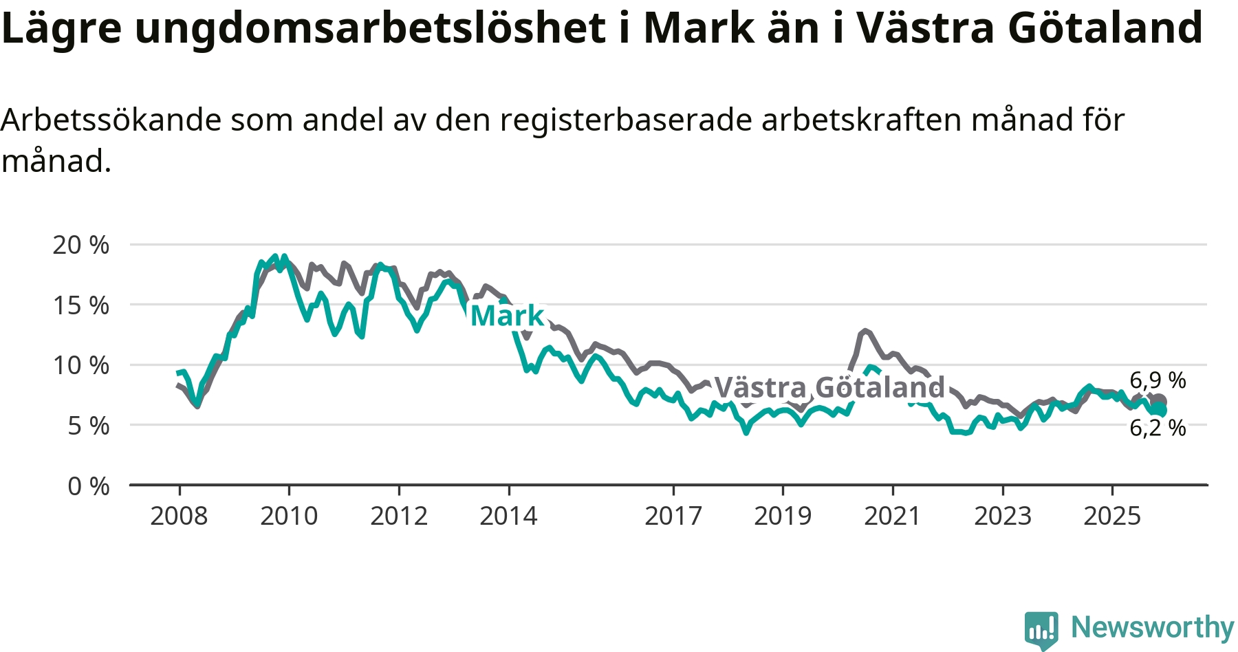 Graf: Arbetslöshet bland unga i Marks kommun och Västra Götalands län