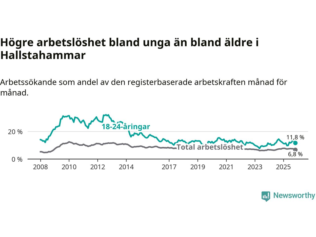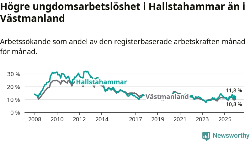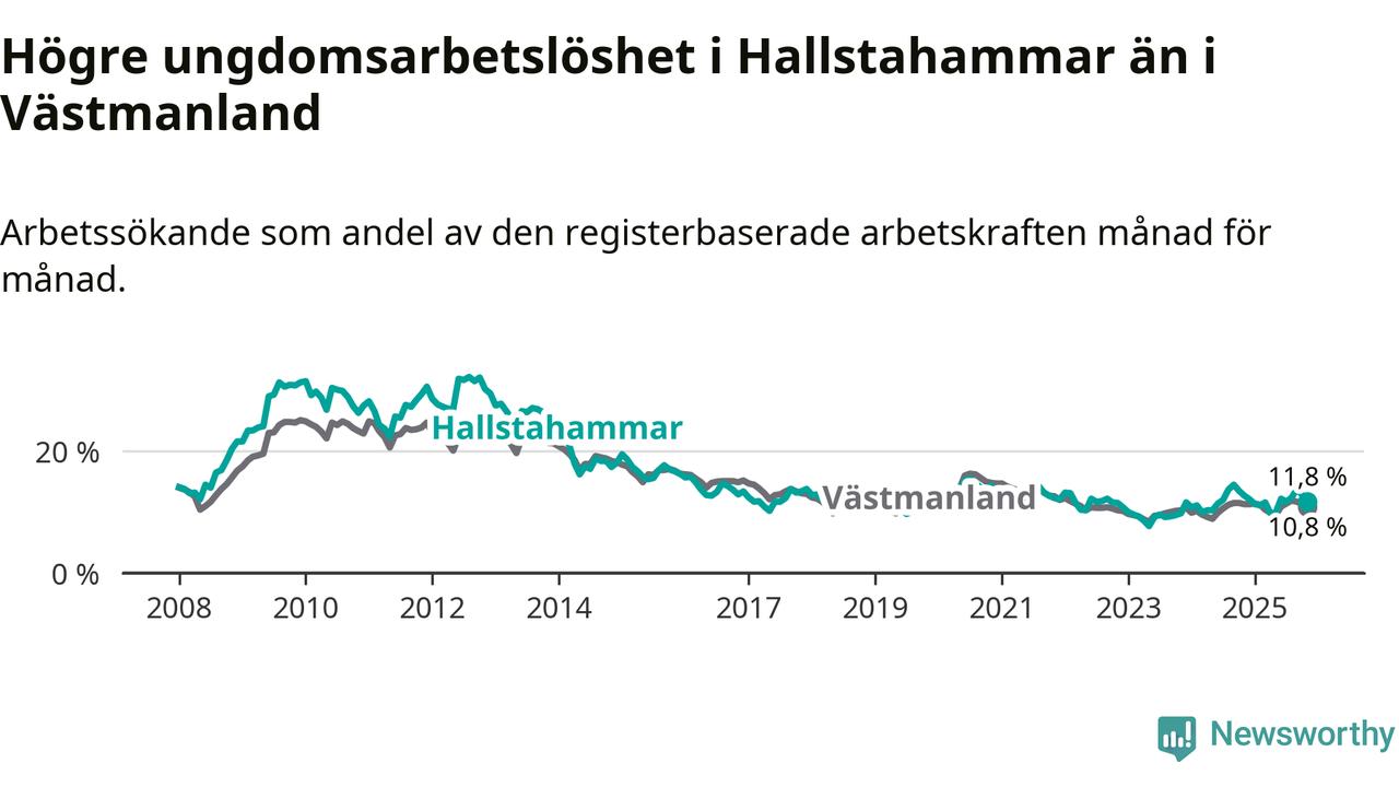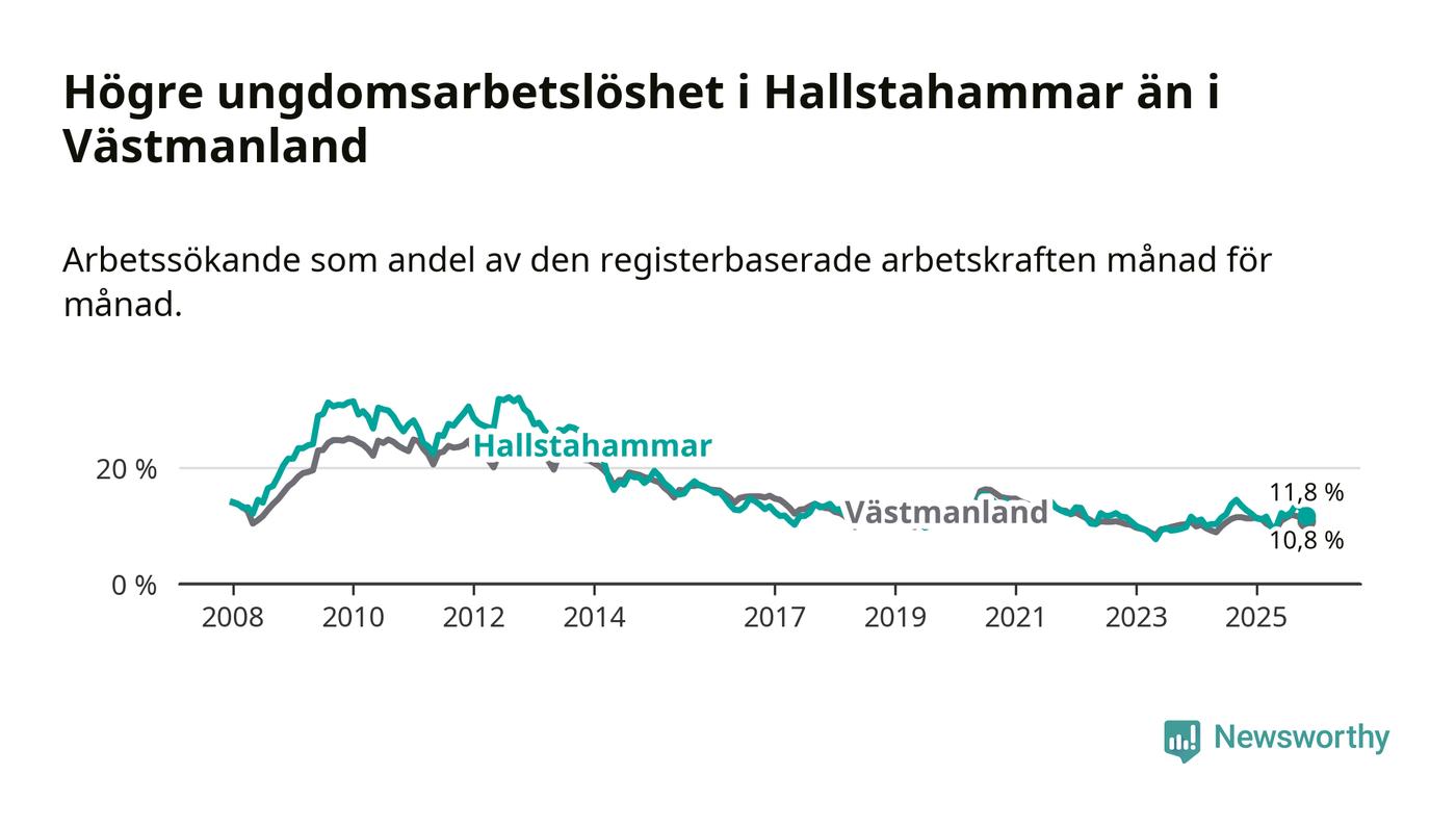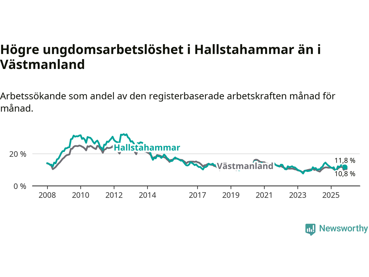 Medan Hallstahammar har lägre total arbetslöshet än Västmanland, ligger ungdomsarbetslösheten 1,0 procentenheter högre i Hallstahammar.