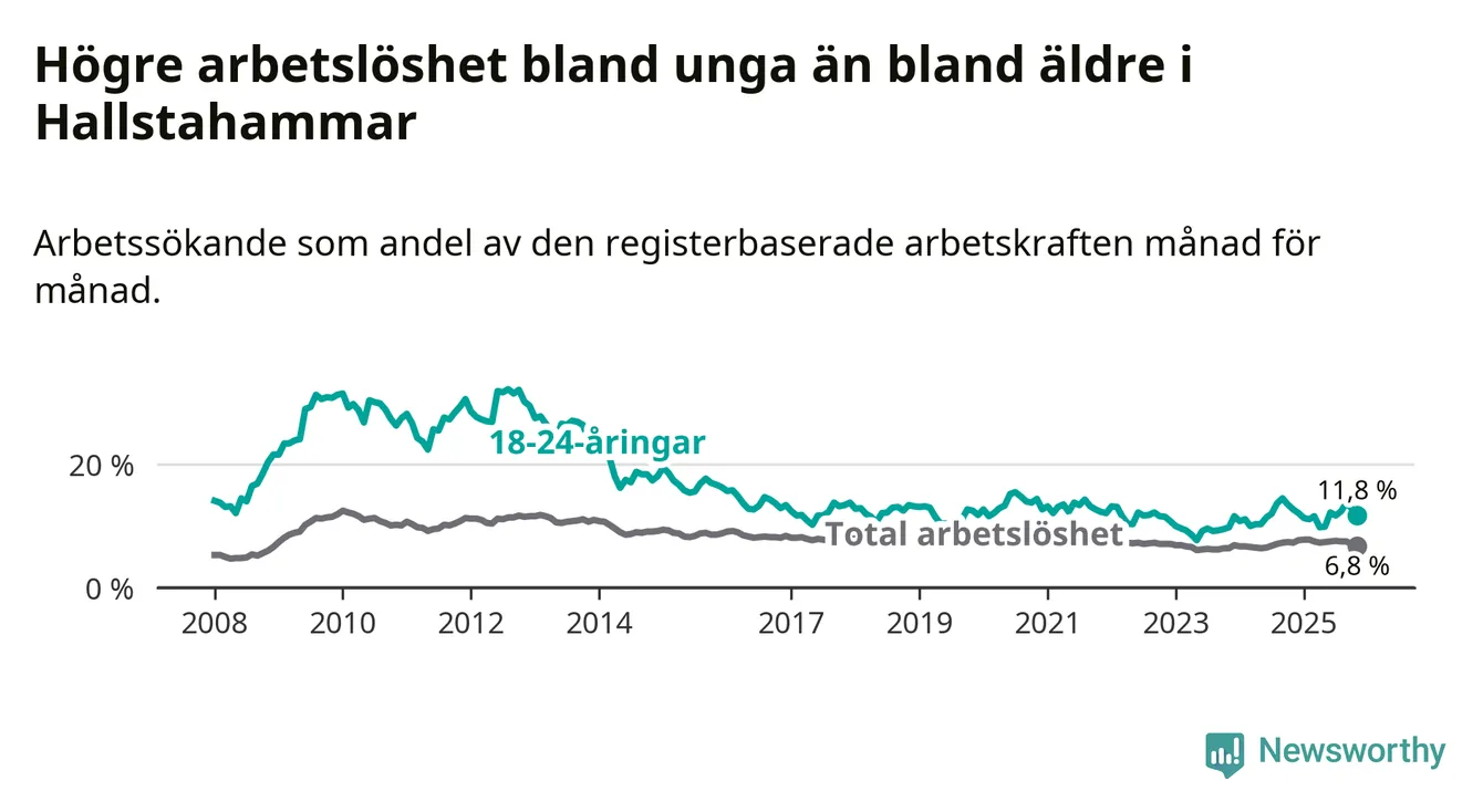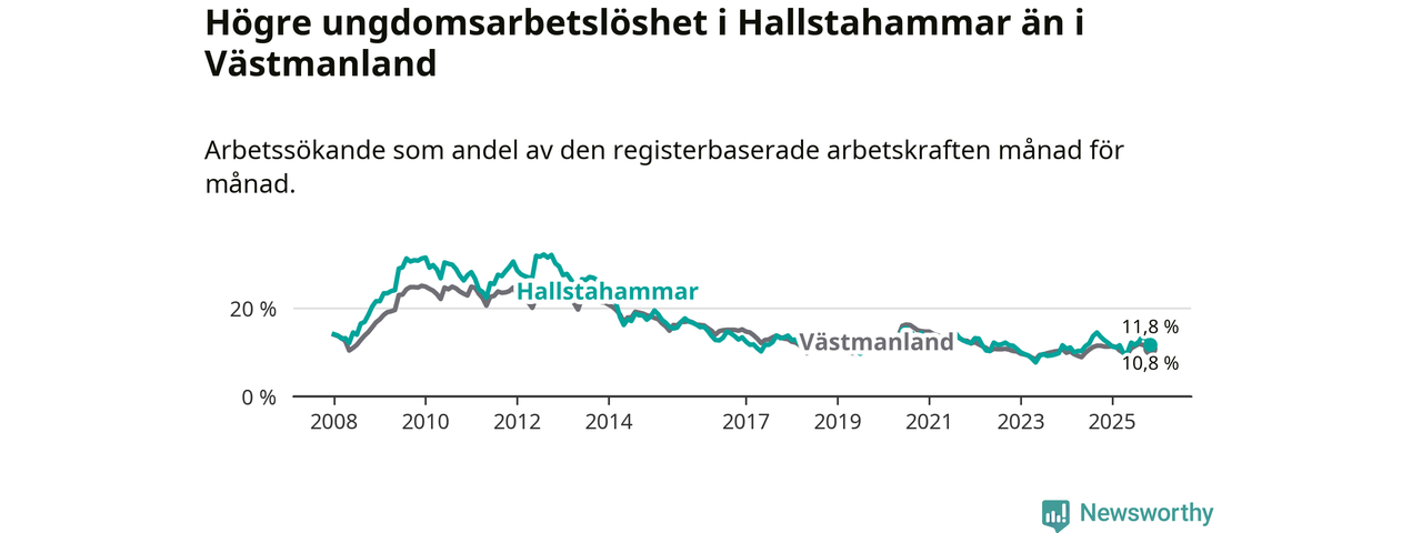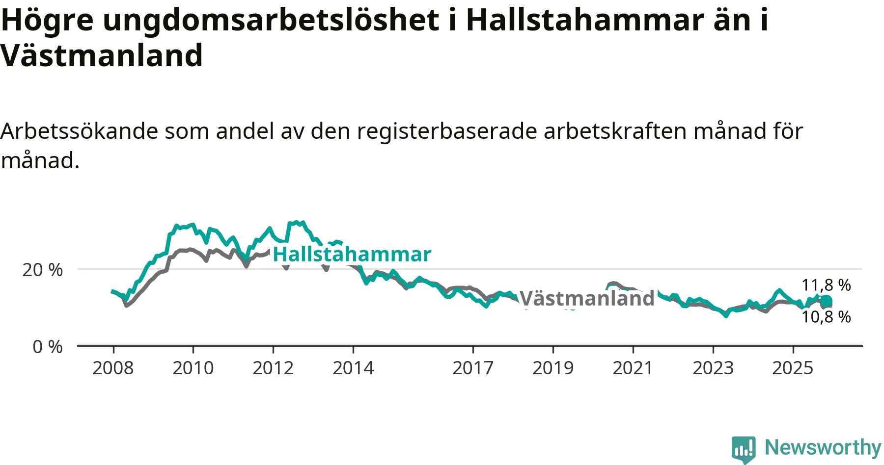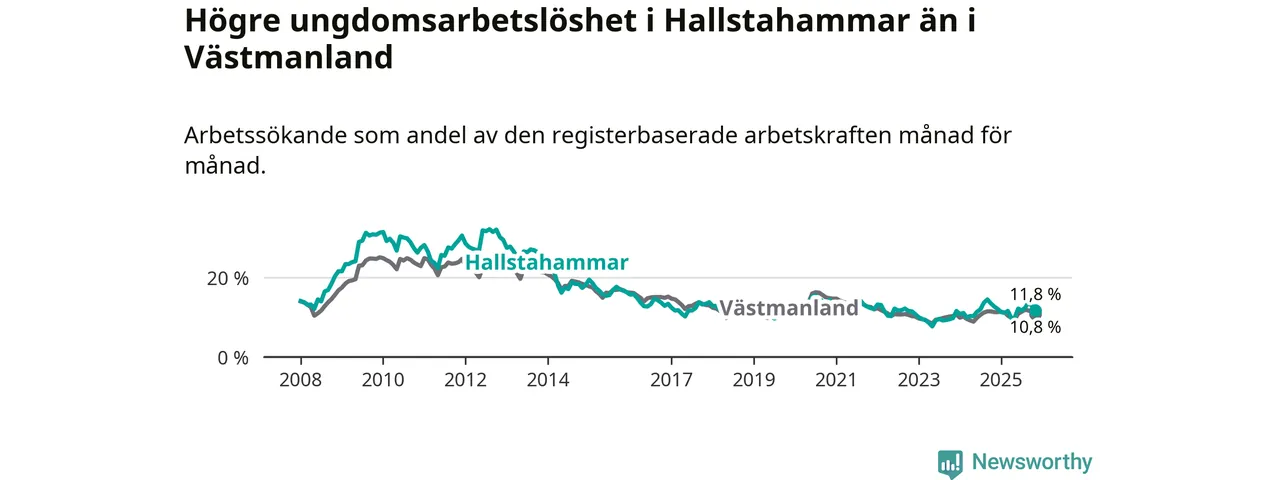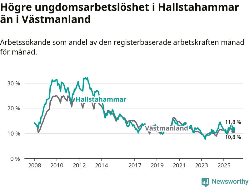 Medan Hallstahammar har lägre total arbetslöshet än Västmanland, ligger ungdomsarbetslösheten 1,0 procentenheter högre i Hallstahammar.