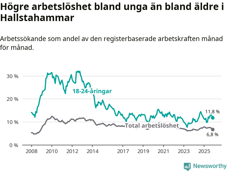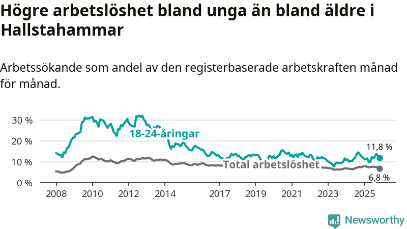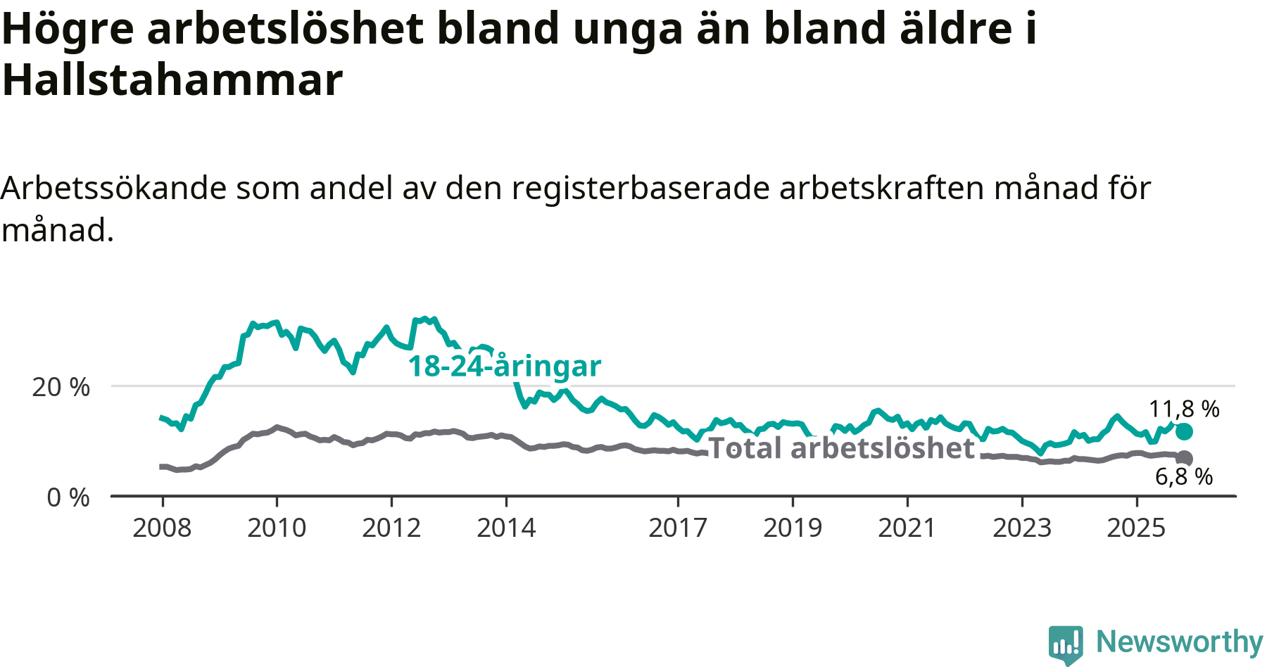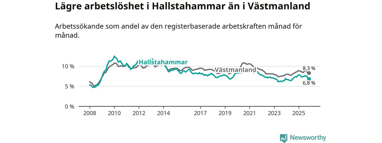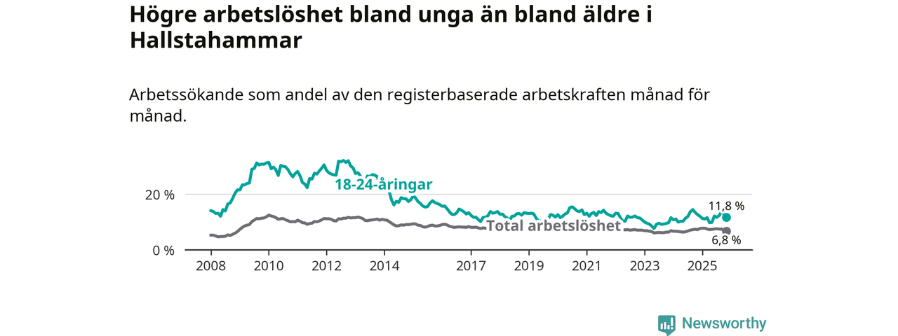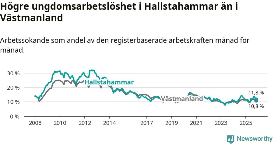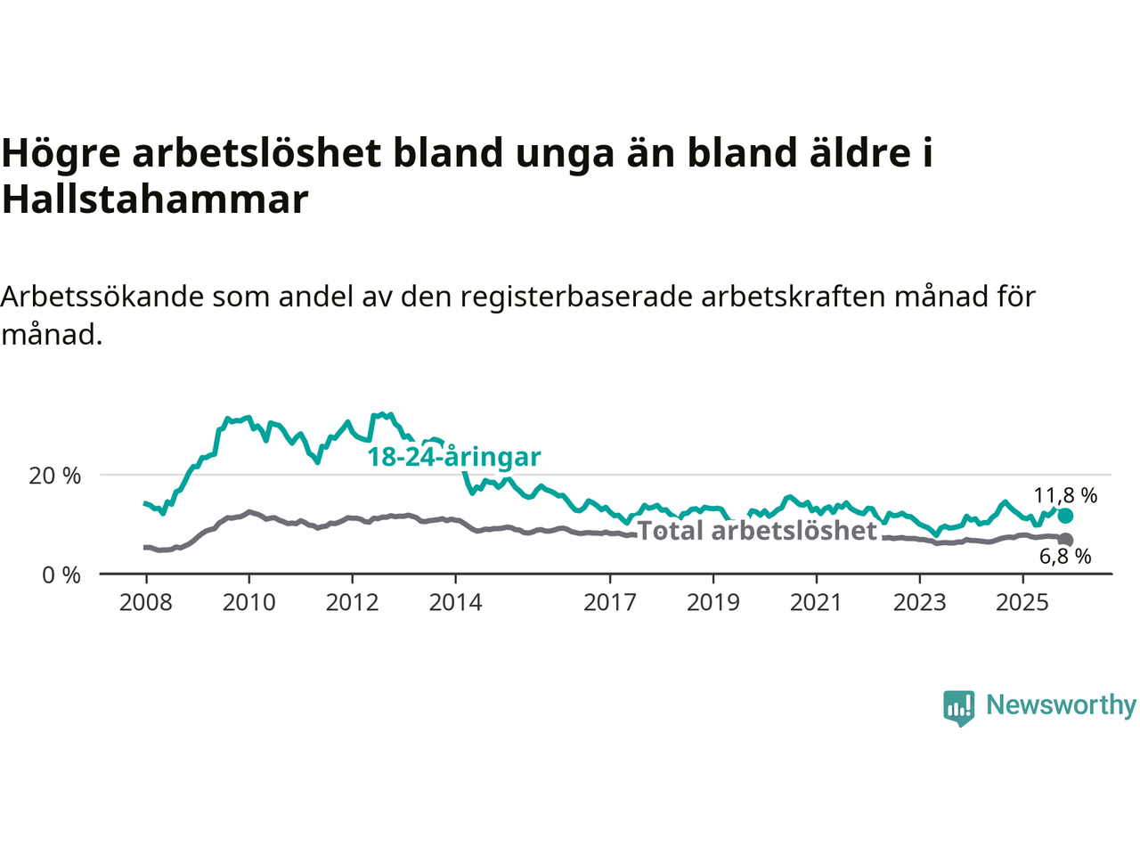 Medan Hallstahammar har lägre total arbetslöshet än Västmanland, ligger ungdomsarbetslösheten 1,0 procentenheter högre i Hallstahammar.