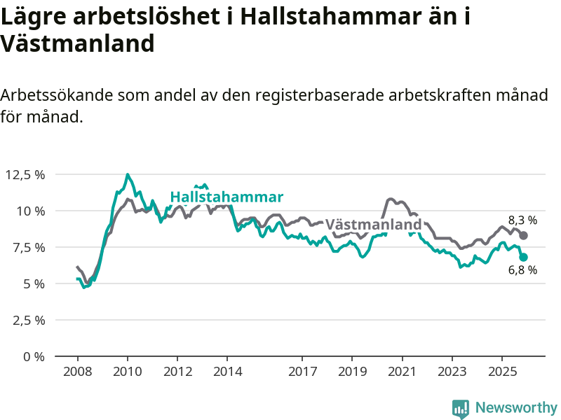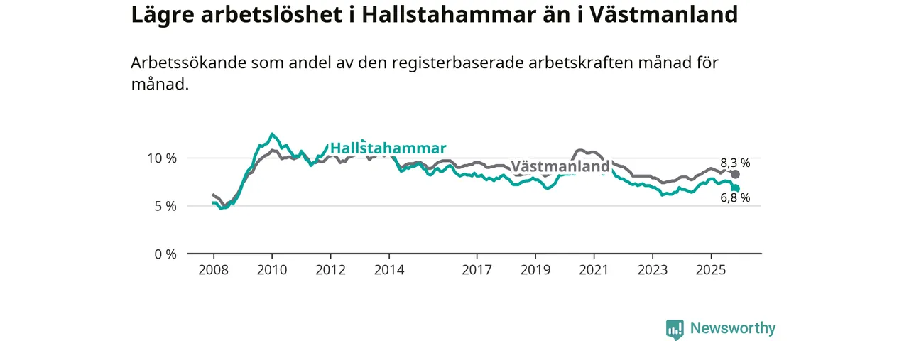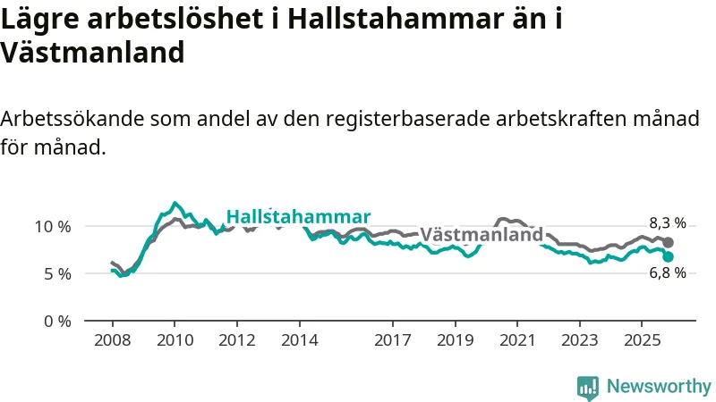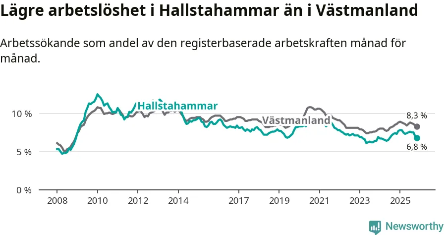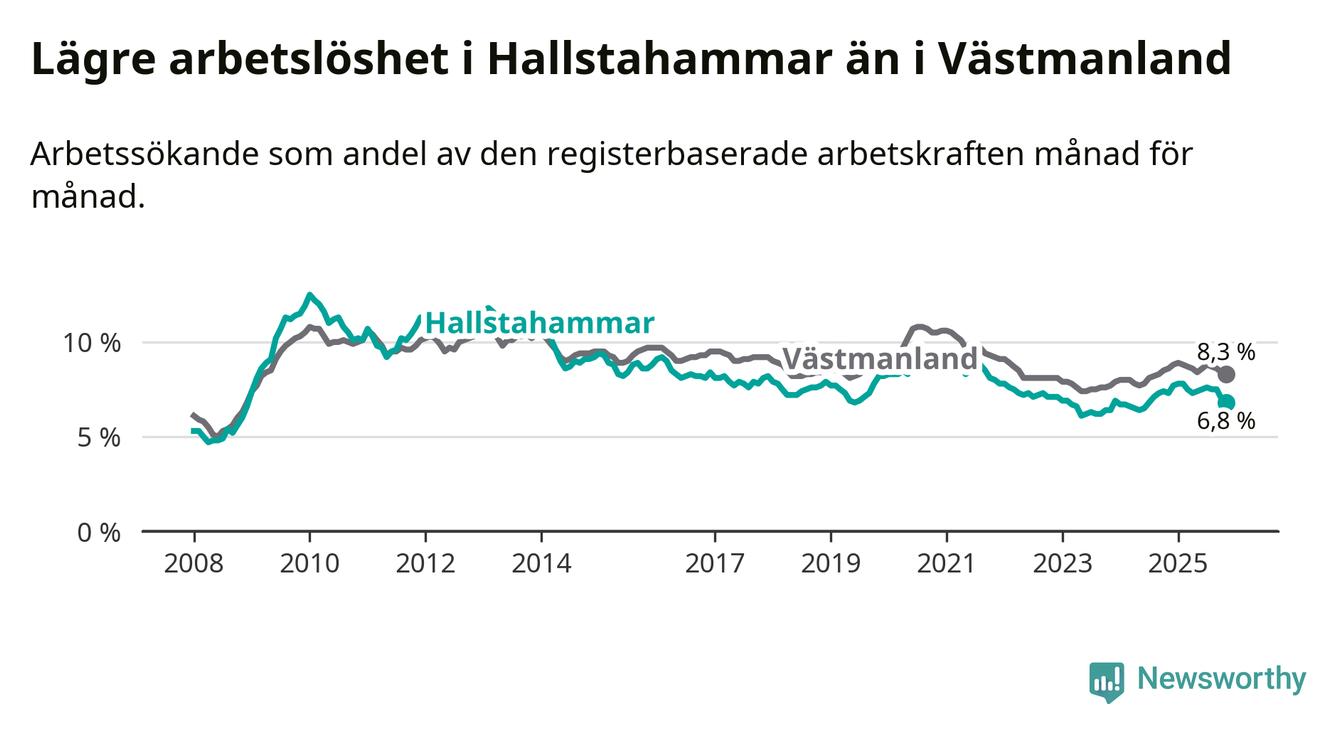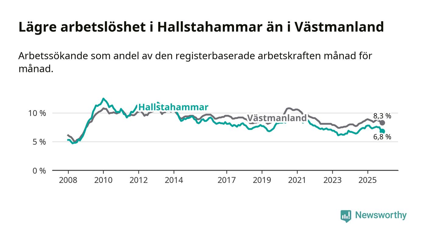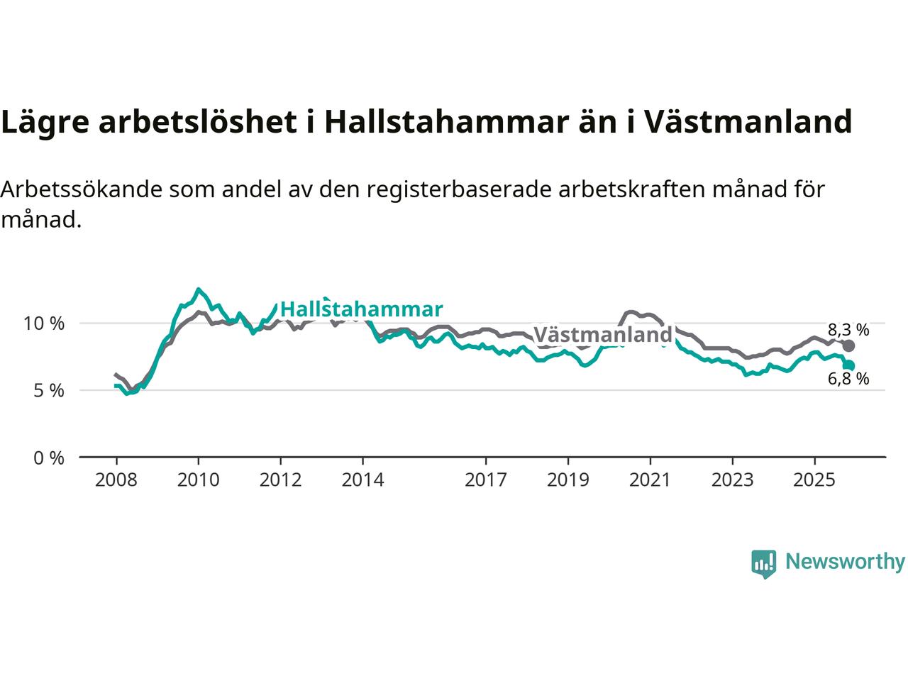 Under november månad rapporterade Hallstahammars kommun en total arbetslöshet på 6,8 procent. Det är en minskning jämfört med samma tidpunkt i fjol (−0,5 procentenheter). Även i Västmanlands län sjunker arbetslösheten .