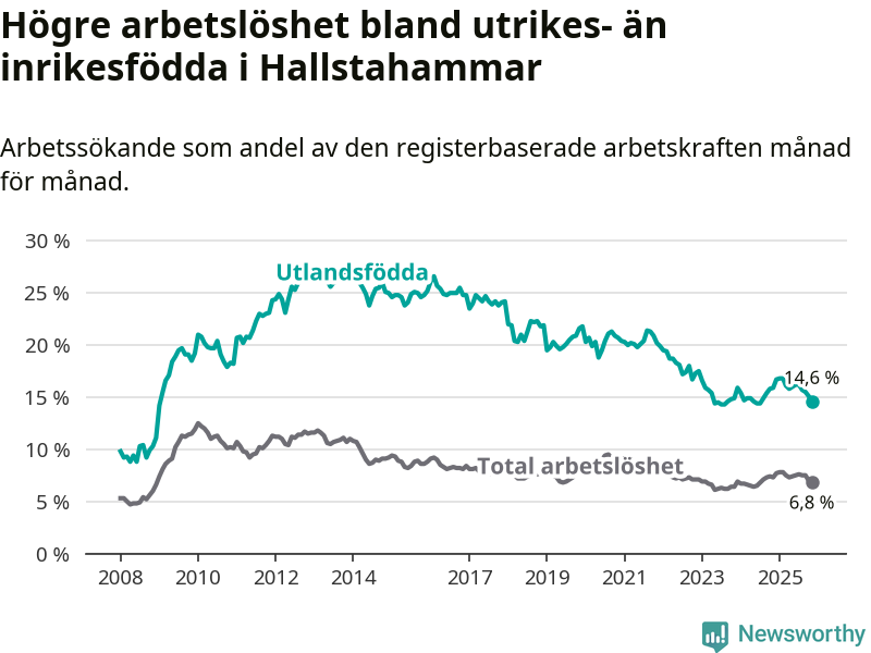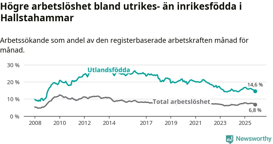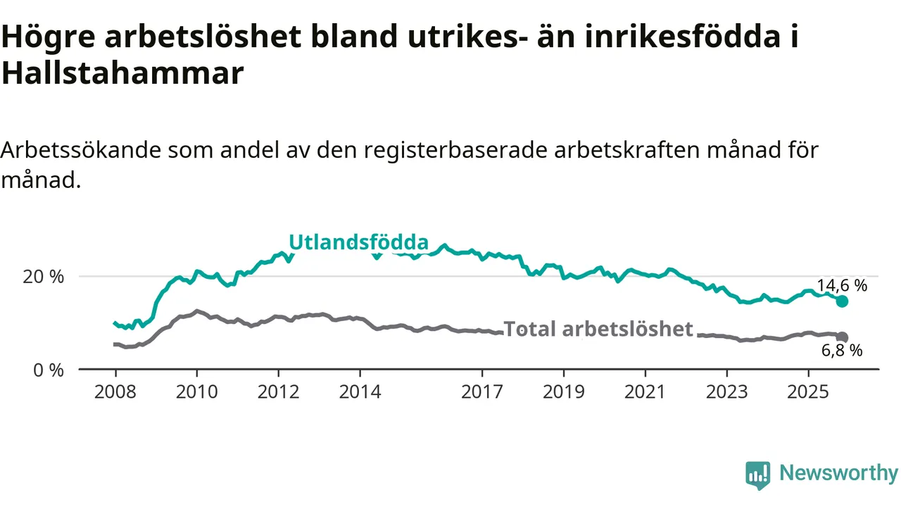 Arbetslösheten bland utlandsfödda var 14,6 procent i Hallstahammar under november månad, motsvarande 241 av 1 651 personer. Det är 1,3 procentenheter färre än vid samma tidpunkt i fjol (−20 om man räknar personer).