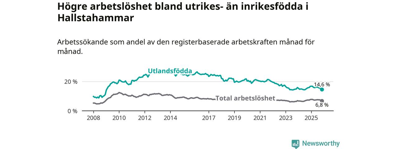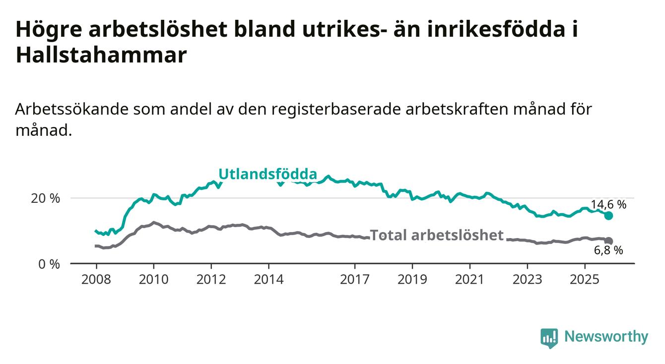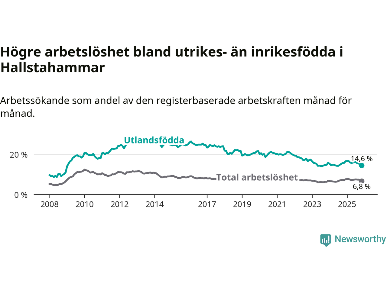 Skillnaden i arbetslöshet mellan utrikesfödda och hela befolkningen är 7,8 procentenheter i Hallstahammar. Det är en mindre skillnad än för ett år sedan (−0,8 procentenheter).