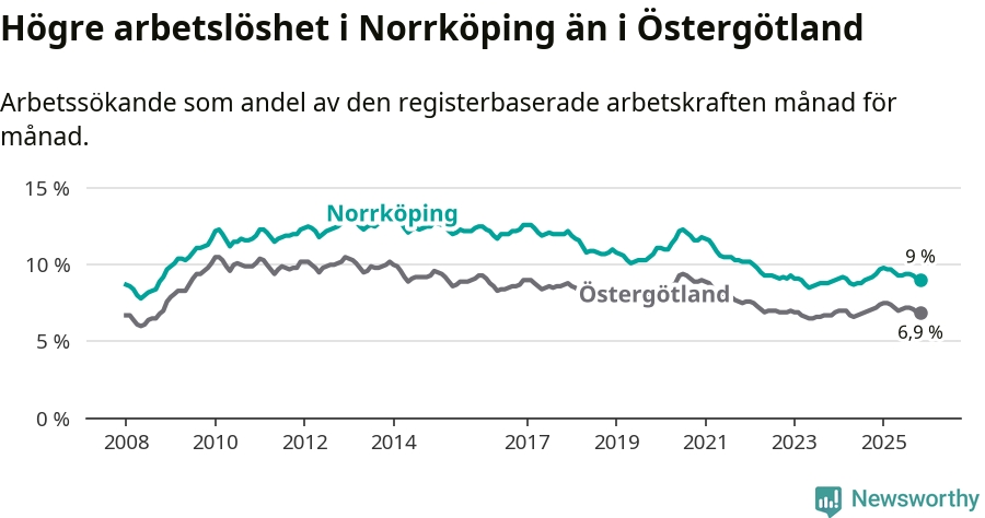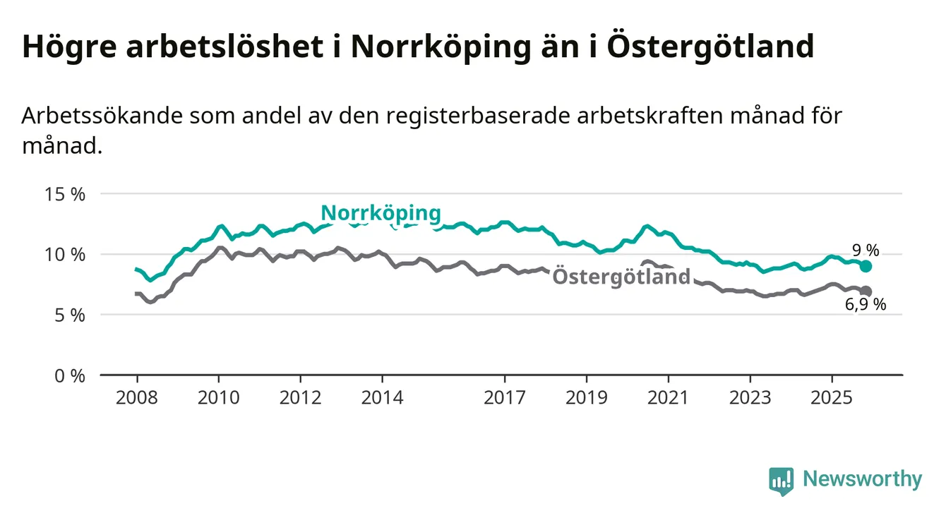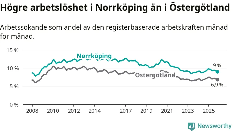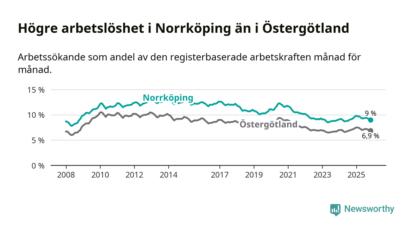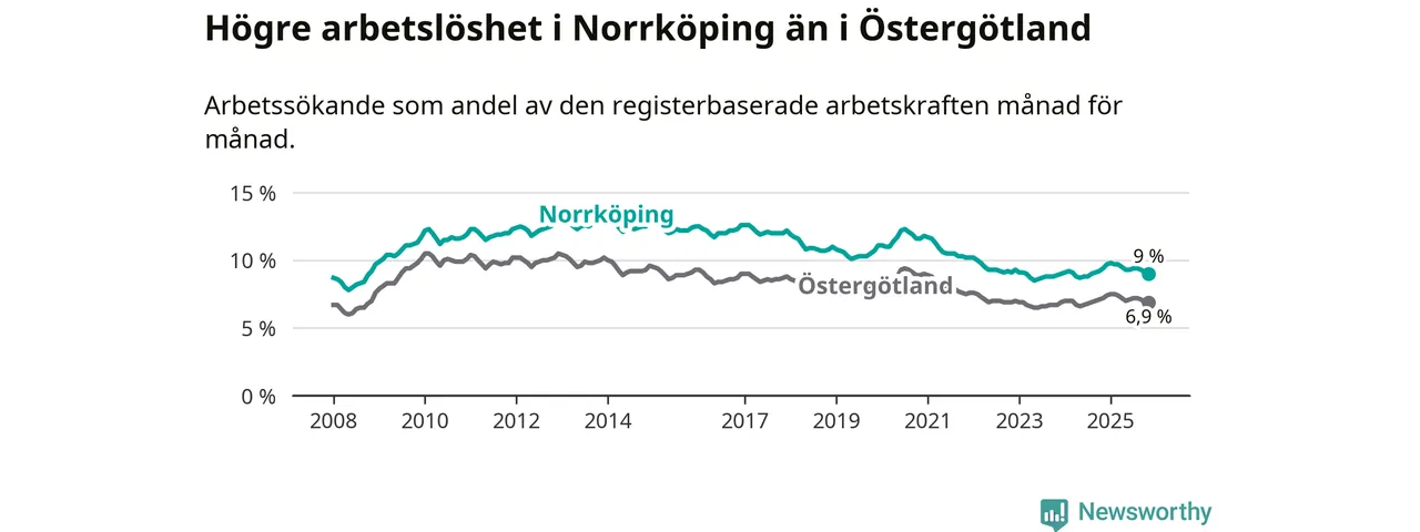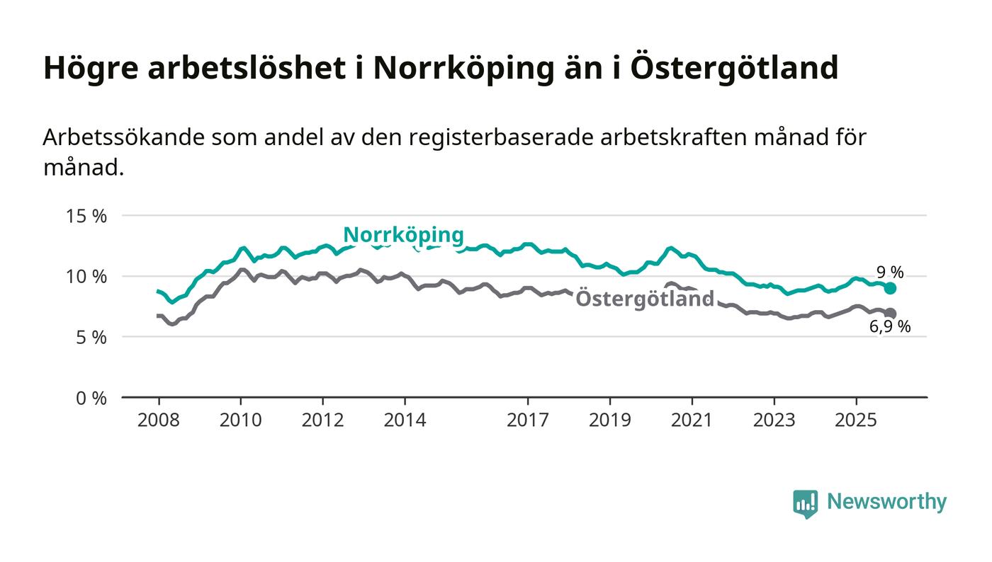 Även om arbetslösheten i Norrköping alltså minskar, så ligger den fortfarande över snittet i hela Östergötlands län (9,0 procent i kommunen, jämfört med 6,9 procent i hela länet). Norrköping har därmed även den högsta arbetslöshetsnivån i länet. Ydre har den lägsta (3,1 procent). För att Norrköping skulle komma ner i samma arbetslöshetsnivå som Ydre skulle 4 385 personer behöva sysselsättas.