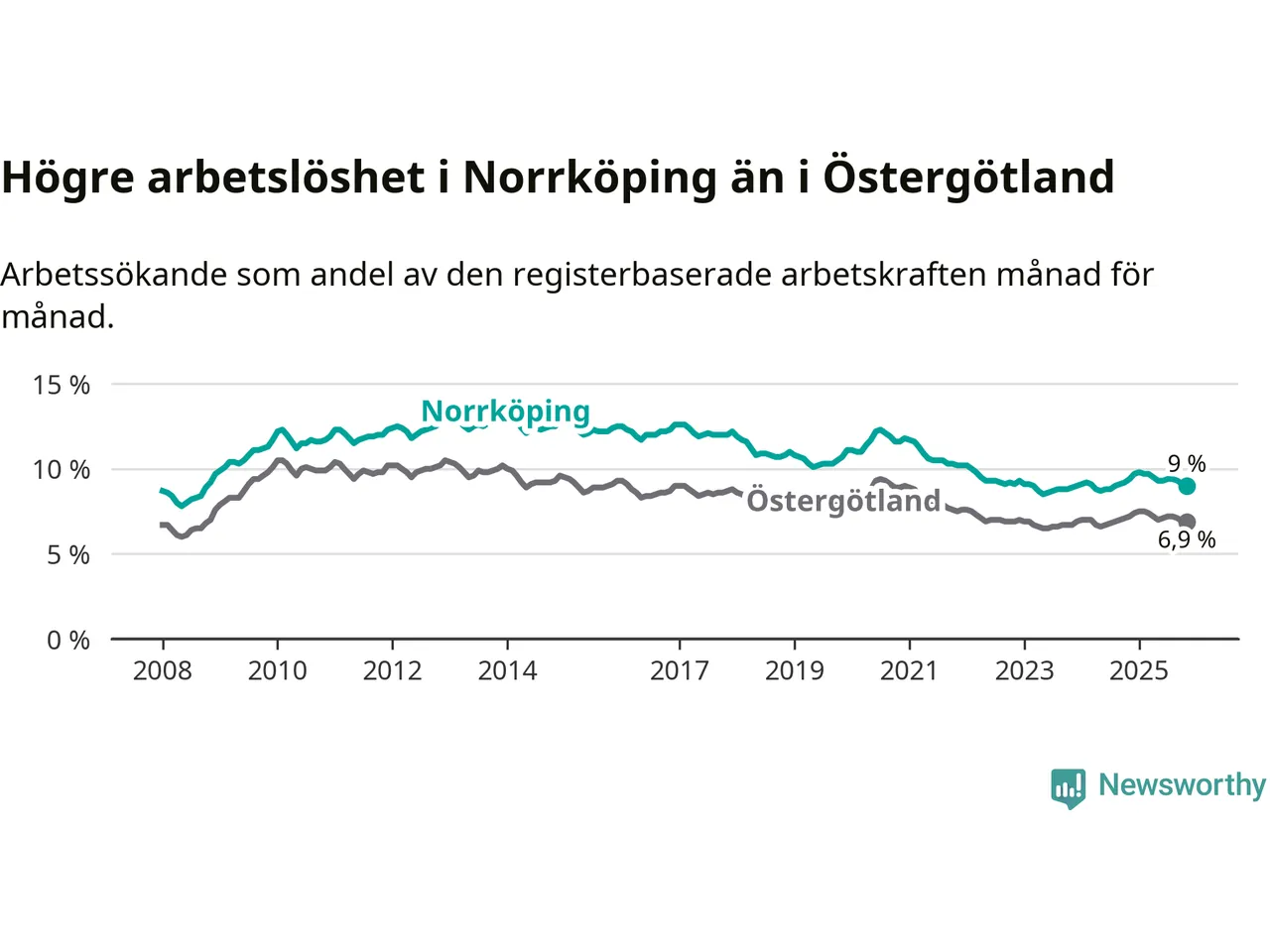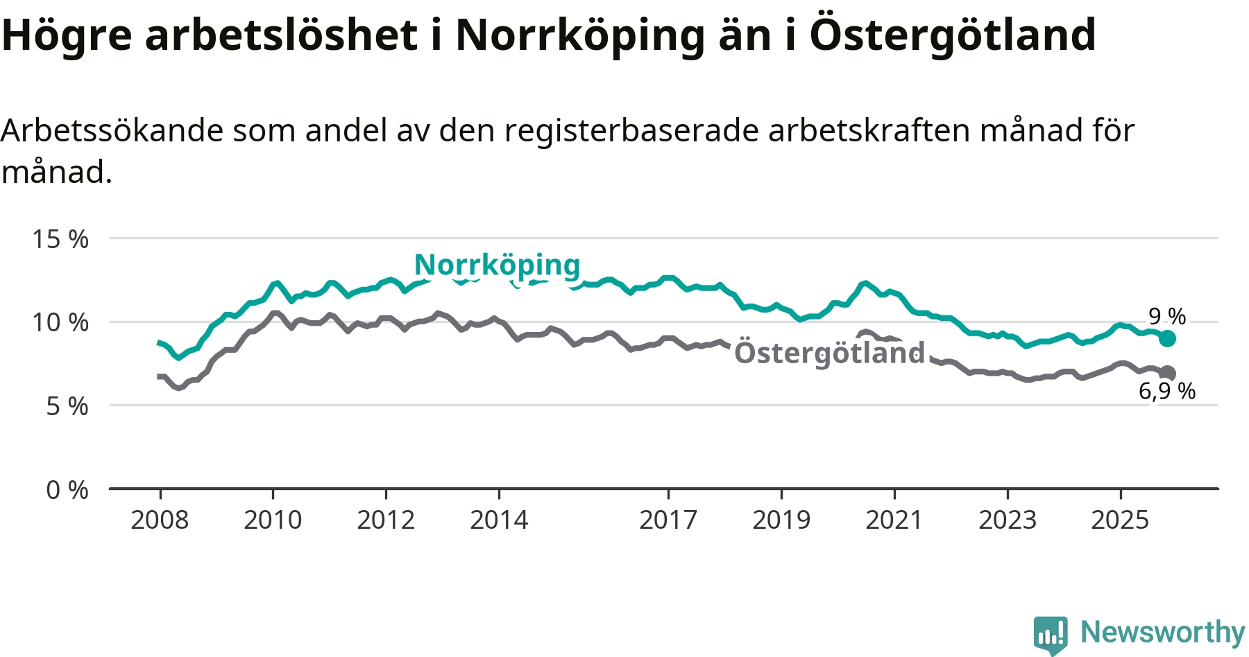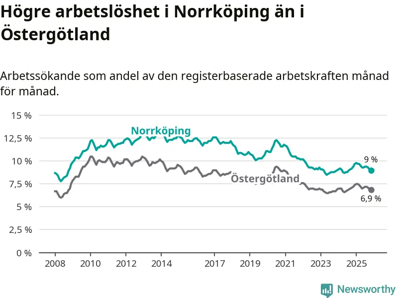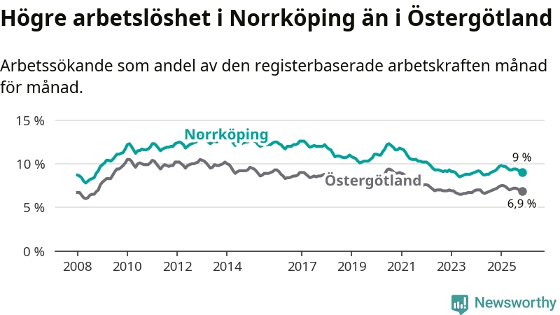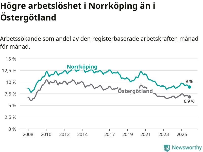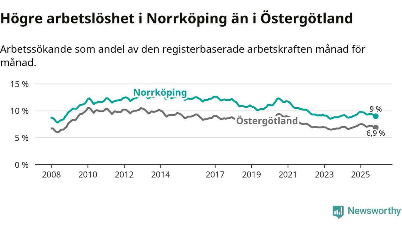 Även om arbetslösheten i Norrköping alltså minskar, så ligger den fortfarande över snittet i hela Östergötlands län (9,0 procent i kommunen, jämfört med 6,9 procent i hela länet). Norrköping har därmed även den högsta arbetslöshetsnivån i länet. Ydre har den lägsta (3,1 procent). För att Norrköping skulle komma ner i samma arbetslöshetsnivå som Ydre skulle 4 385 personer behöva sysselsättas.