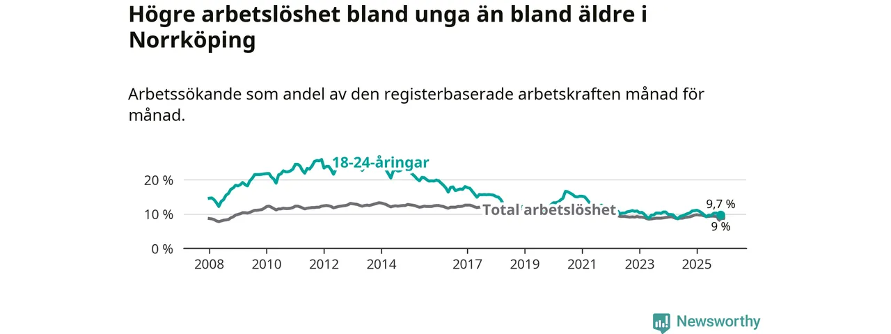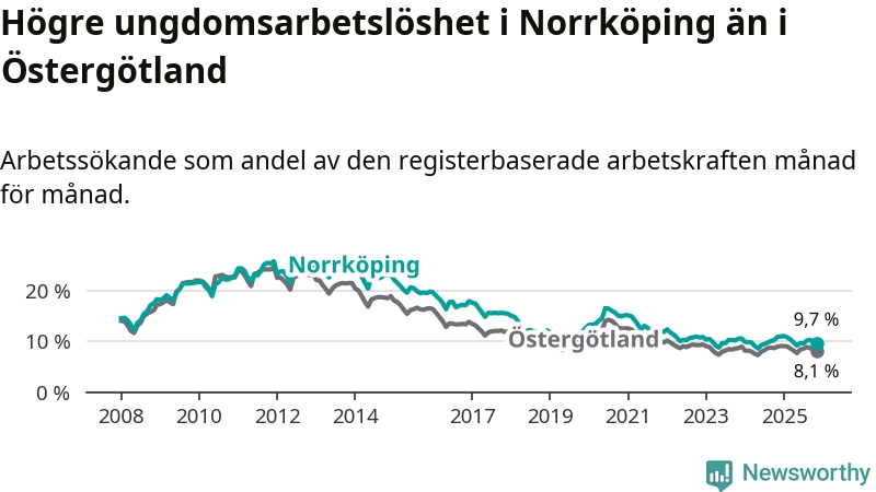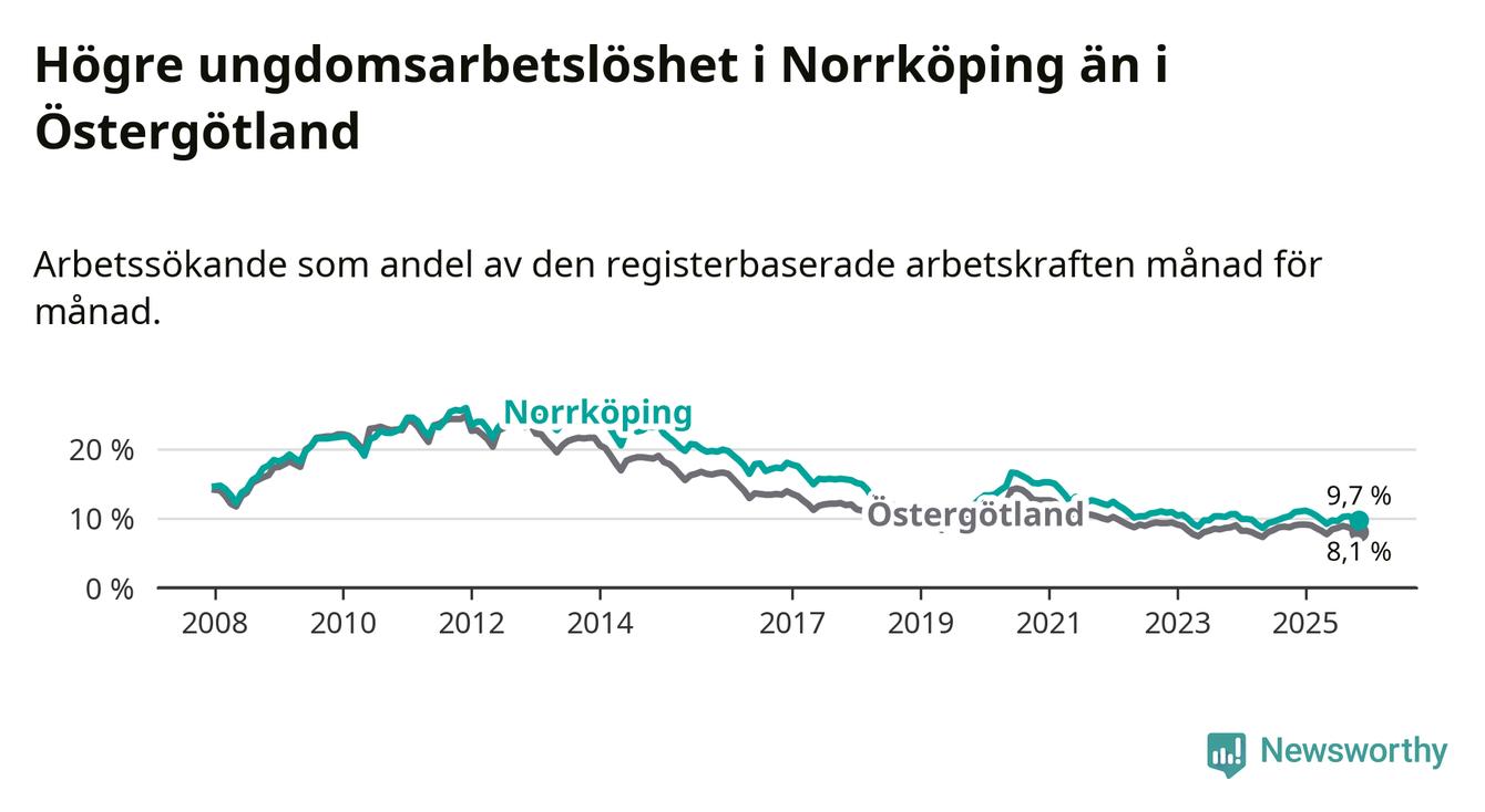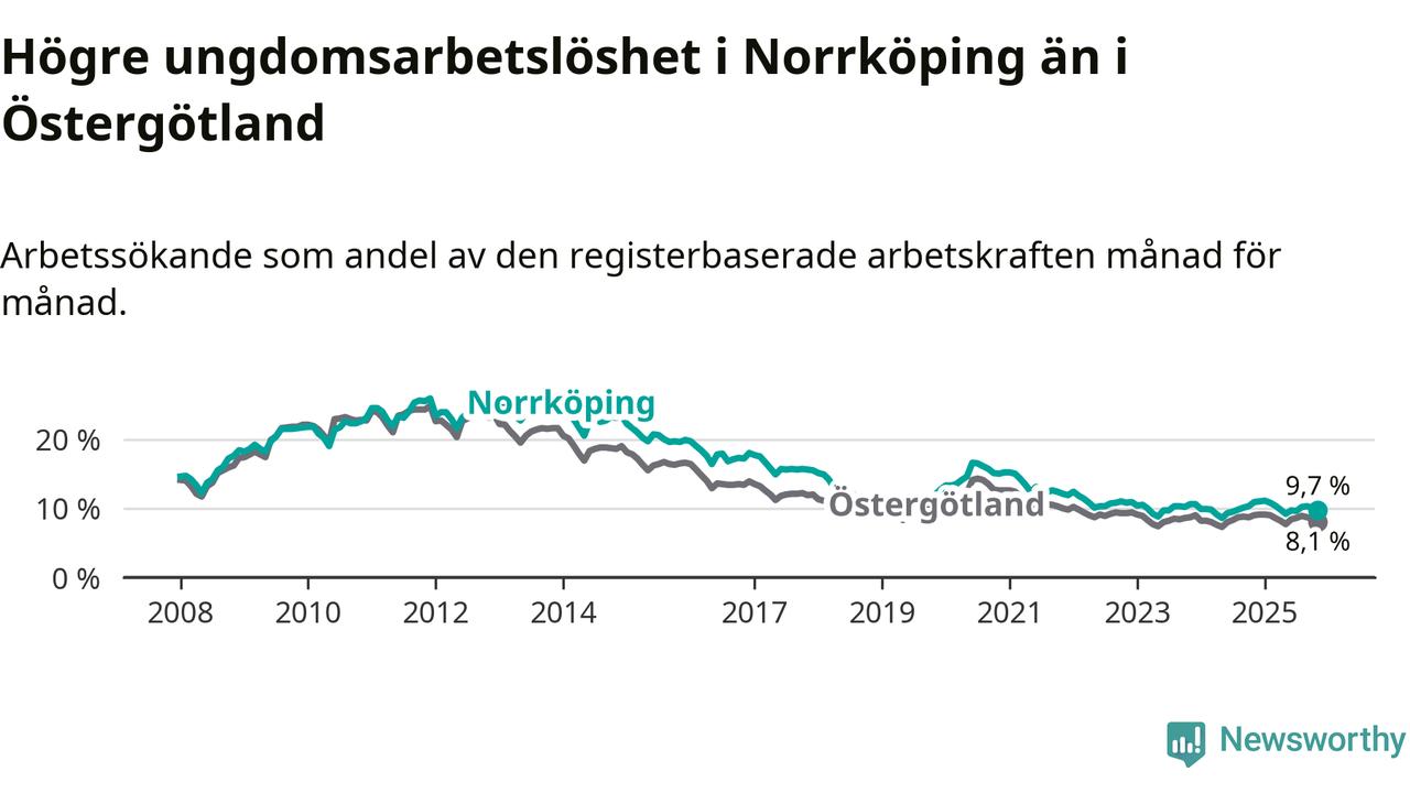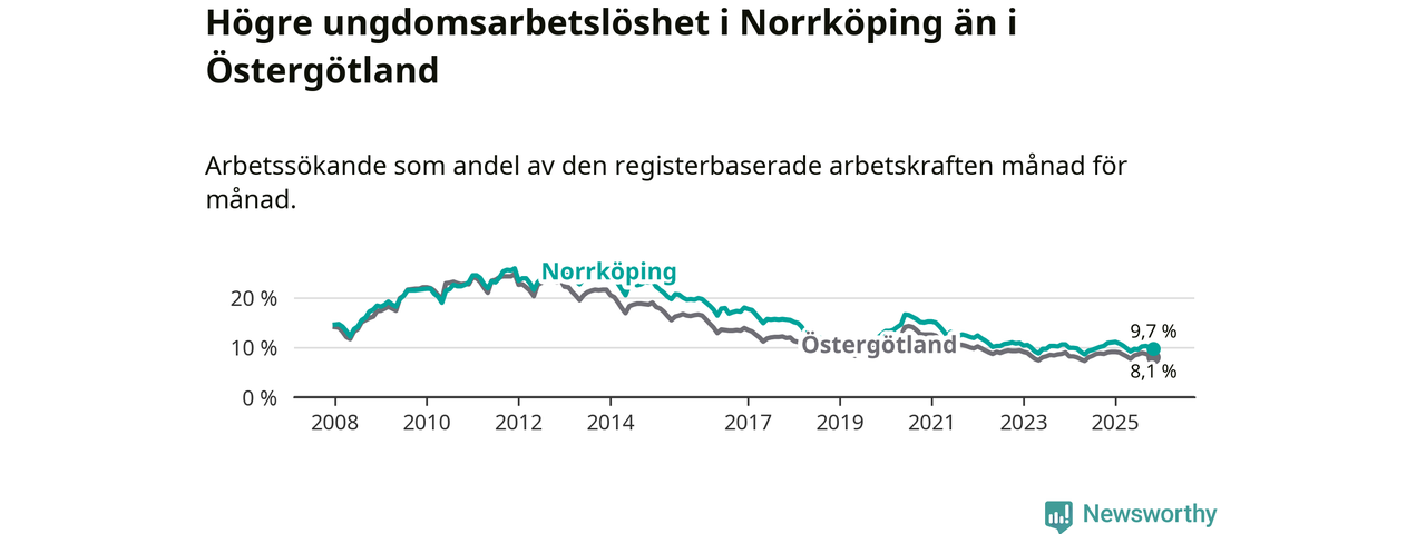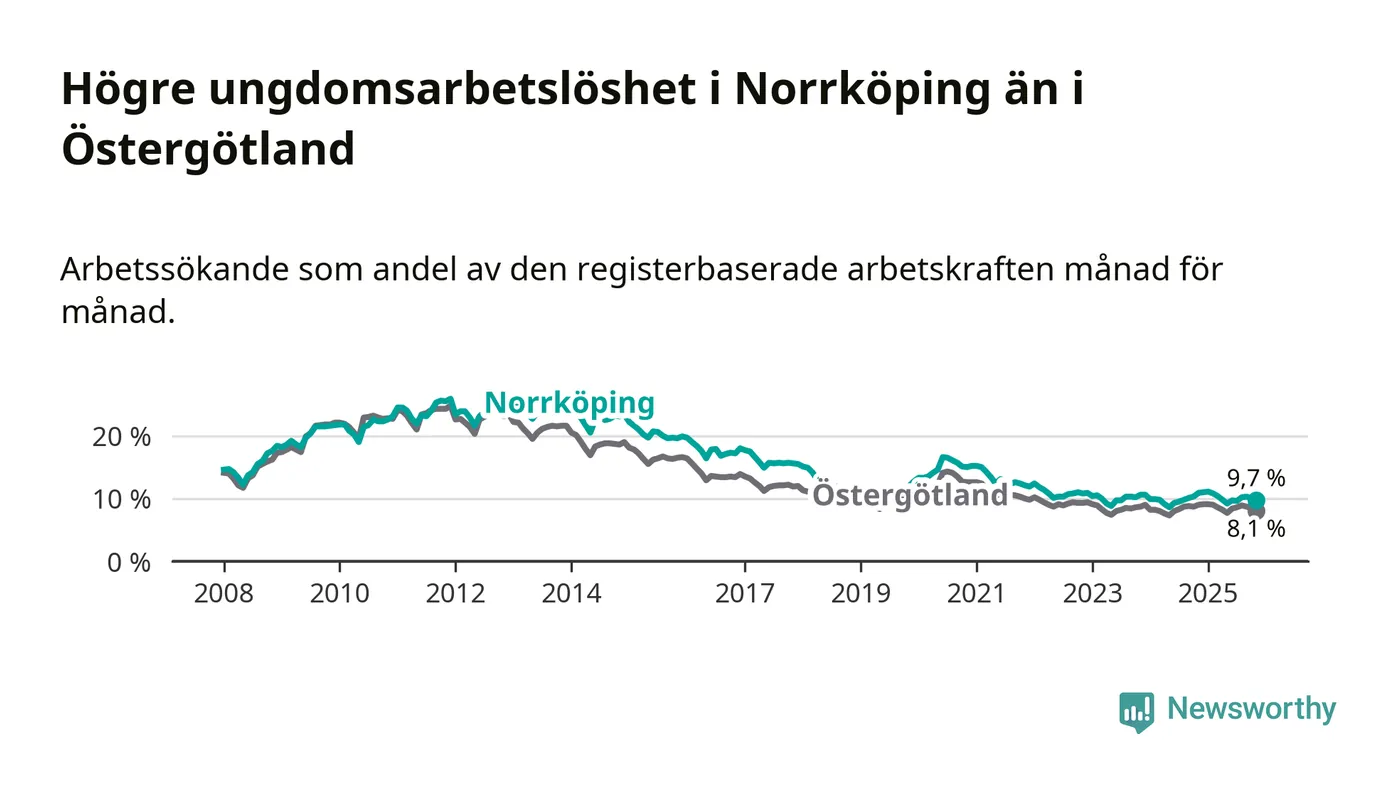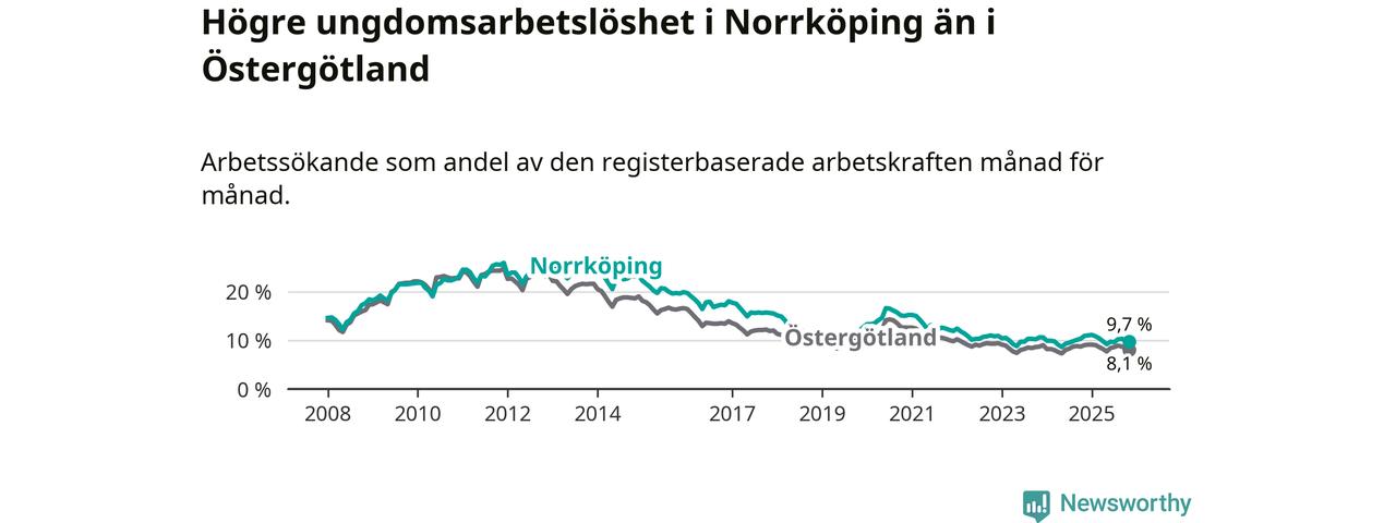 Precis som den totala arbetslösheten ligger ungdomsarbetslösheten i Norrköping högre än i Östergötland som helhet. Skillnaden mellan kommunen och länet är 1,6 procentenheter.