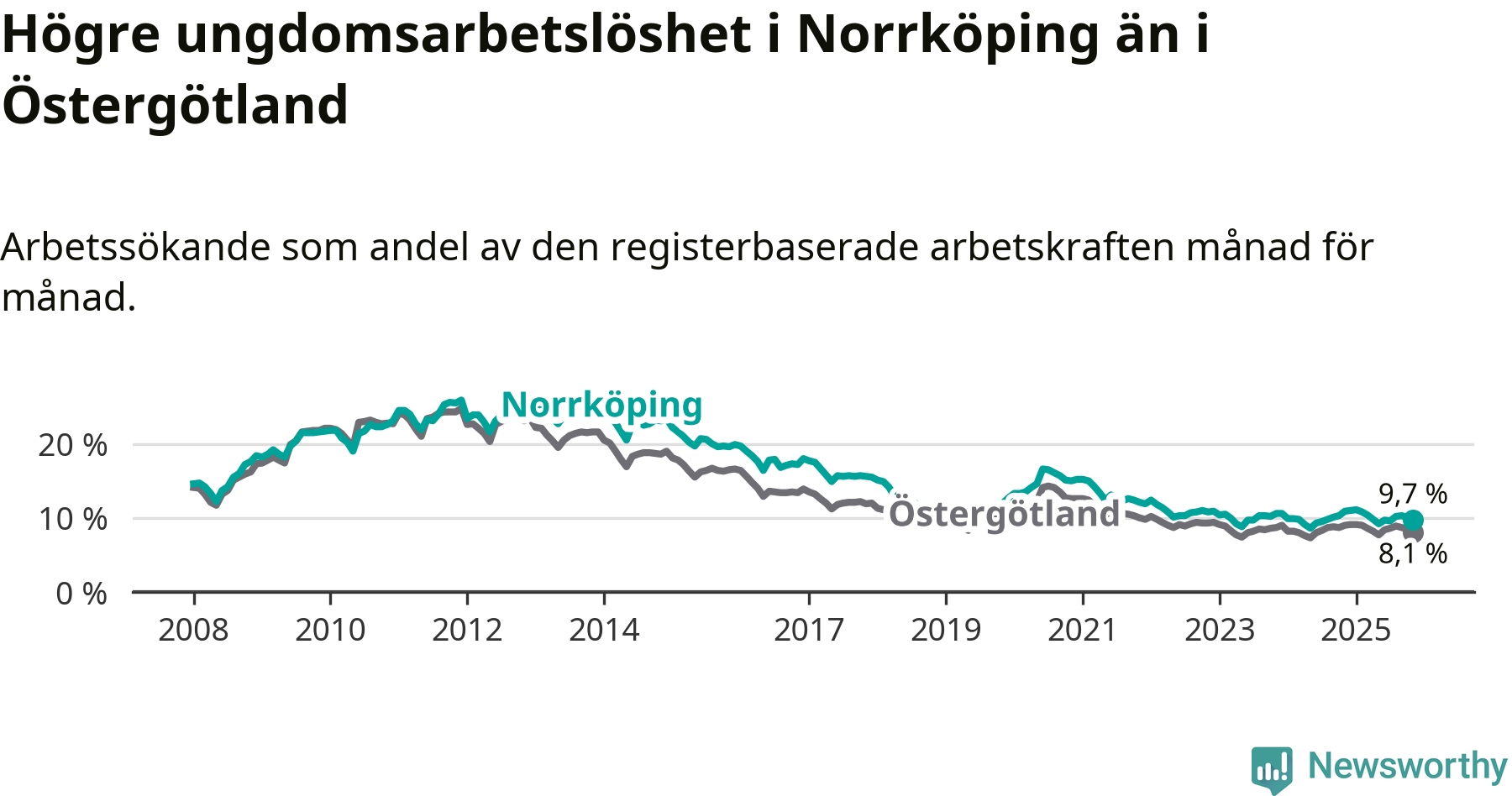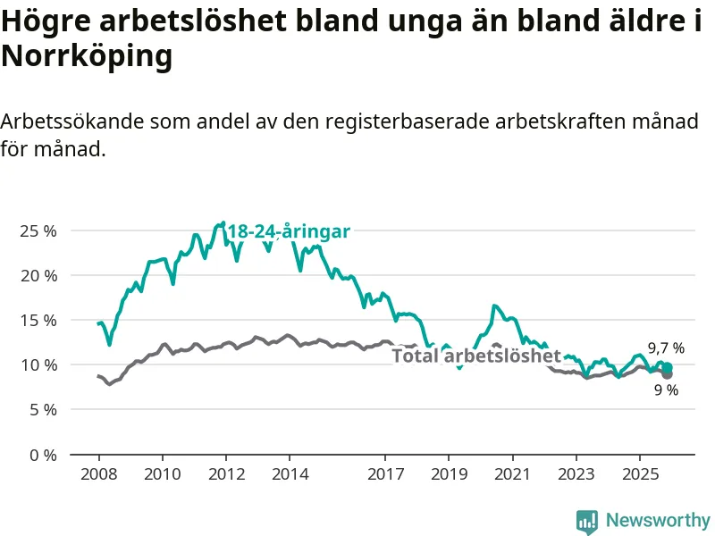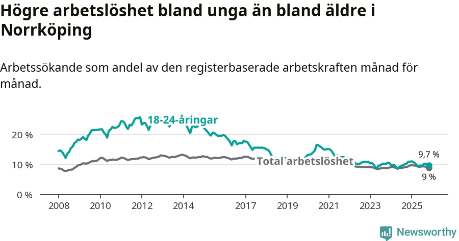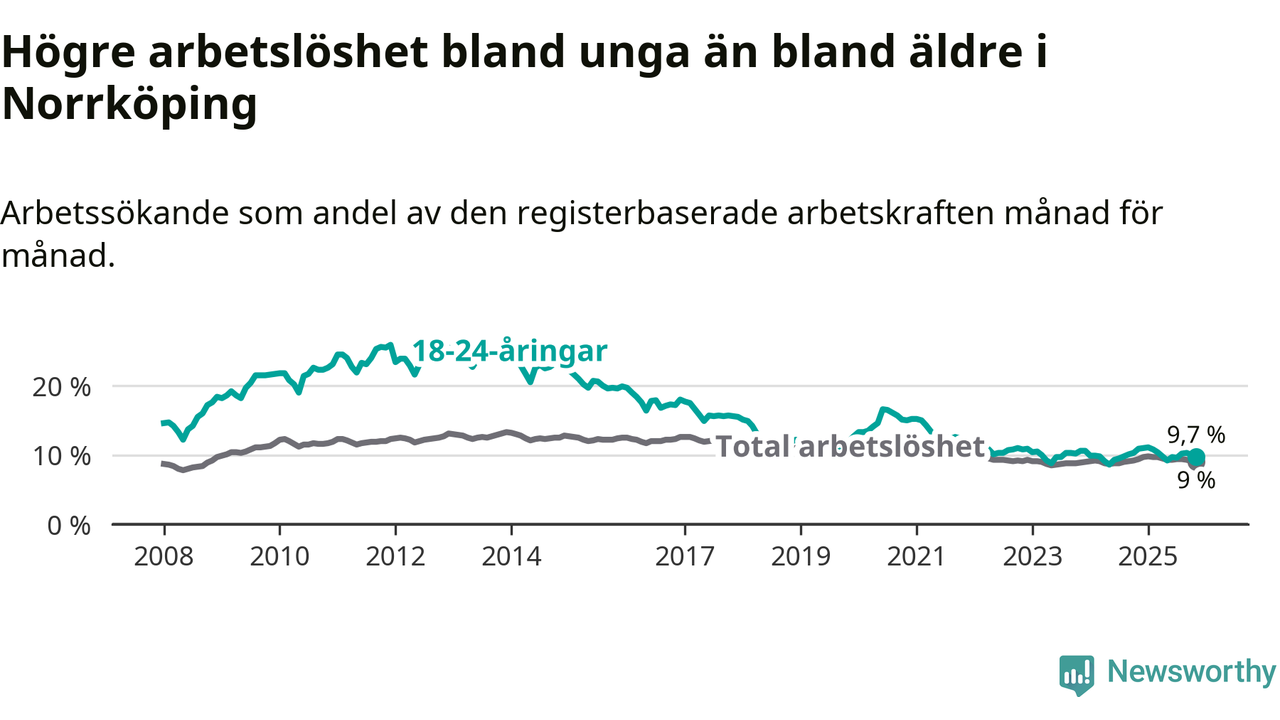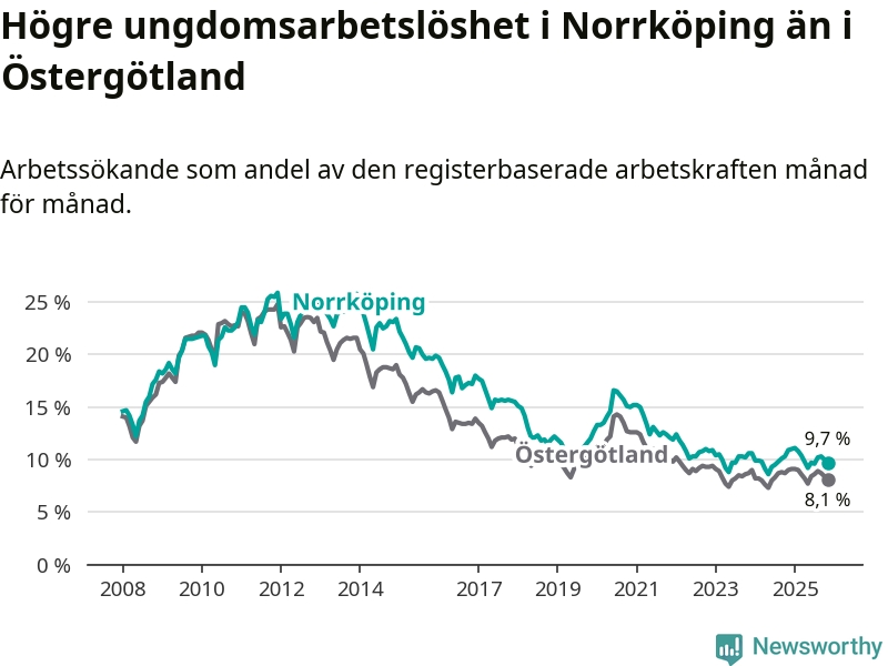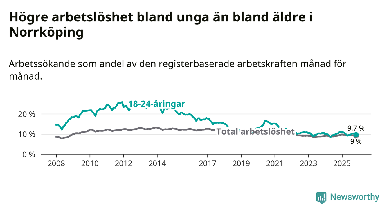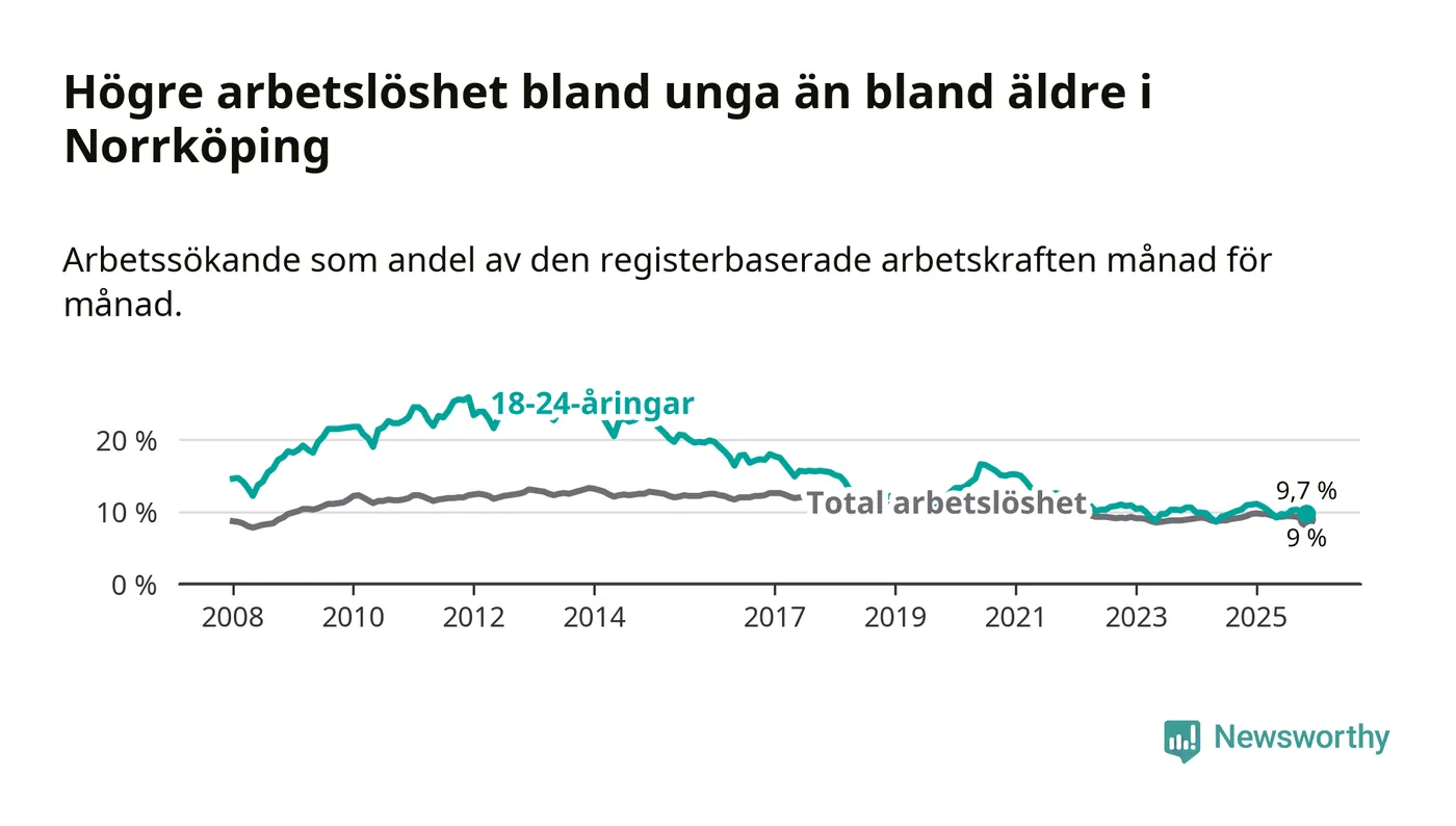 Precis som den totala arbetslösheten ligger ungdomsarbetslösheten i Norrköping högre än i Östergötland som helhet. Skillnaden mellan kommunen och länet är 1,6 procentenheter.