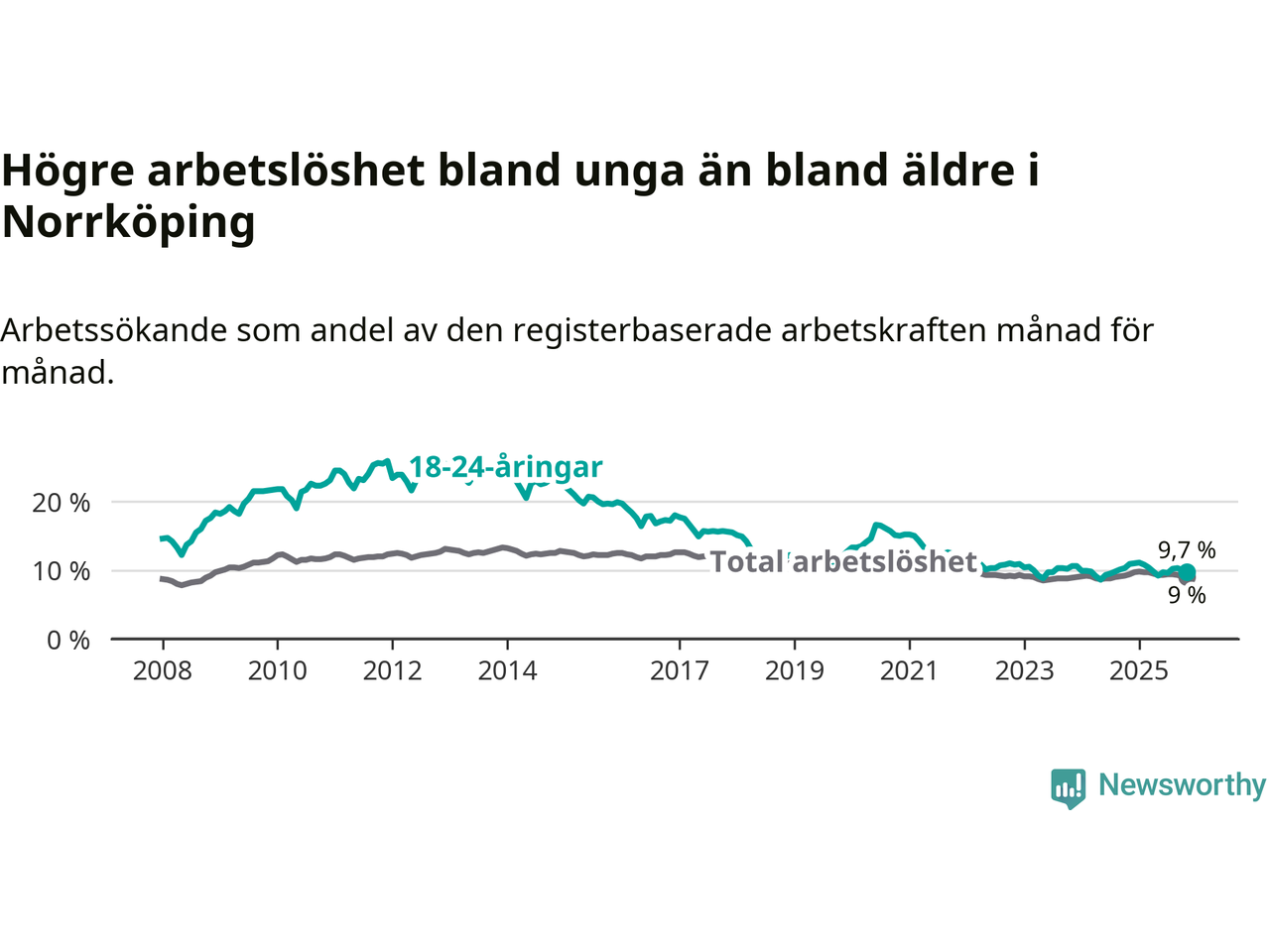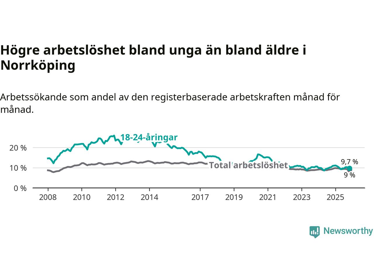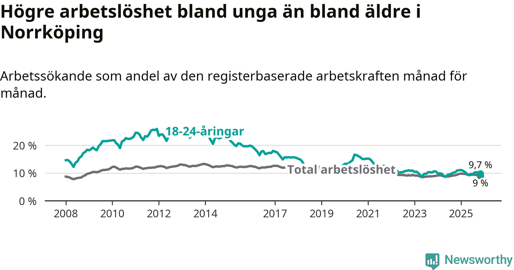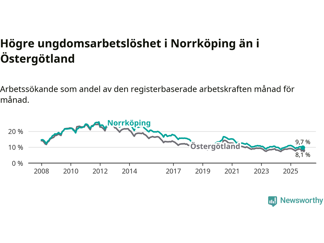 Precis som den totala arbetslösheten ligger ungdomsarbetslösheten i Norrköping högre än i Östergötland som helhet. Skillnaden mellan kommunen och länet är 1,6 procentenheter.
