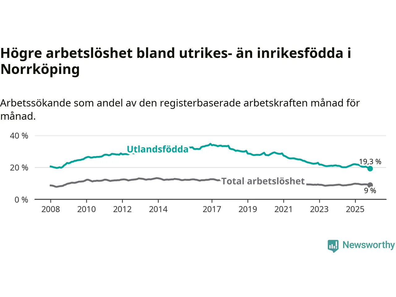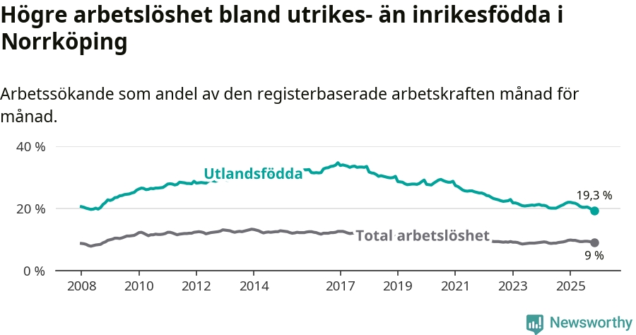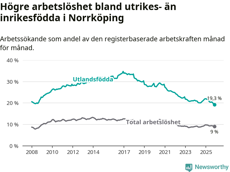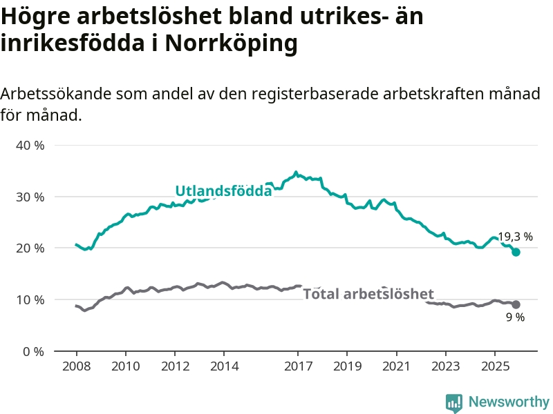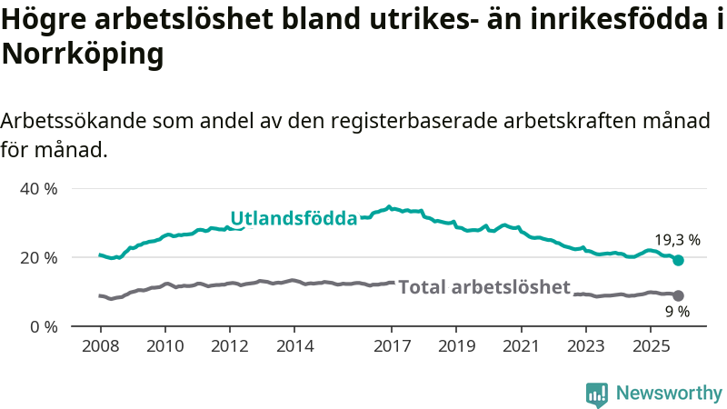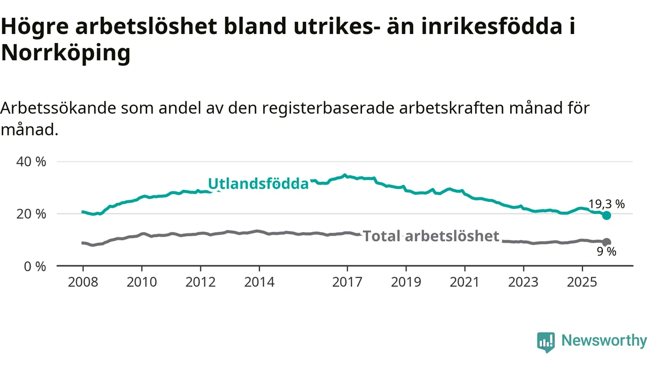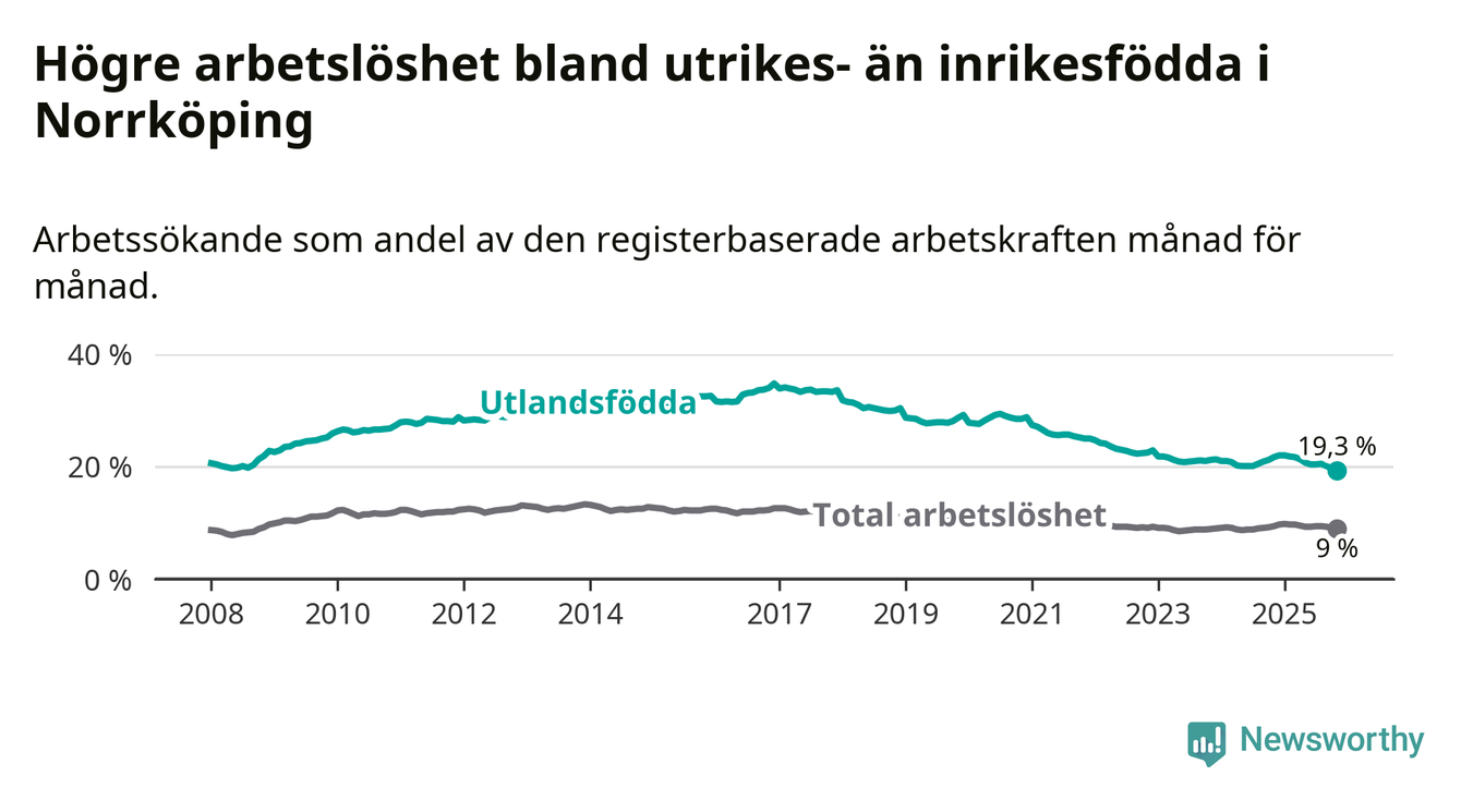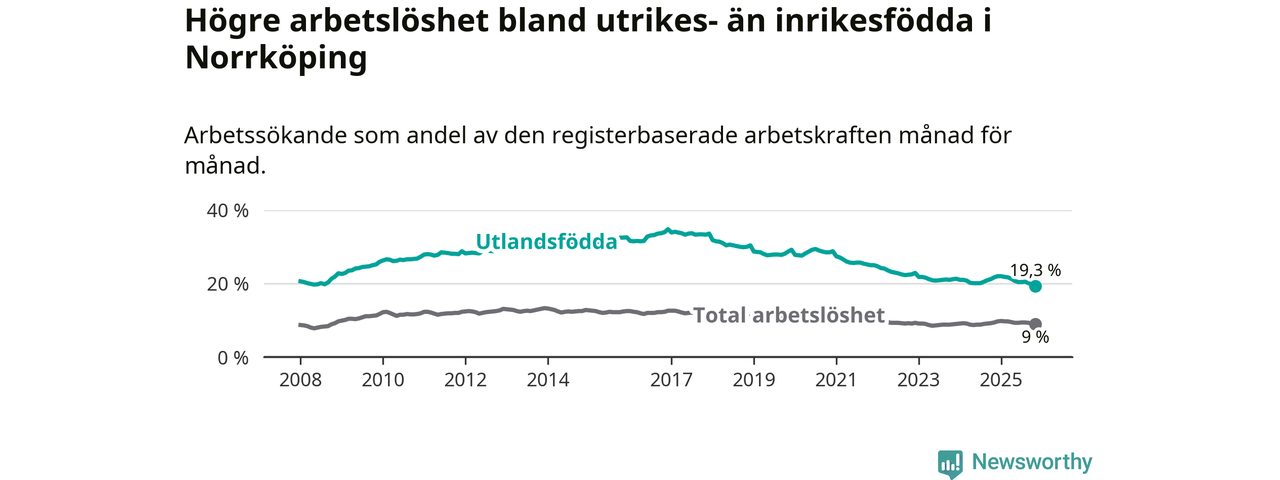 Skillnaden i arbetslöshet mellan utrikesfödda och hela befolkningen är 10,3 procentenheter i Norrköping. Det är en betydligt mindre skillnad än för ett år sedan (−2,0 procentenheter).