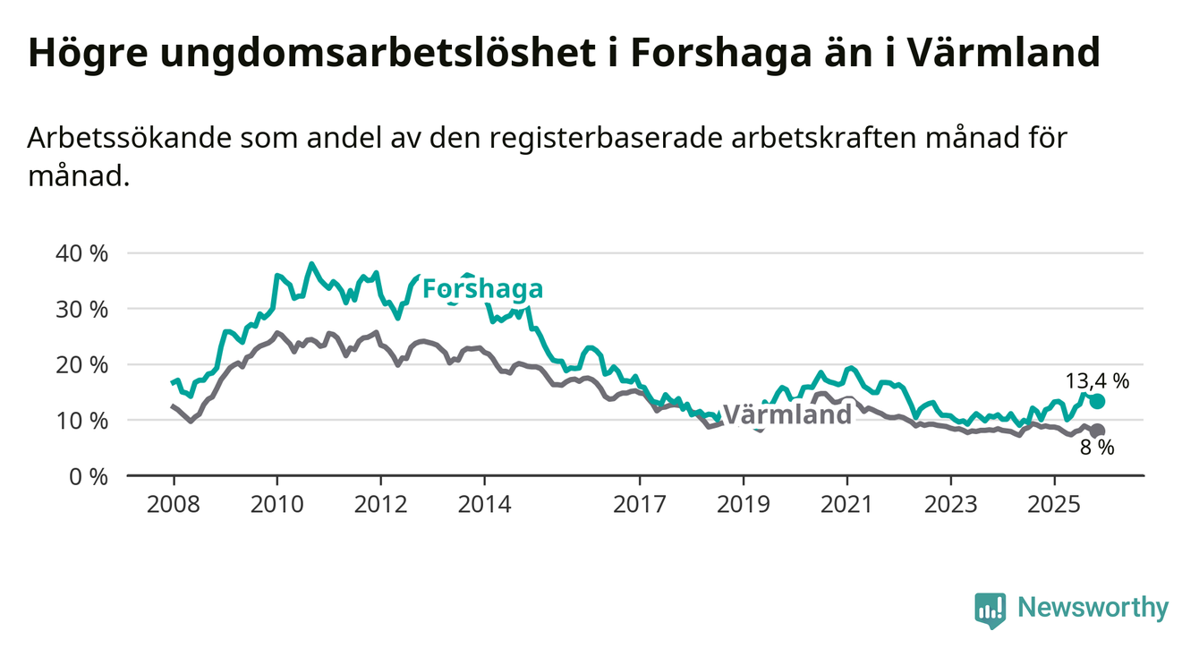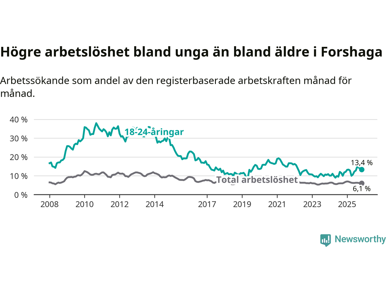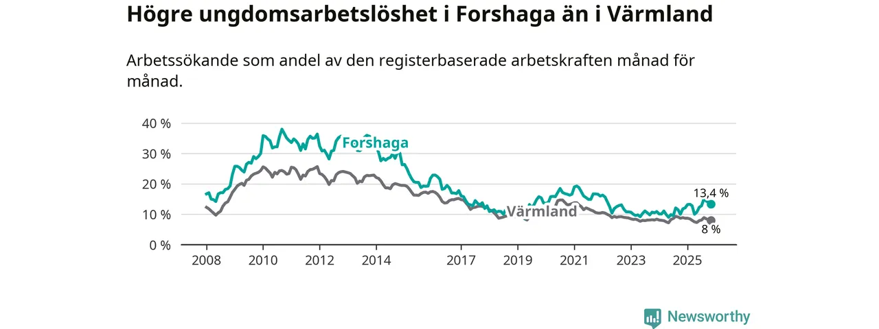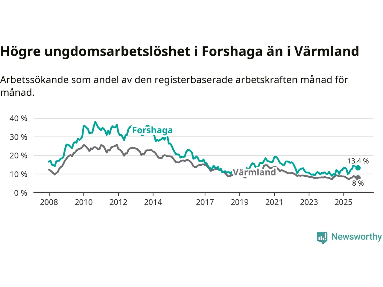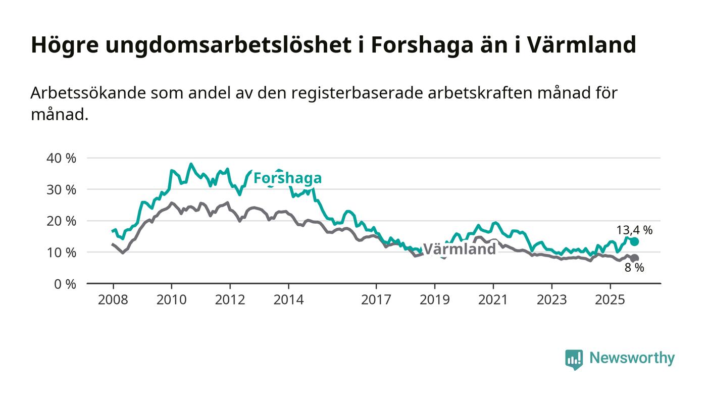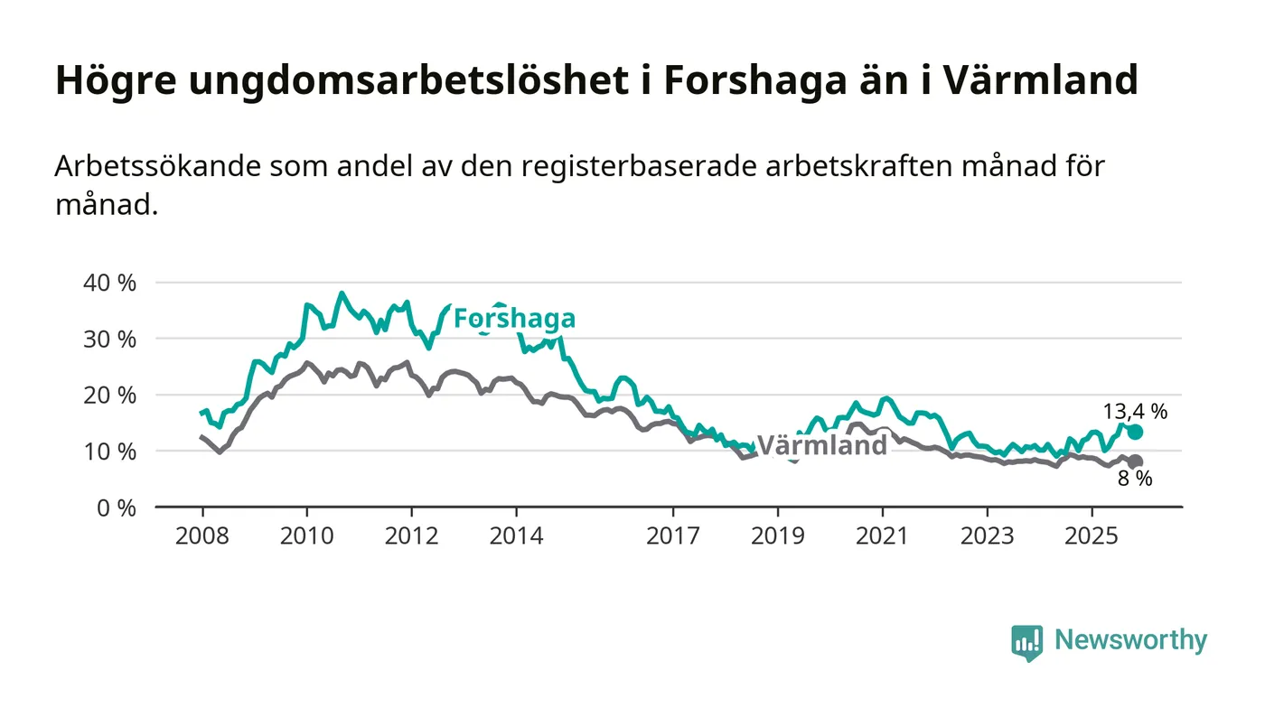 I och med den senaste månadens uppgång har de ungas arbetslöshet i Forshaga stigit 13 månader i följd (upp från 10,0 procent i oktober 2024 till 13,4 procent nu).