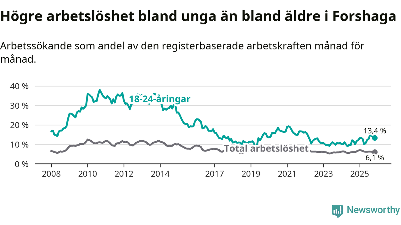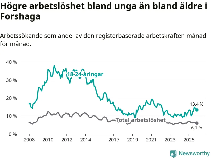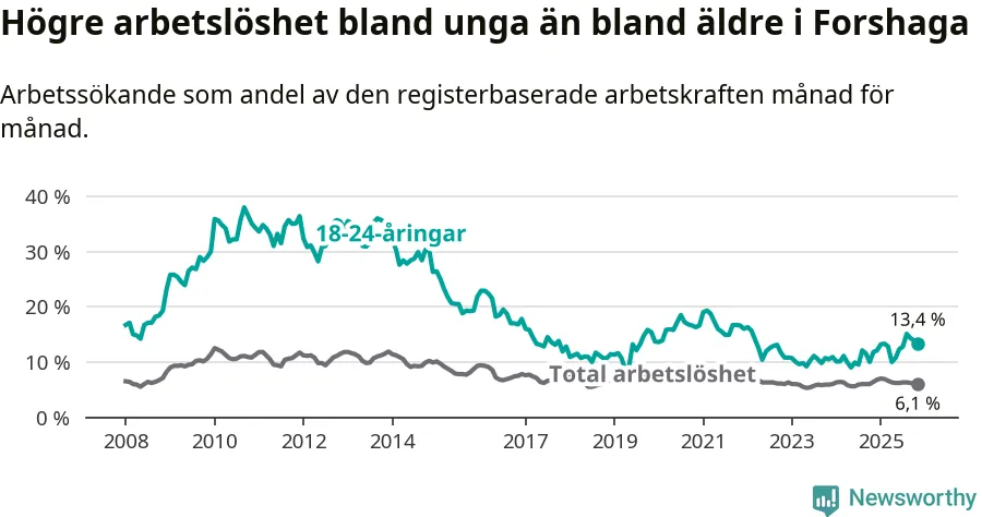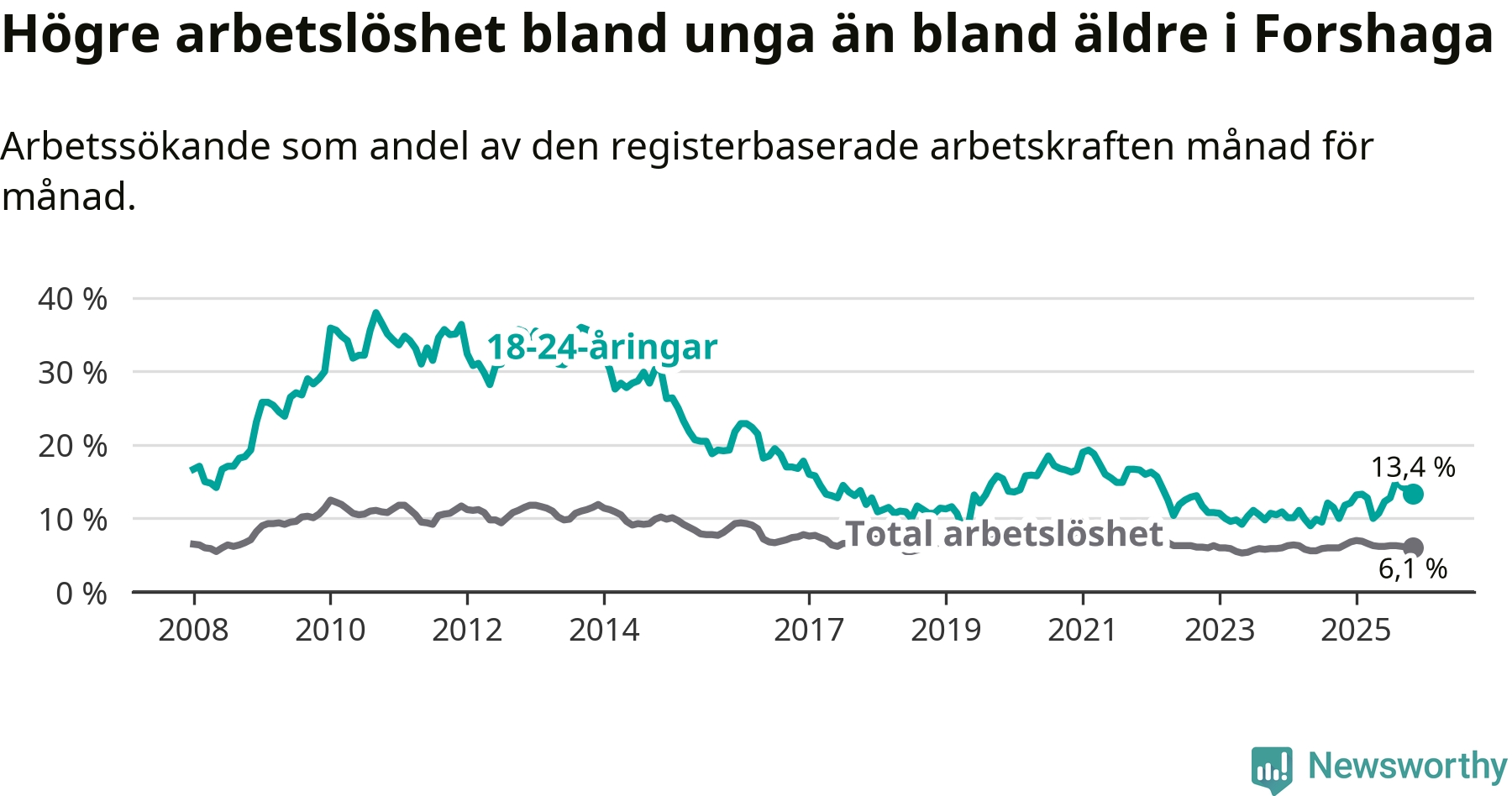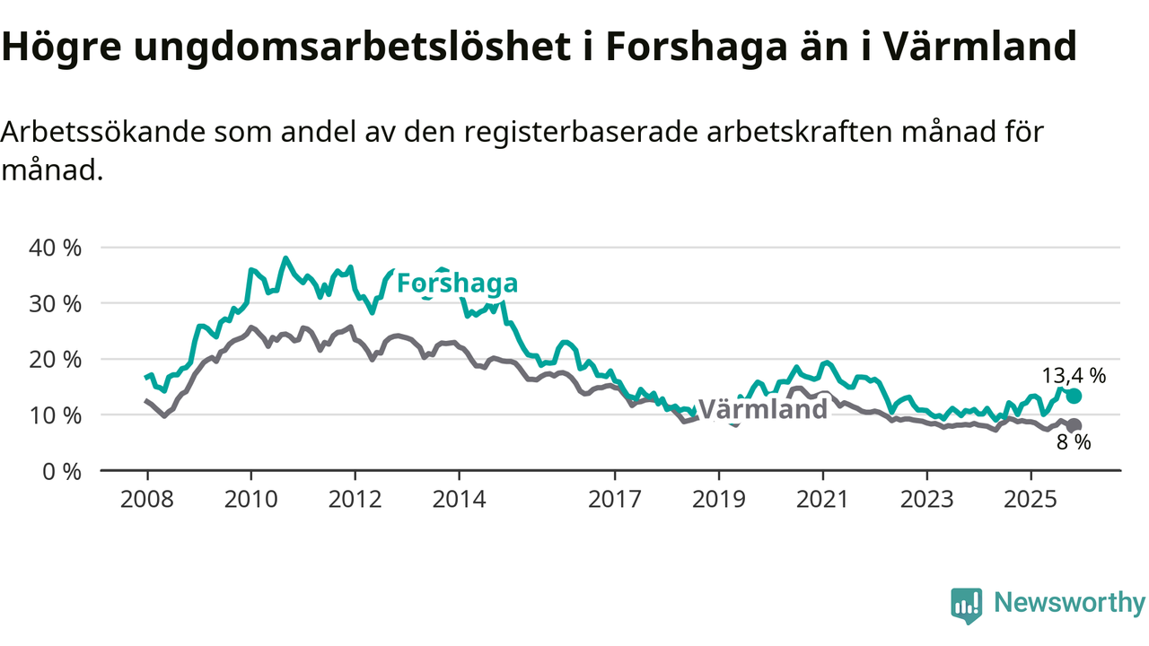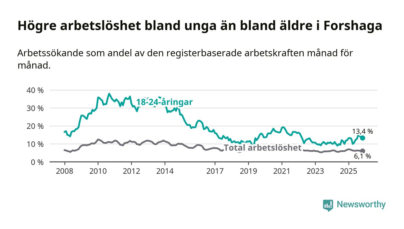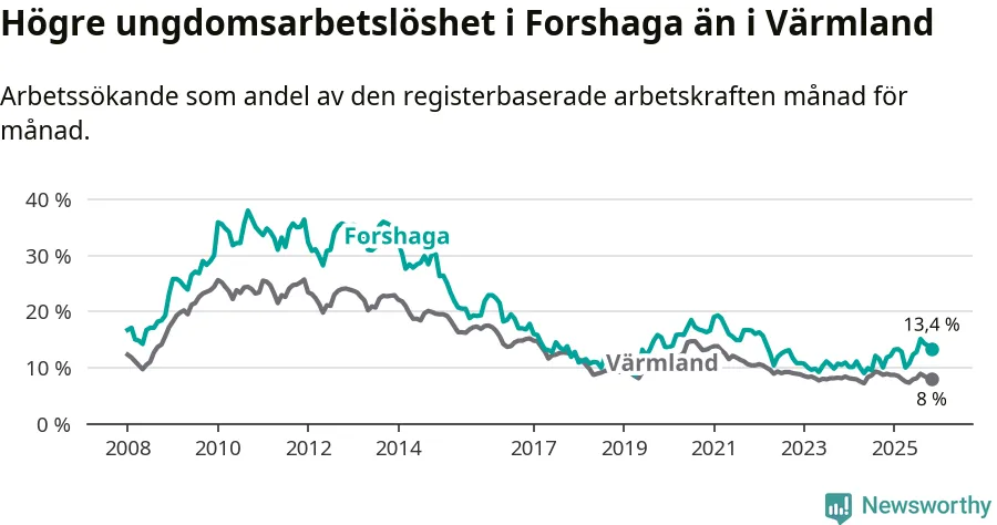 I och med den senaste månadens uppgång har de ungas arbetslöshet i Forshaga stigit 13 månader i följd (upp från 10,0 procent i oktober 2024 till 13,4 procent nu).