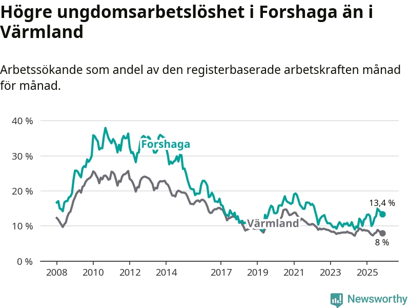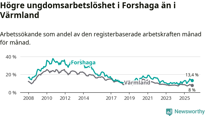 Precis som den totala arbetslösheten ligger ungdomsarbetslösheten i Forshaga högre än i Värmland som helhet. Skillnaden mellan kommunen och länet är 5,4 procentenheter.