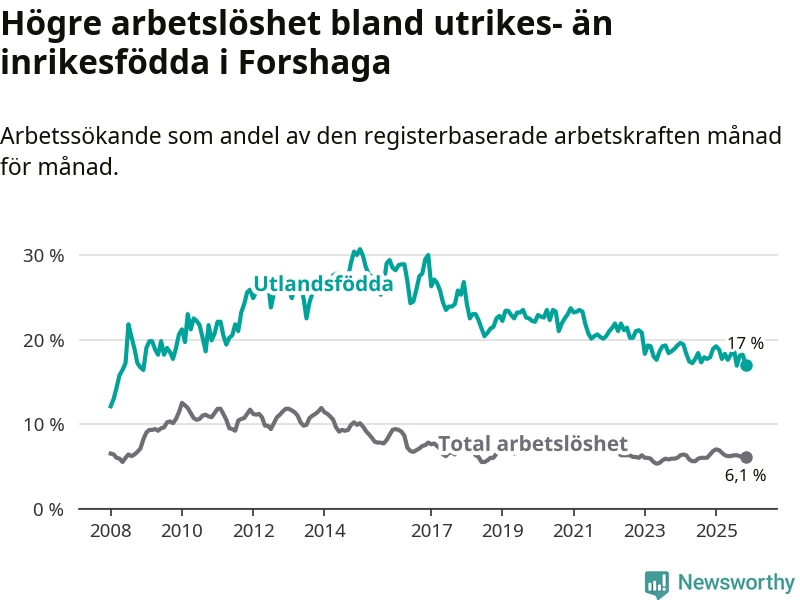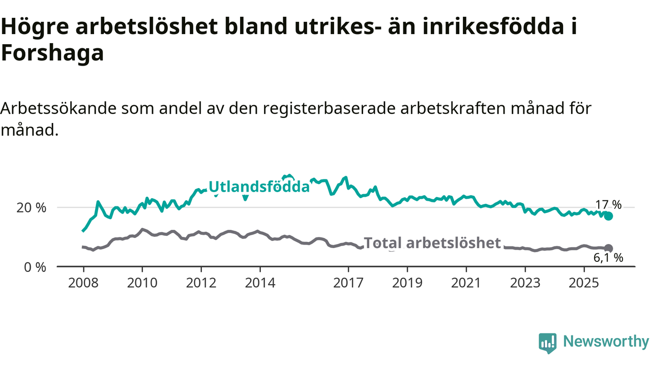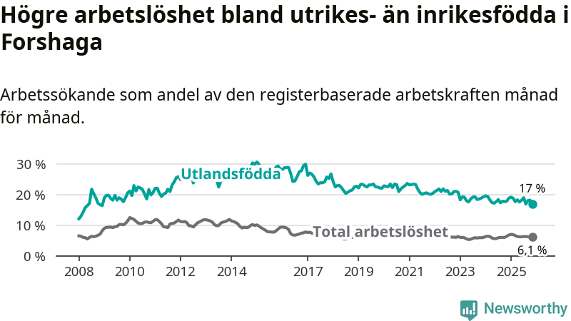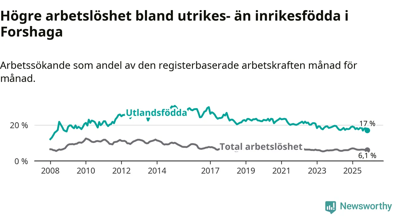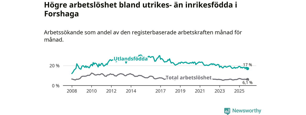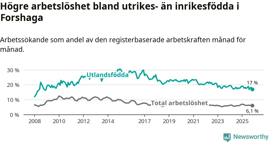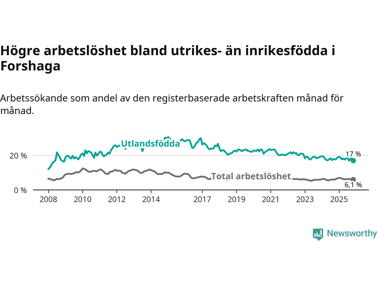 Arbetslösheten bland utlandsfödda var 17,0 procent i Forshaga under november månad, motsvarande 94 av 553 personer. Det är 0,9 procentenheter färre än vid samma tidpunkt i fjol (−8 om man räknar personer). Den senaste månadens nedgång innebär ett trendbrott. Under de två föregående månaderna hade arbetslösheten bland utlandsfödda varit högre än motsvarande tidpunkt året innan.