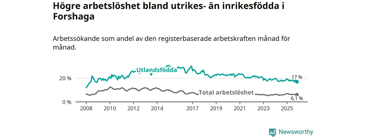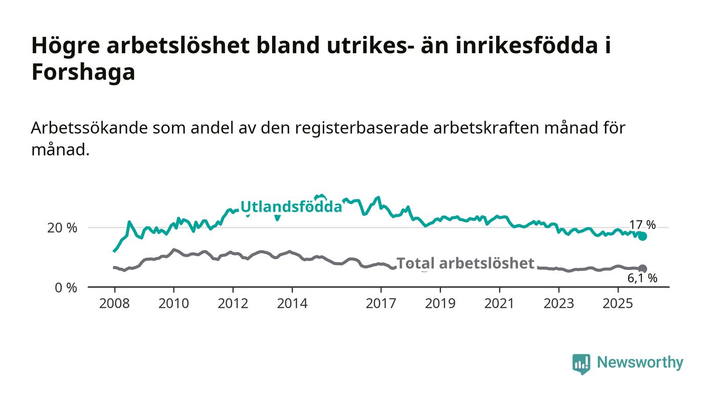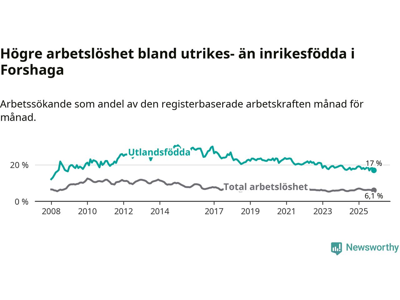 Skillnaden i arbetslöshet mellan utrikesfödda och hela befolkningen är 10,9 procentenheter i Forshaga. Det är en mindre skillnad än för ett år sedan (−0,6 procentenheter).
